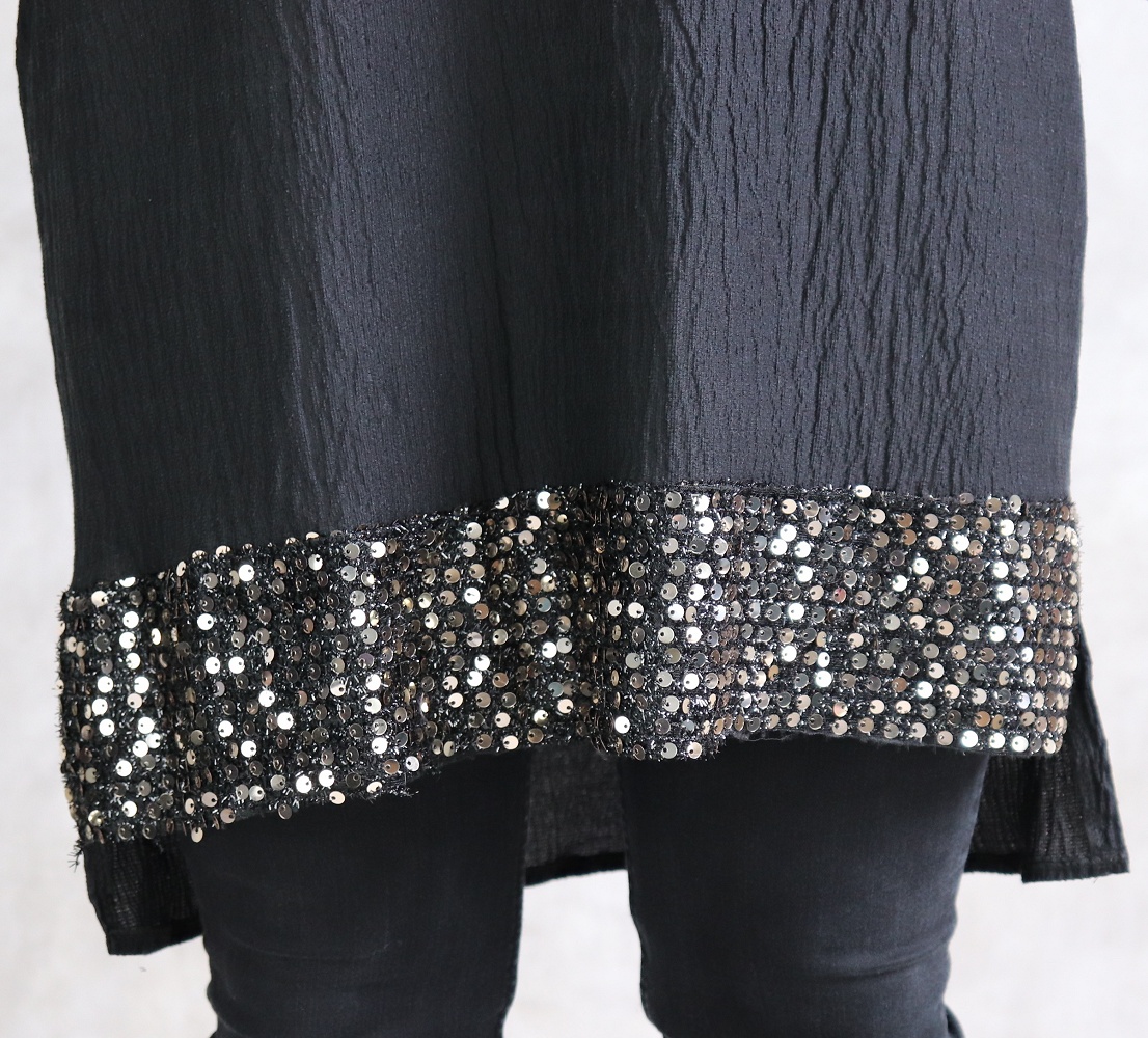 Tunique longue, col arrondi, strass sur les manches ainsi que sur le bas, tissu effet crêpe, coupe ample.