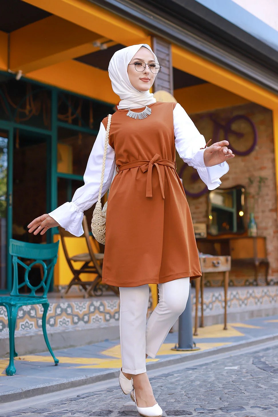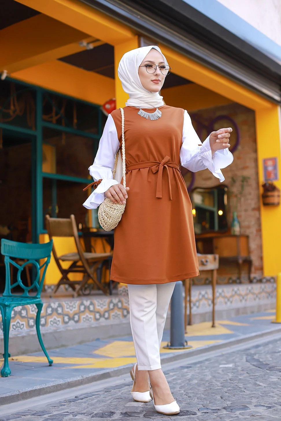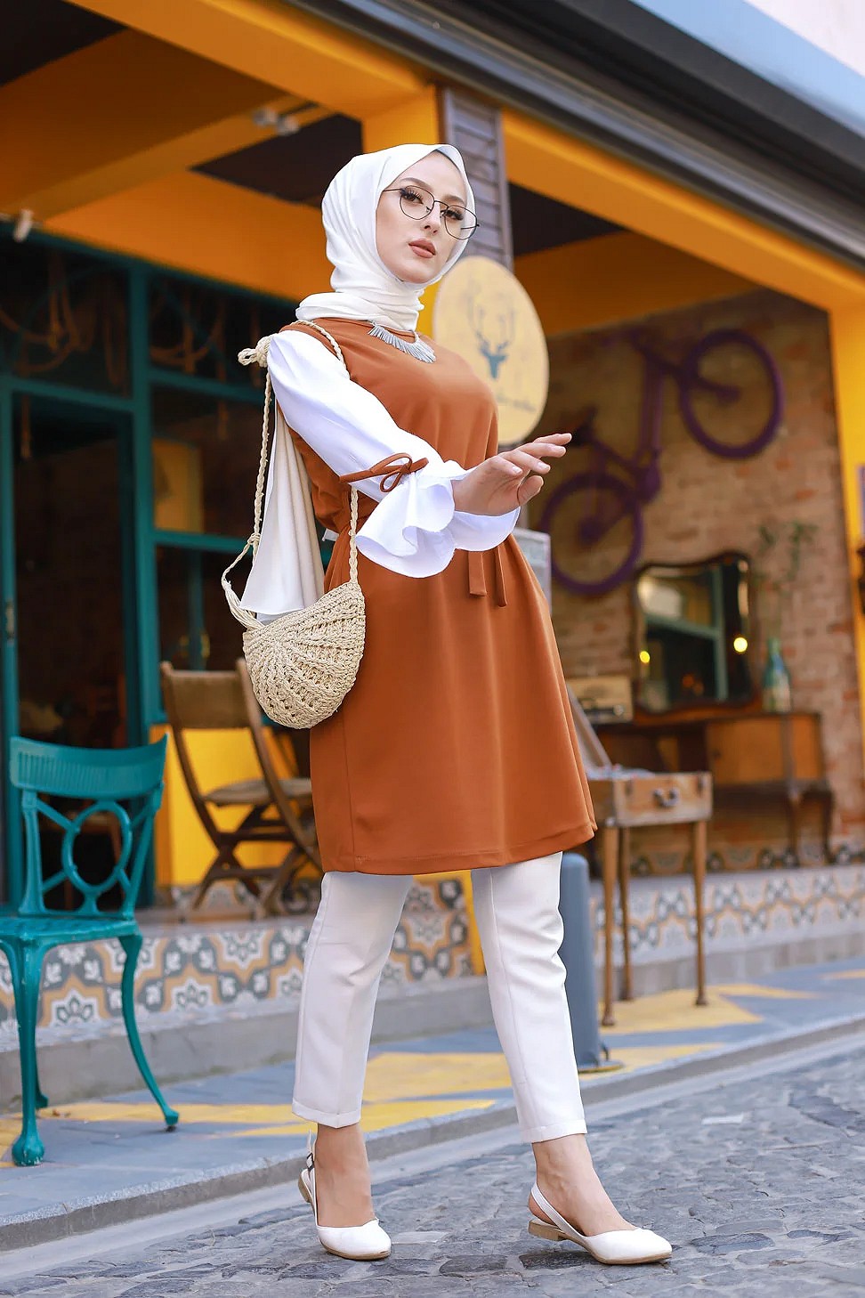 Tunique à volant (Vêtement pudique en ligne pour femme voilée) - Couleur rouille et blanc Vetement & Accessoire