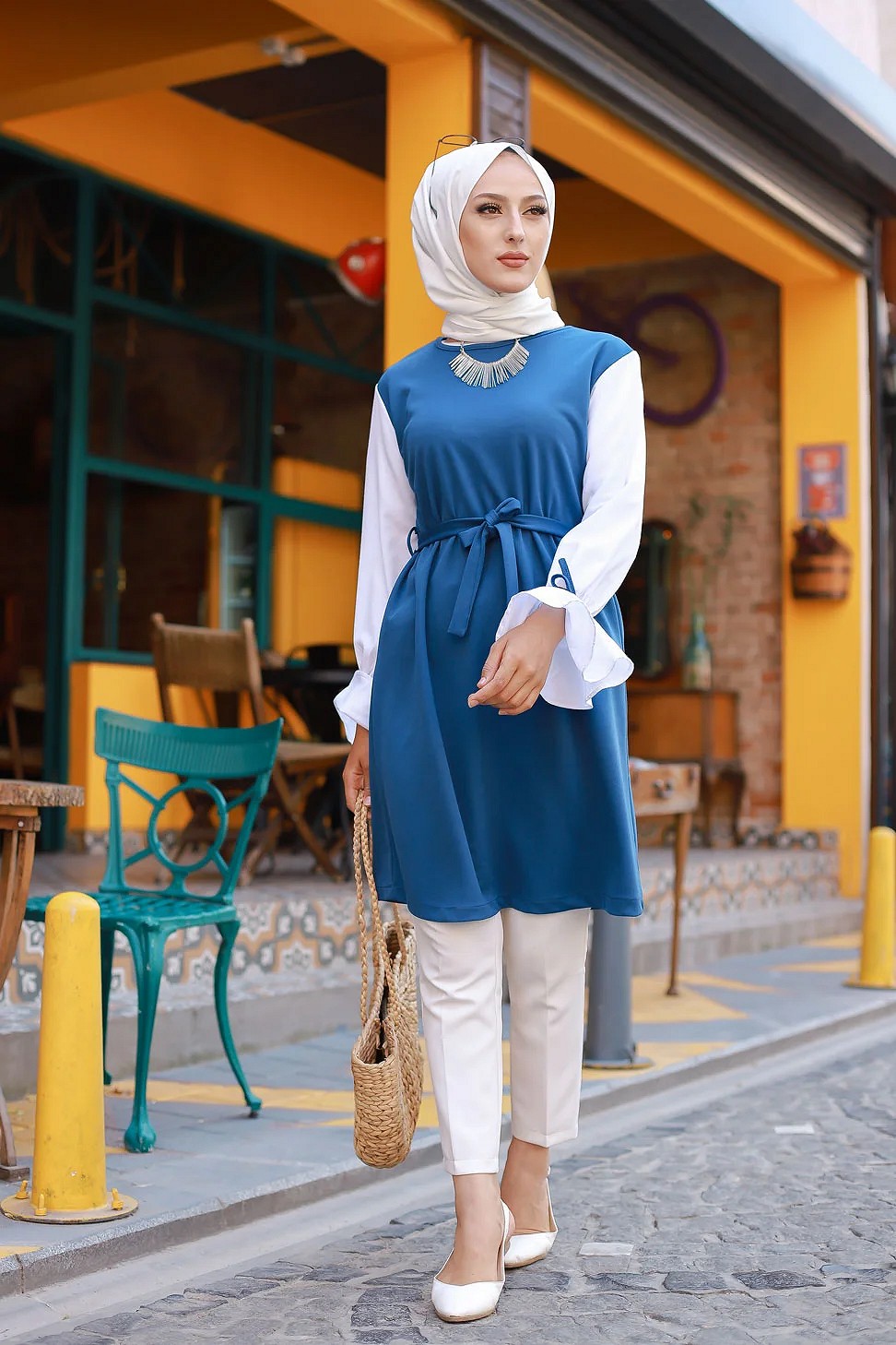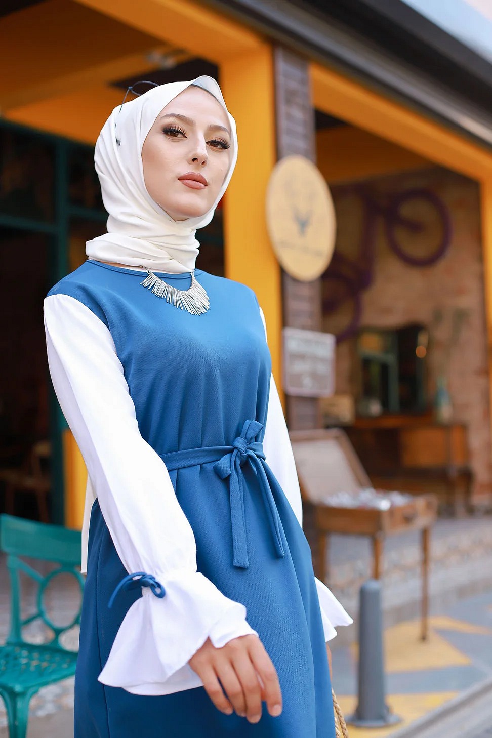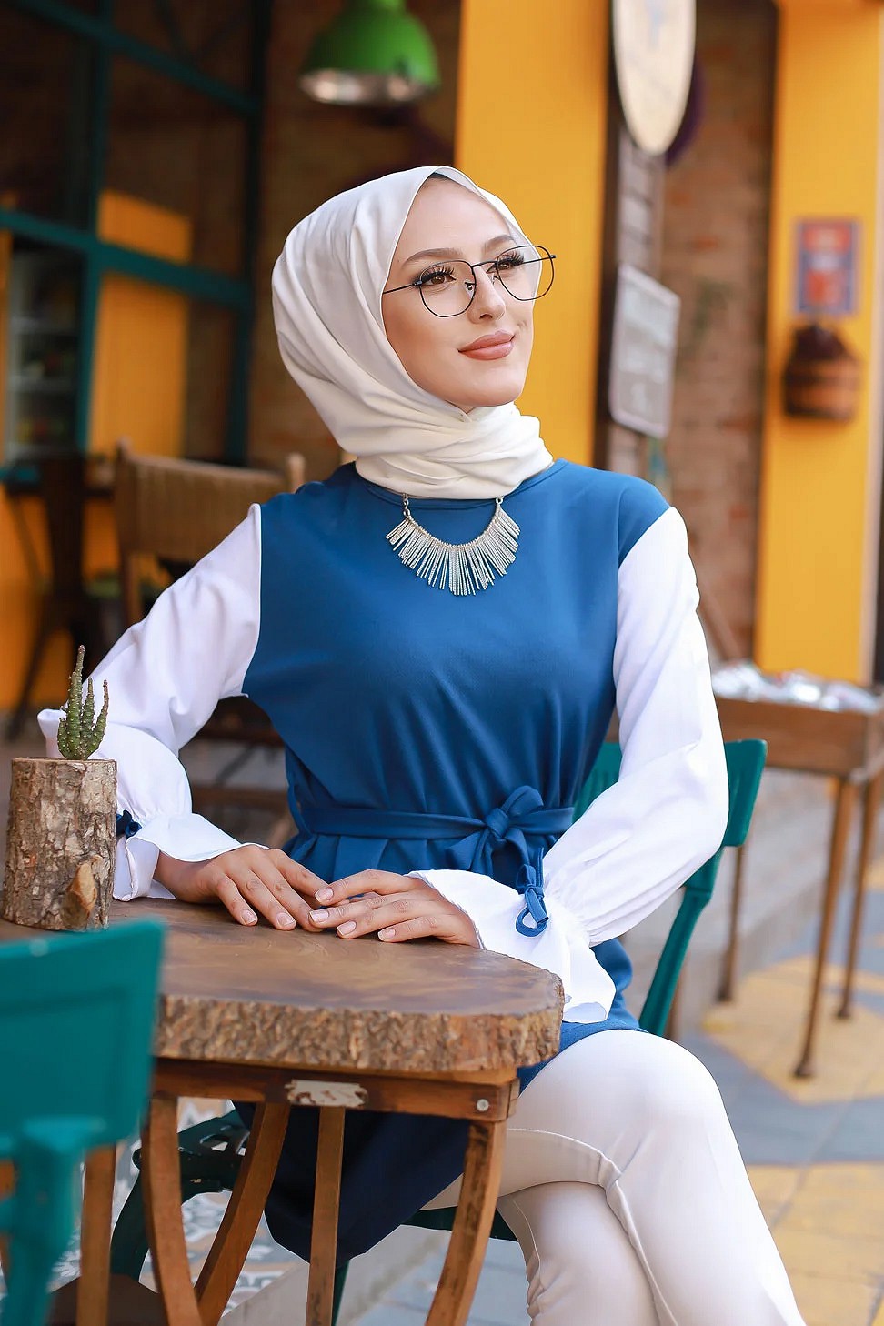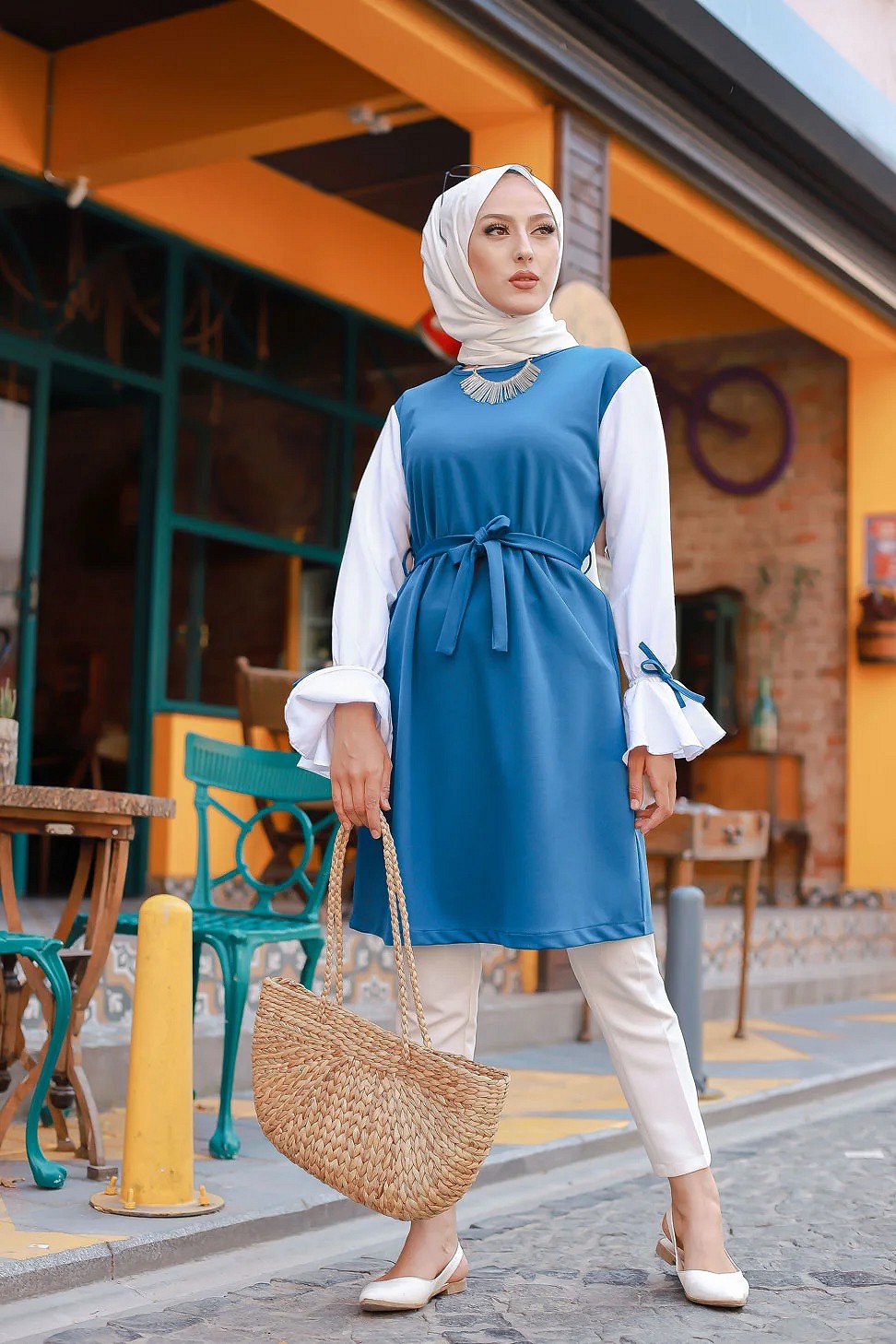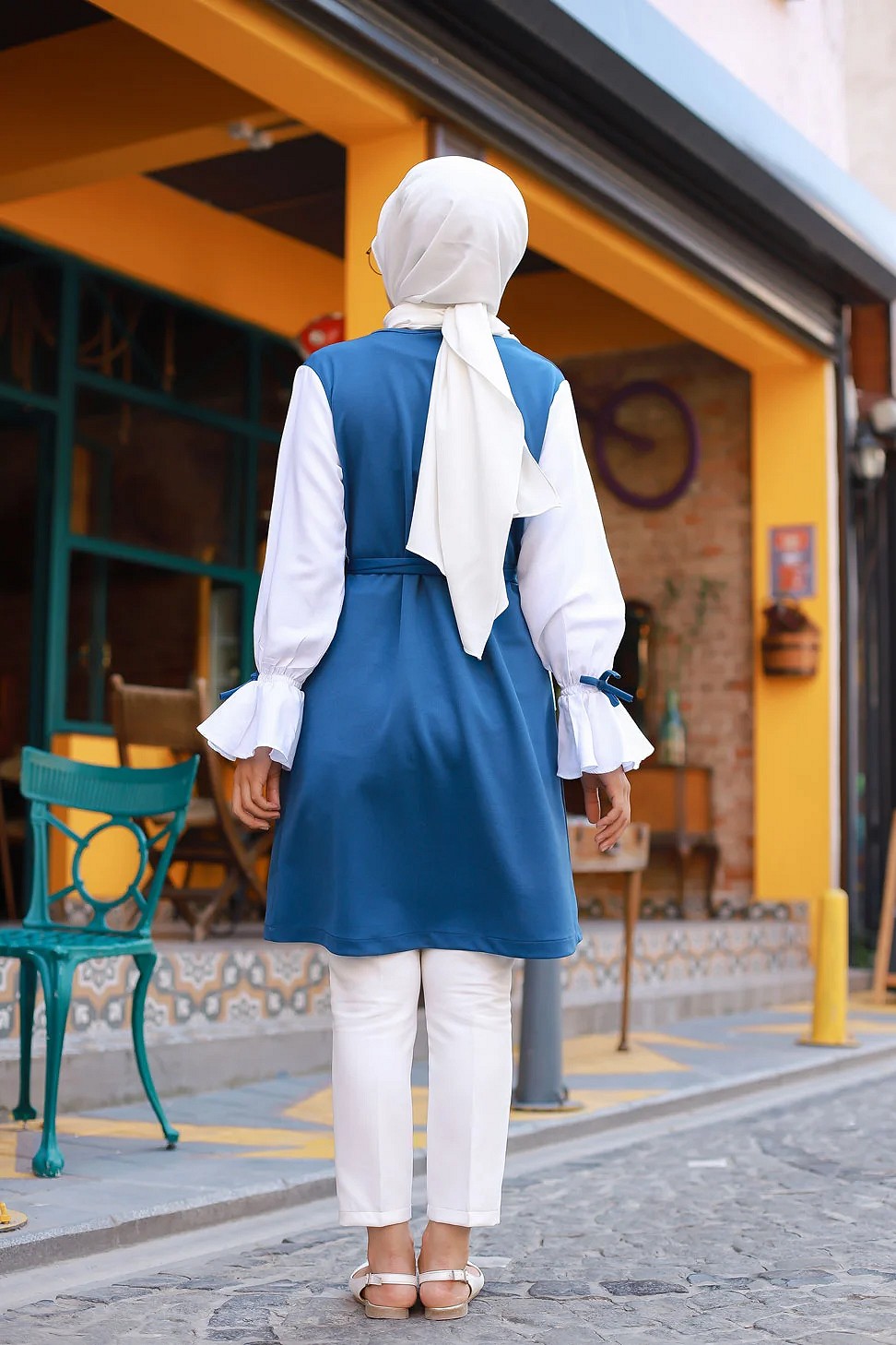 Tunique à volants (Vetement et hijab en ligne pour femme voilée) - Couleur bleu indigo et blanc Vetement & Accessoire