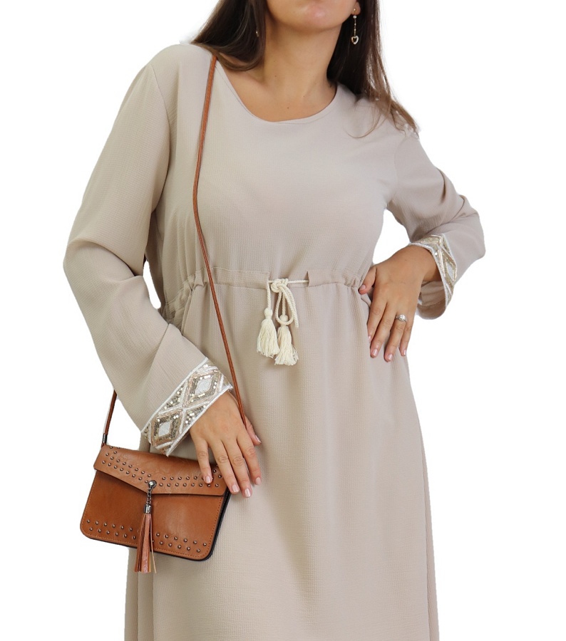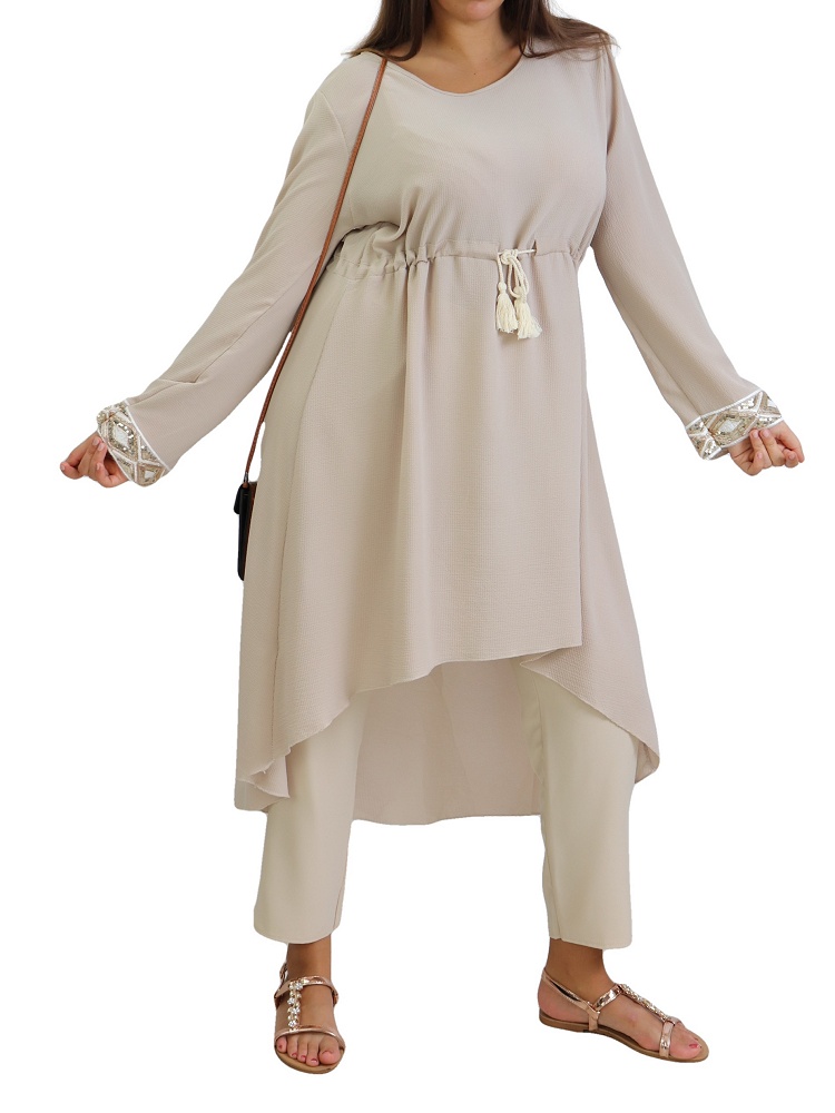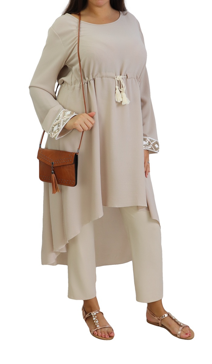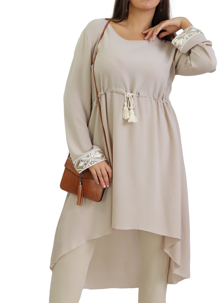 Tunique ample et originale pour femme avec cordon a pompons et strass sur les manches - Couleur Beige