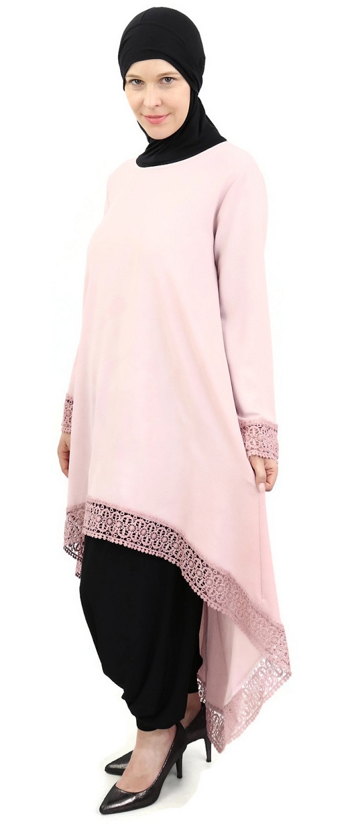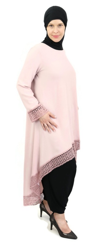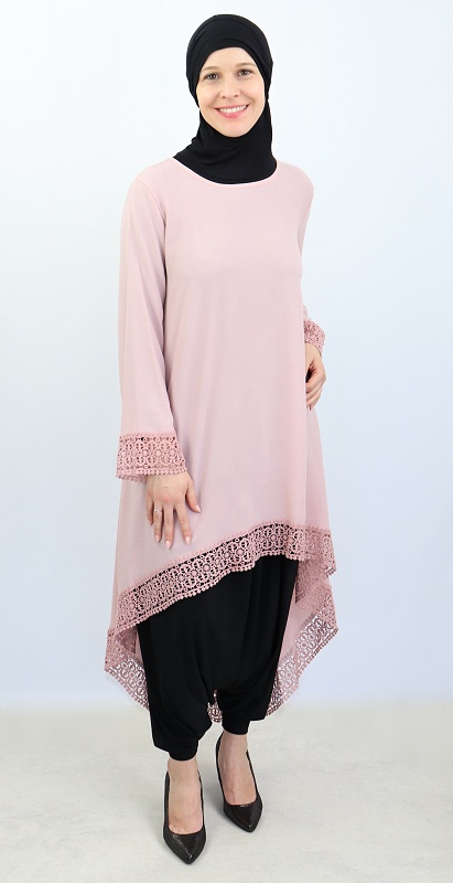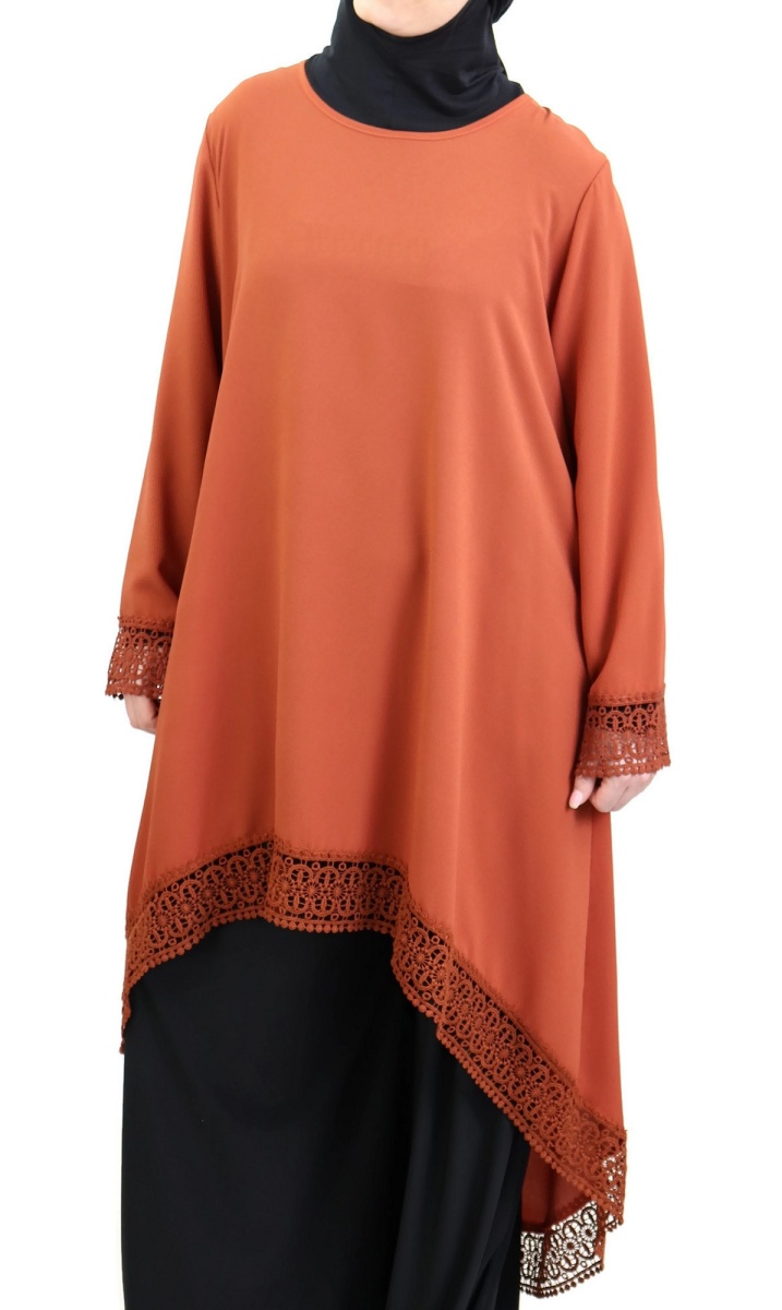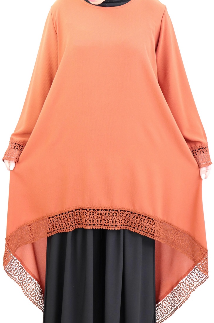 Tunique ample et évasée, tissu léger de type crêpe, coupe un peu plus longue à l'arrière et pour finir dentelle sur les poignets et le bas.
