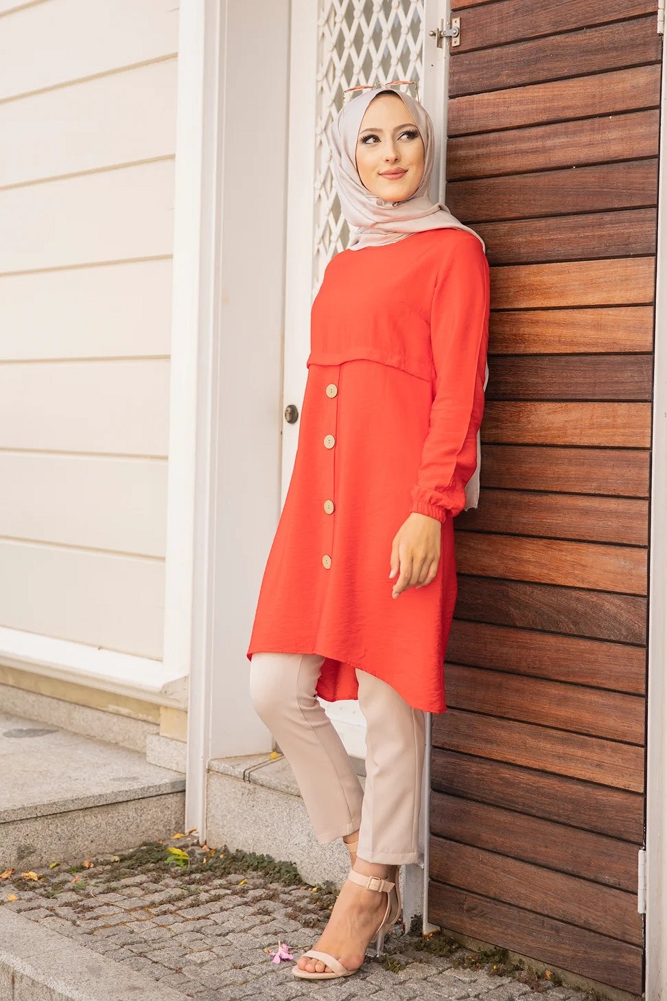 Tunique en dentelle à la taille (Vêtement femme Hijab moderne) - Couleur brique - REF. 36241 (28.00 €)