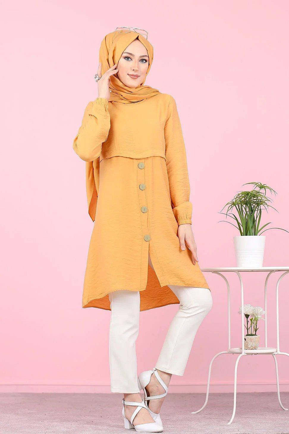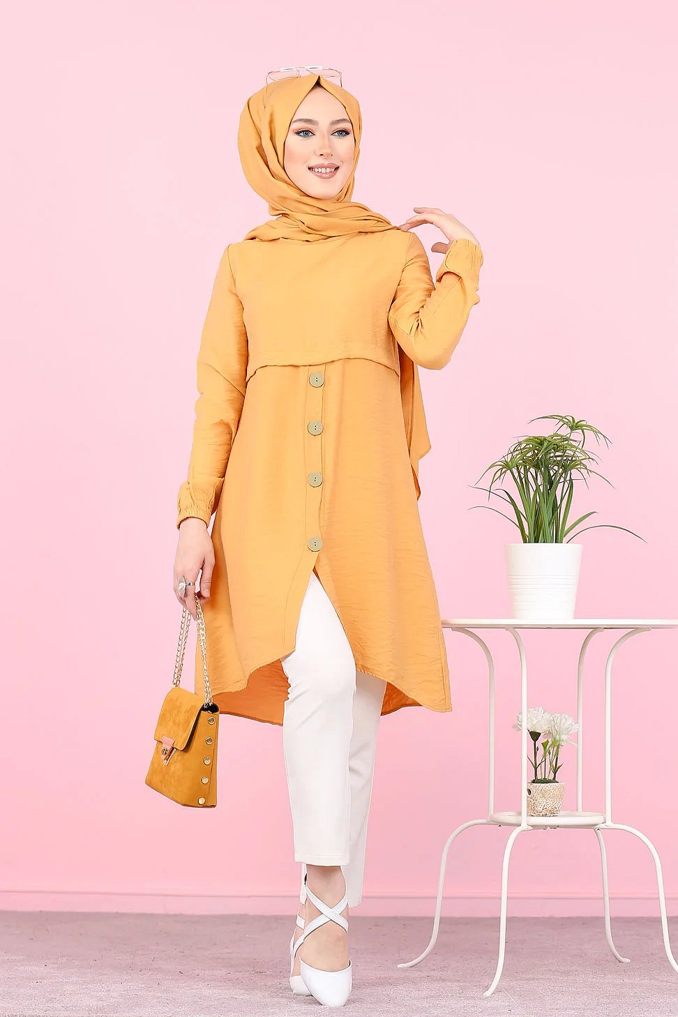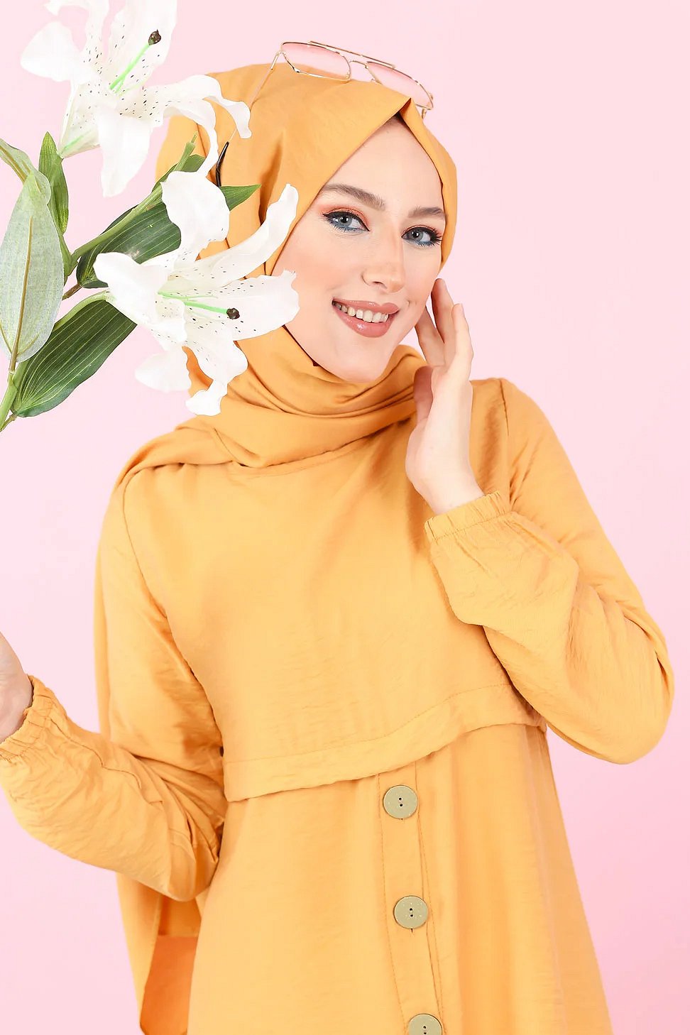 Tunique ample evasee boutonnee pour femme (Vetement Mastour pour Hijab) - Couleur Jaune moutarde