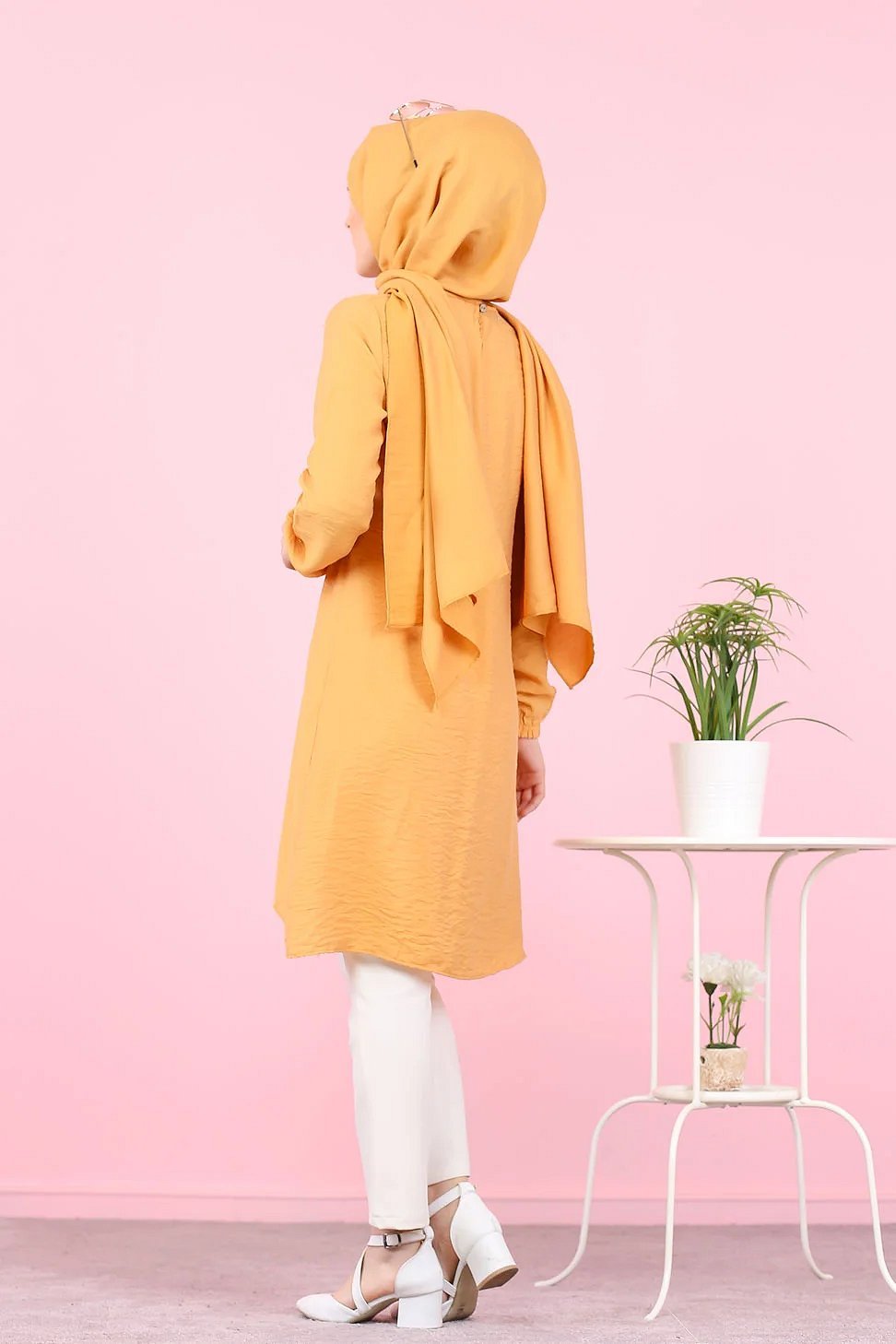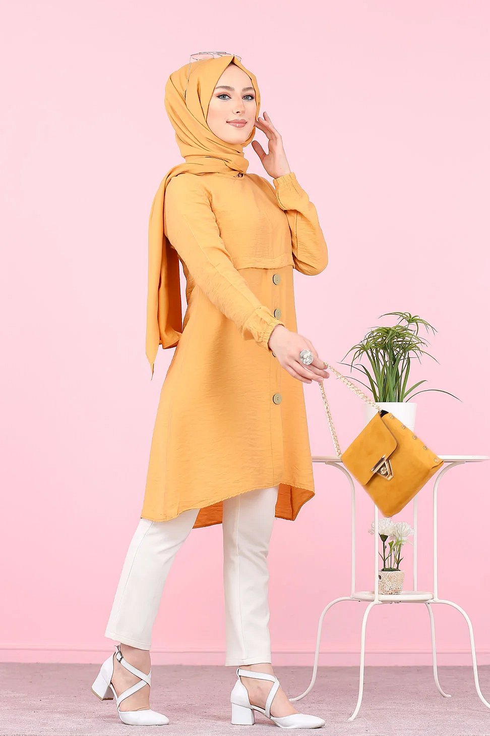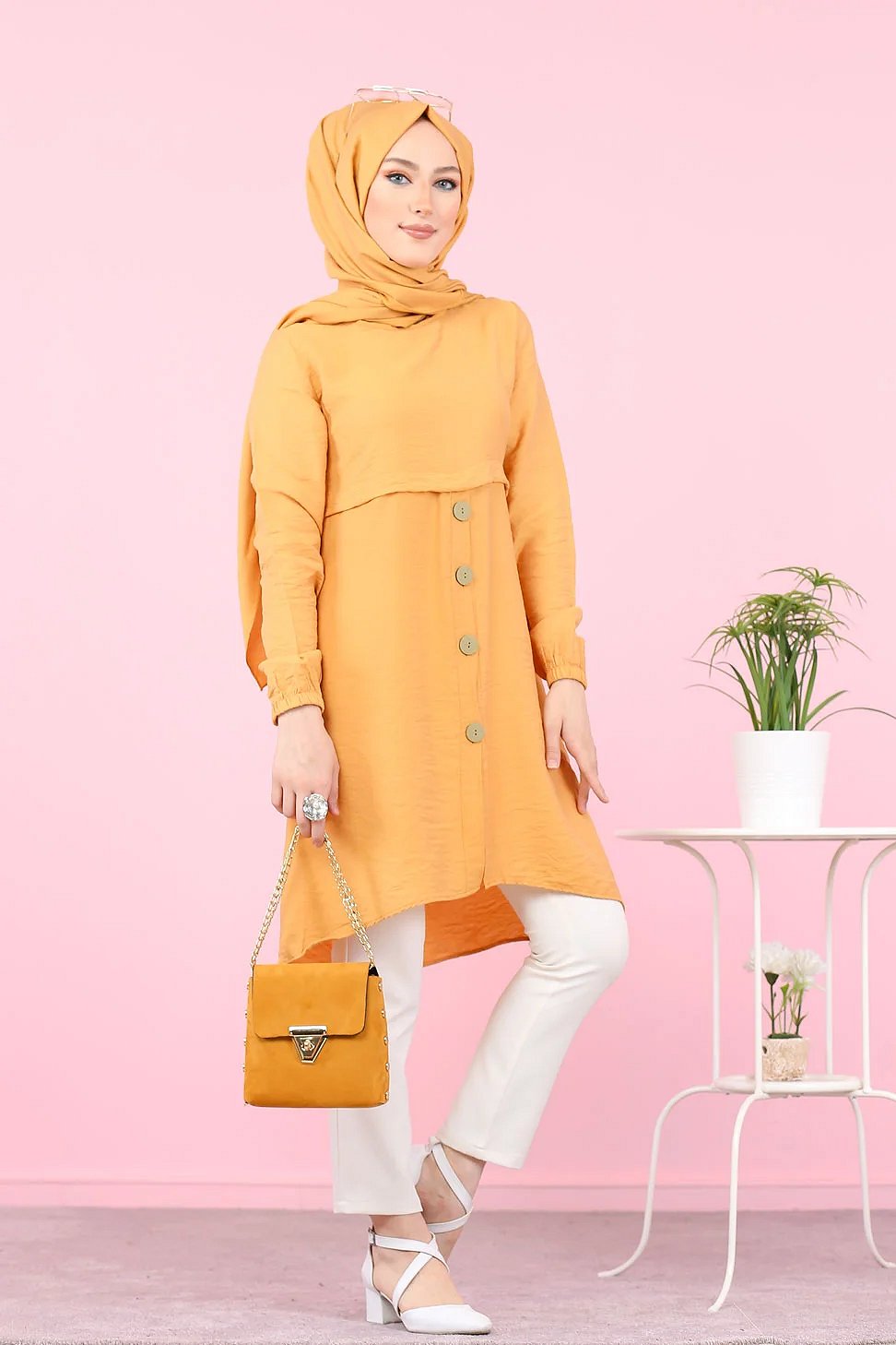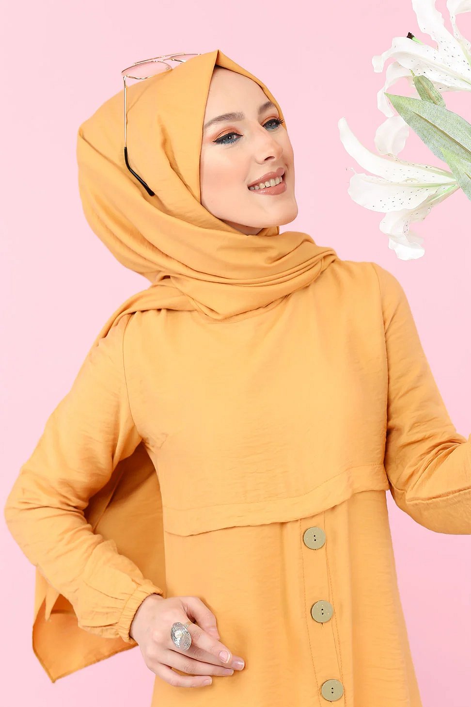 Tunique ample evasee boutonnee pour femme (Vetement Mastour pour Hijab) - Couleur Jaune moutarde