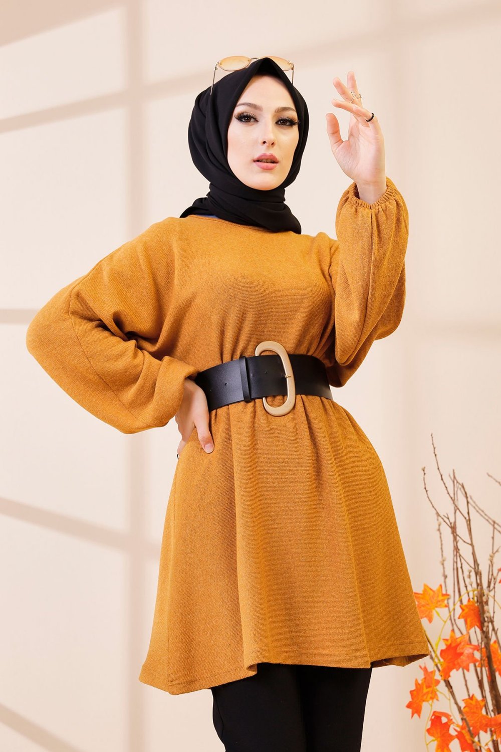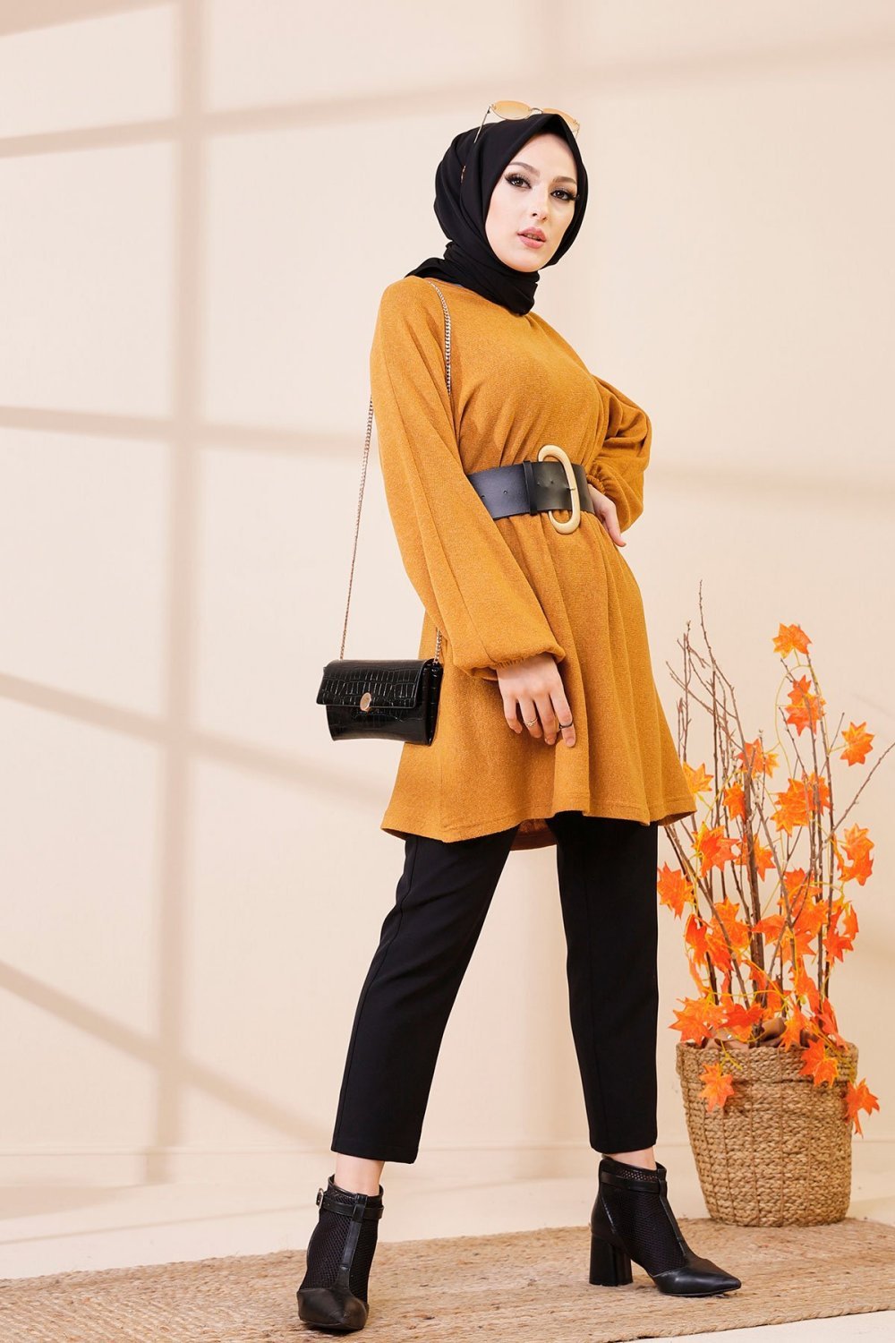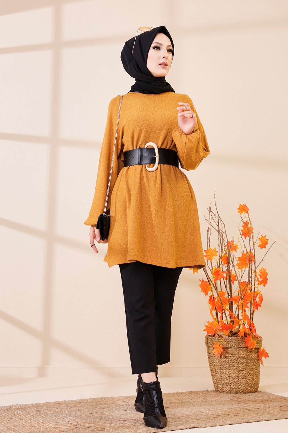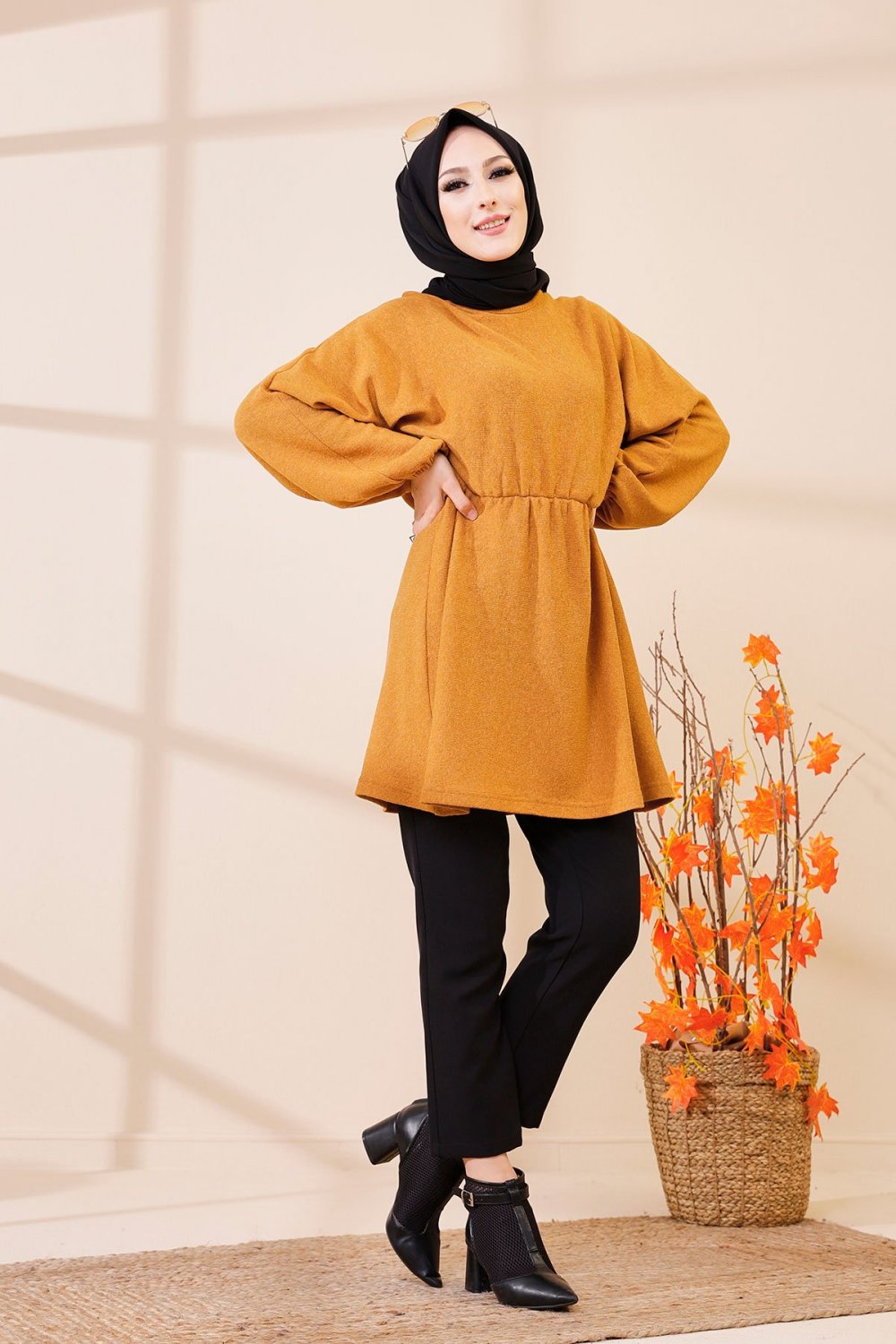 Tunique longue boutonnée (Vetement femme voilée Automne-Hiver) - Couleur noire et moutarde - REF. 32230 (25.00 €) - En Promotion à 18.00 €