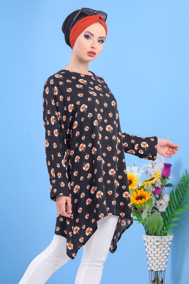 Tunique noire à fleurs oranges pour femme (Grandes tailles disponibles) - REF. 32103 (19.00 €)
