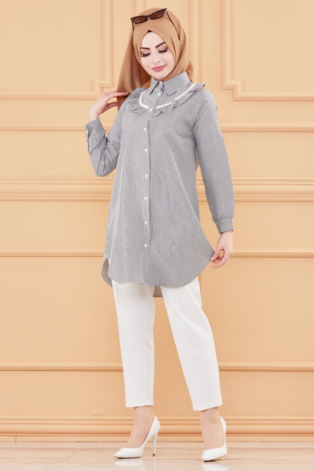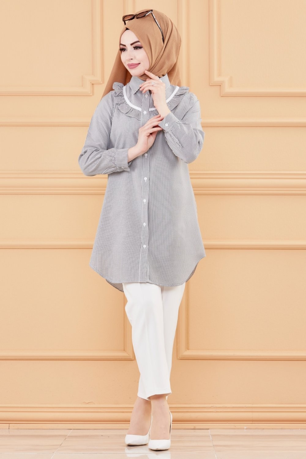 Tunique avec col foufrou (Vêtement femme musulmane style habillé) - Rayures couleur noir Vetement & Accessoire