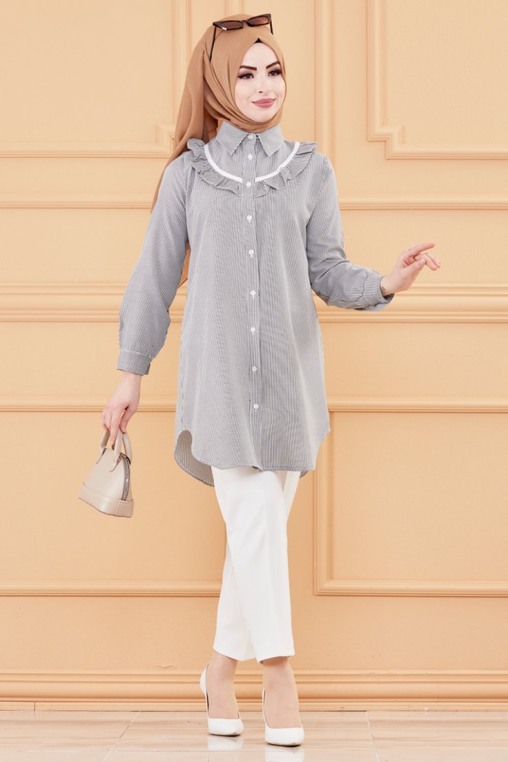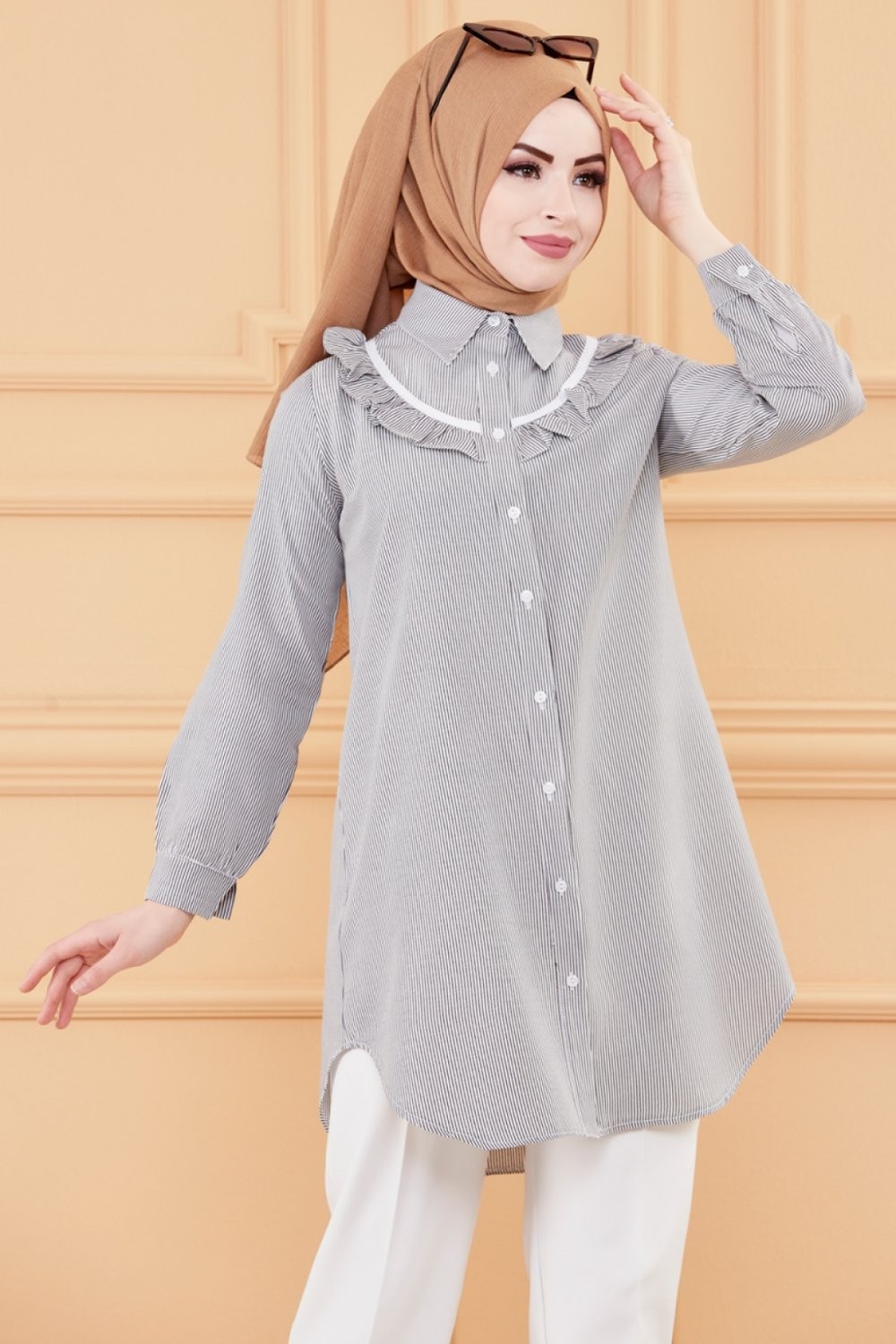 Tunique avec col foufrou (Vetement femme musulmane style habille) - Rayures couleur noir