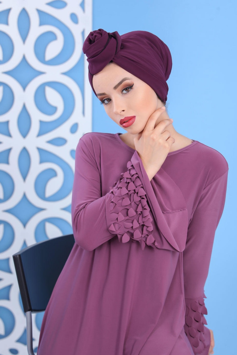 Tunique décontractée avec capuche (Vêtement hijab) - Couleur violet avec bandes blanches - REF. 37802 (19.00 €)