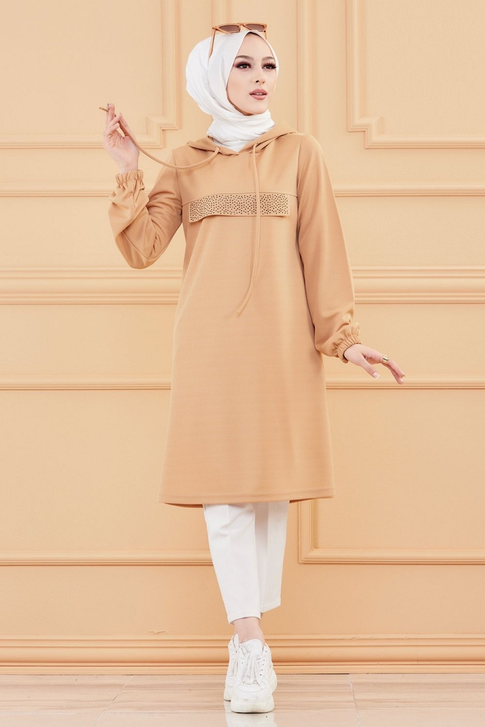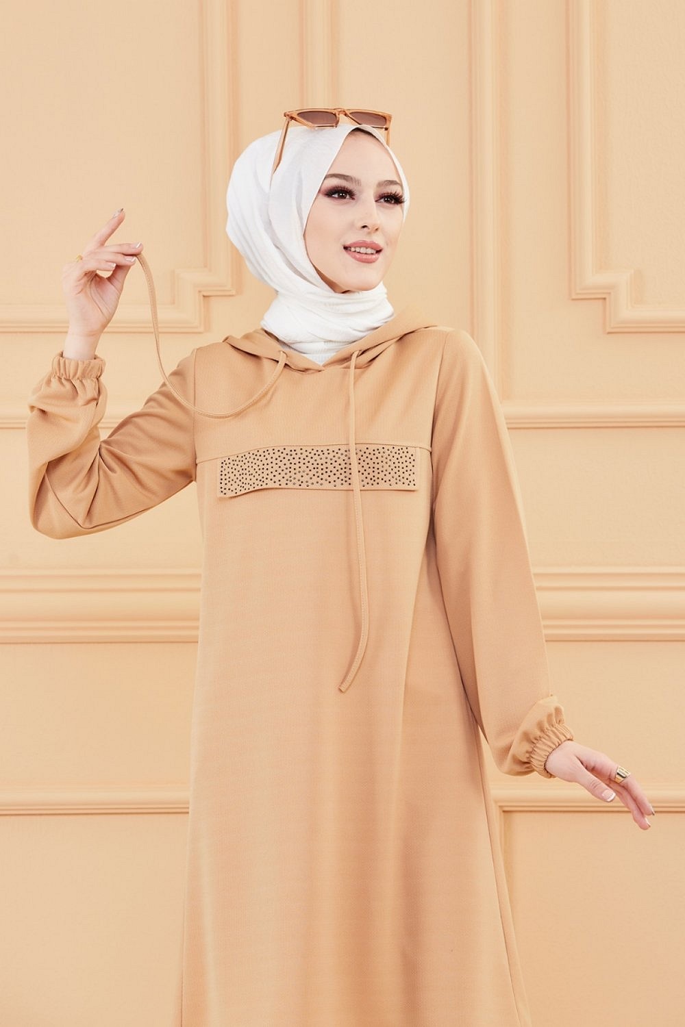 Tunique avec strass et capuche (Vetement hidjab decontracte moderne pour femme musulmane) - Couleur vison