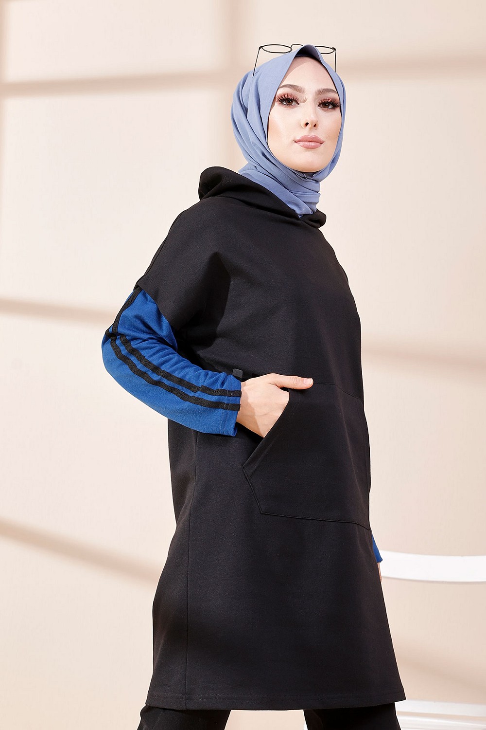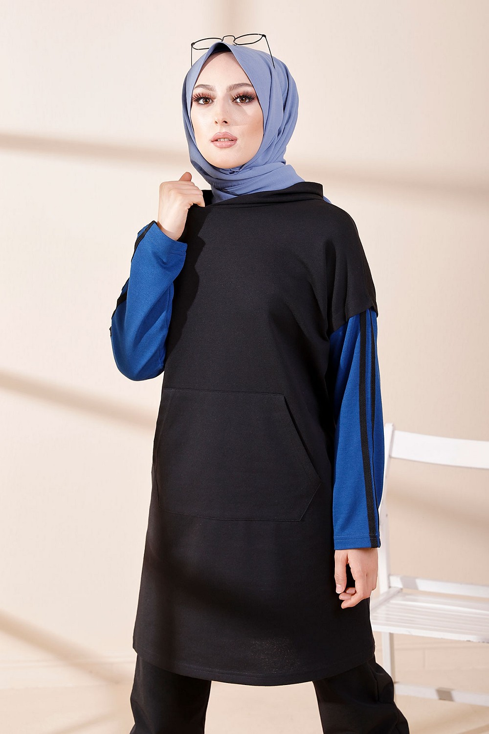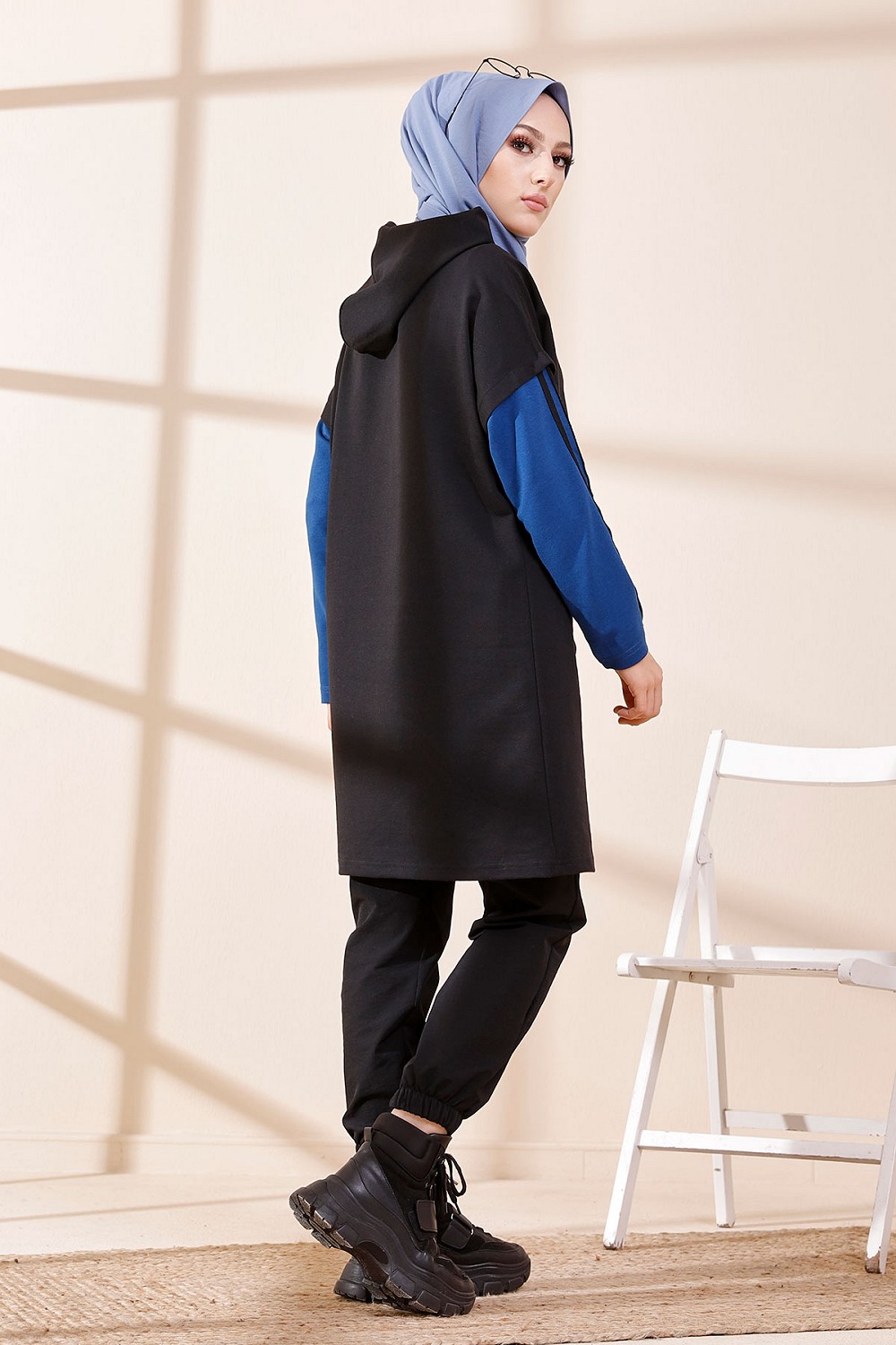 Tunique bicolore avec capuche pour femme (Hijab moderne et Sport) - Couleur noir et bleu roi Vetement & Accessoire