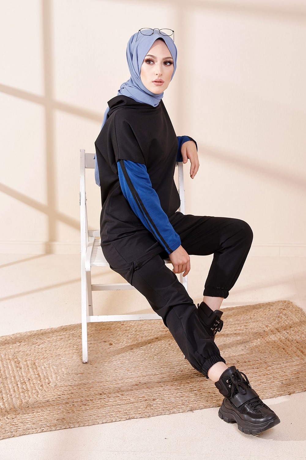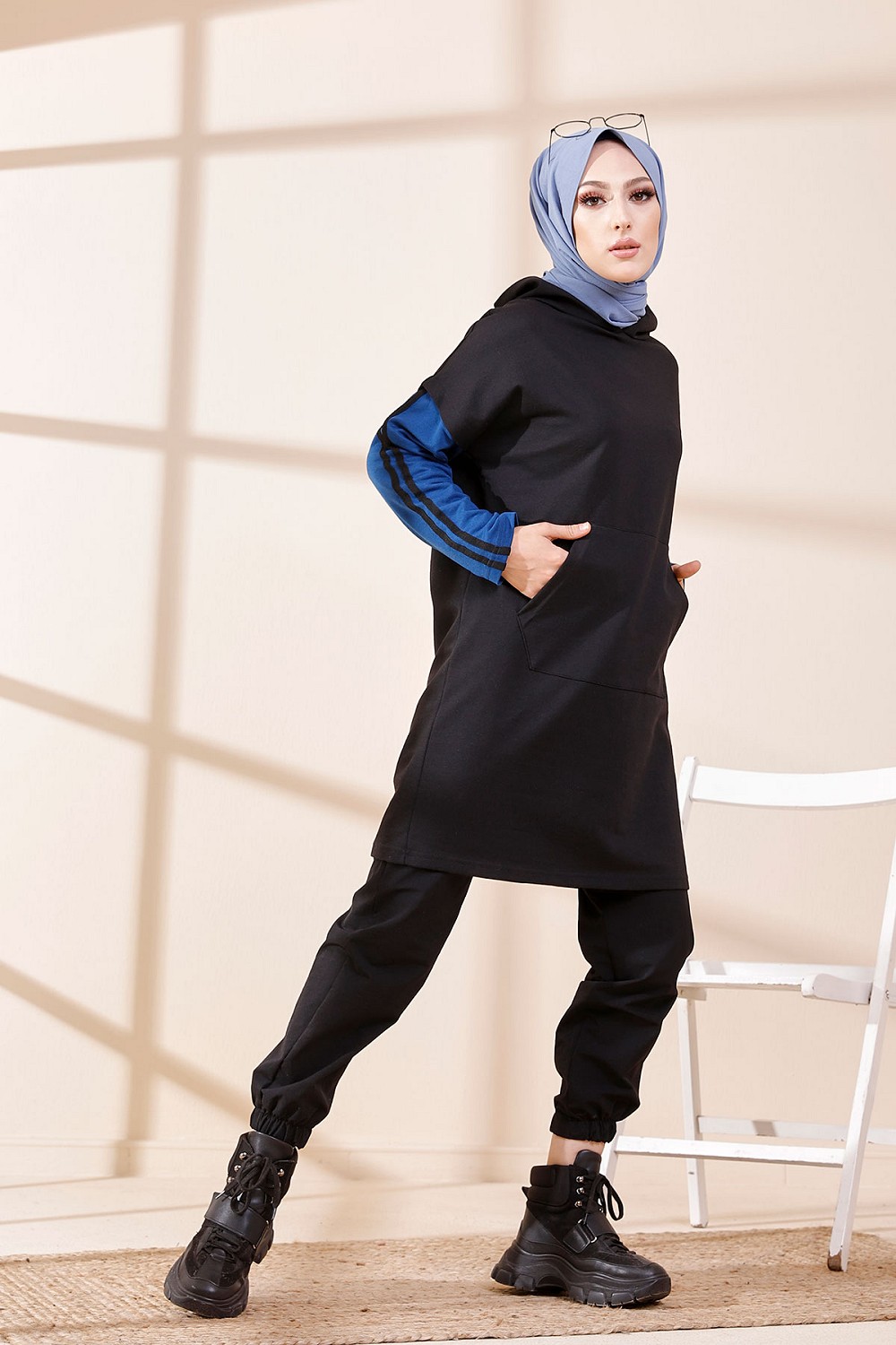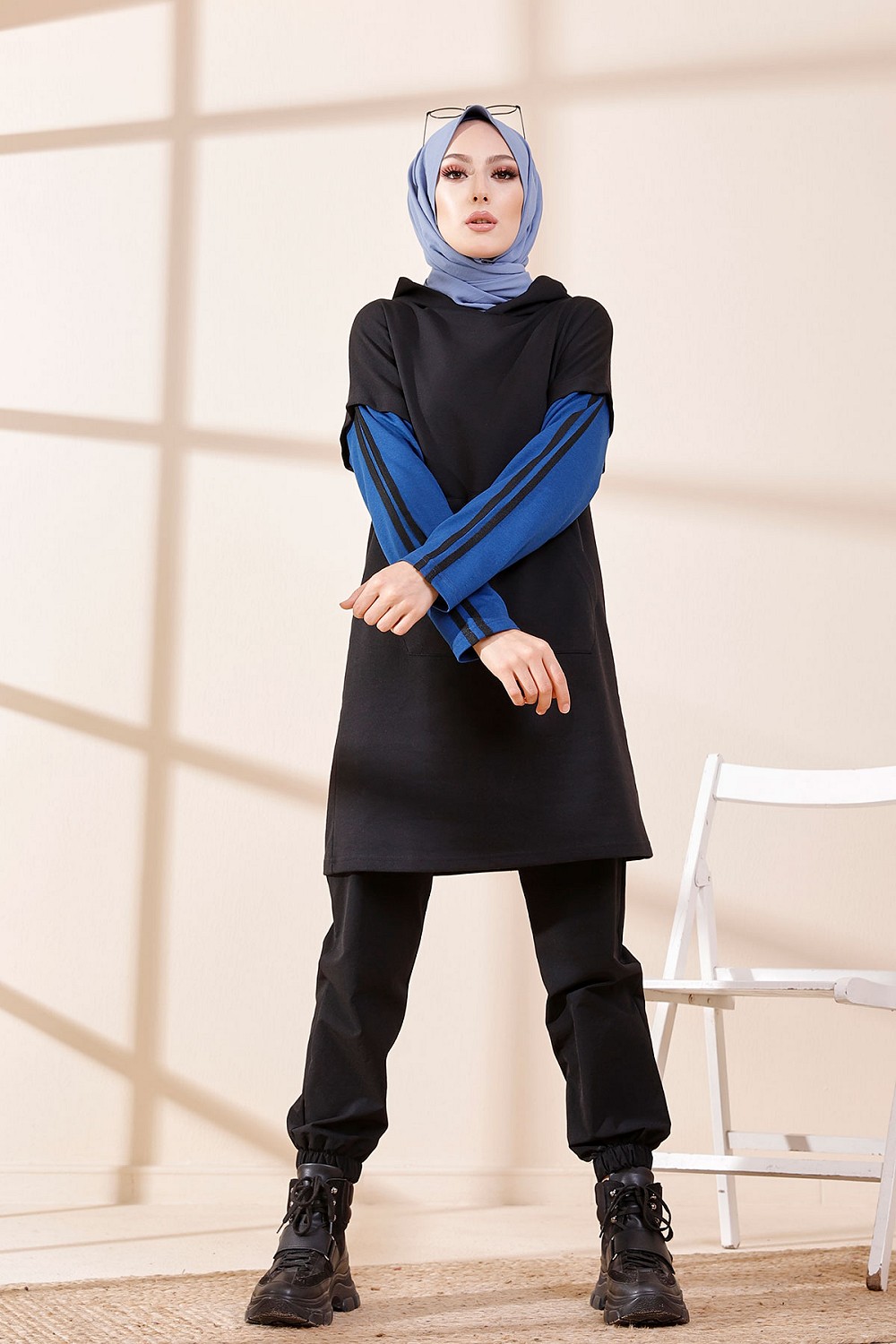 Tunique bicolore avec capuche pour femme (Hijab moderne et Sport) - Couleur noir et bleu roi Vetement & Accessoire