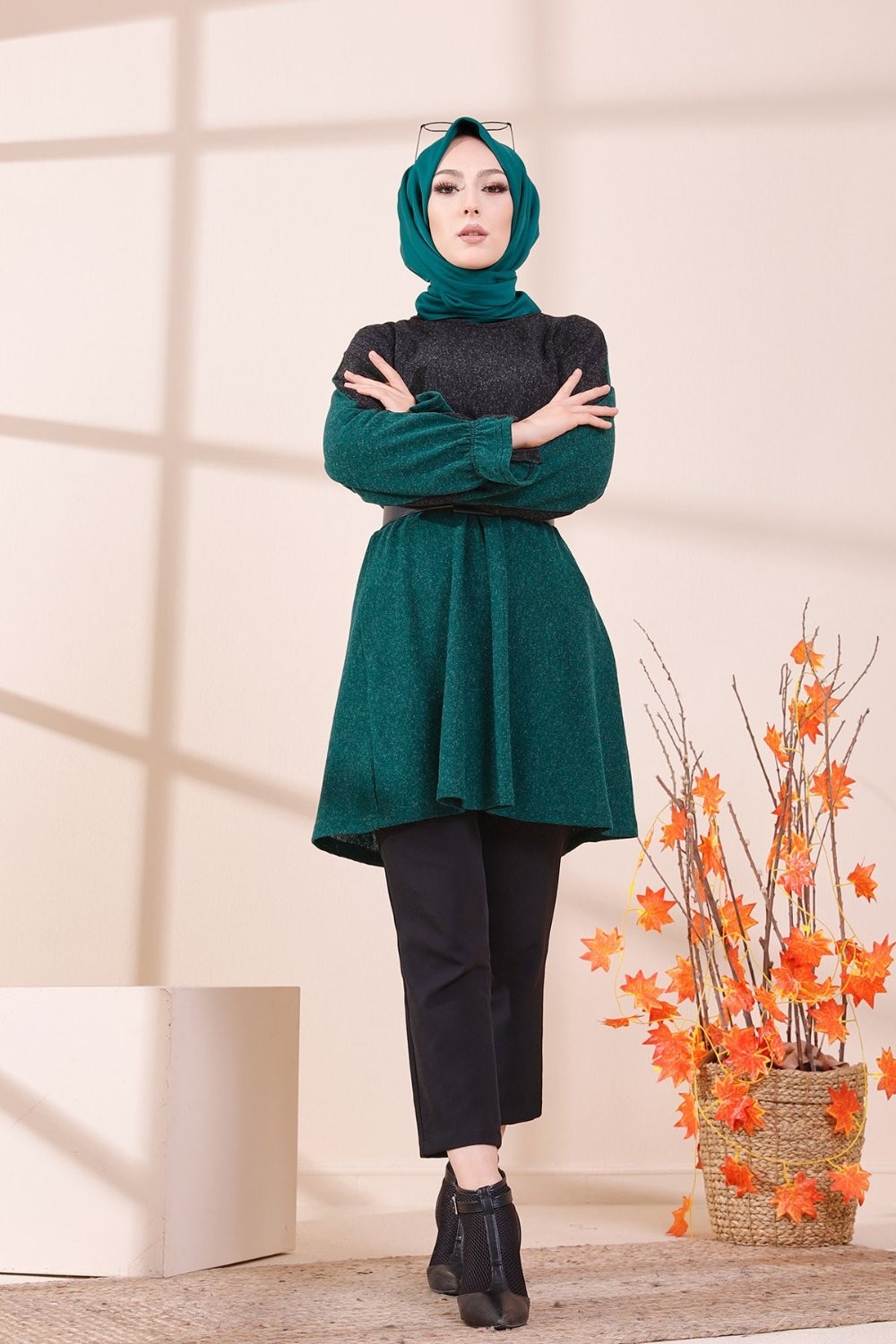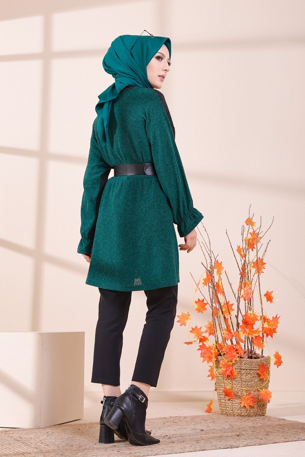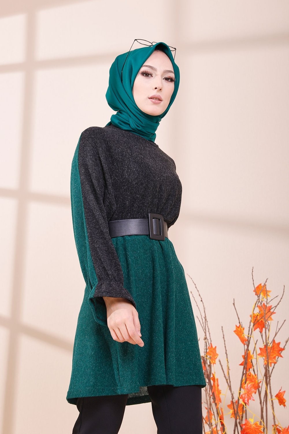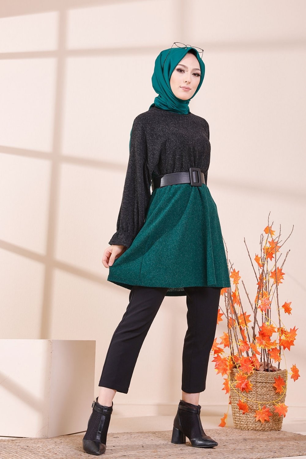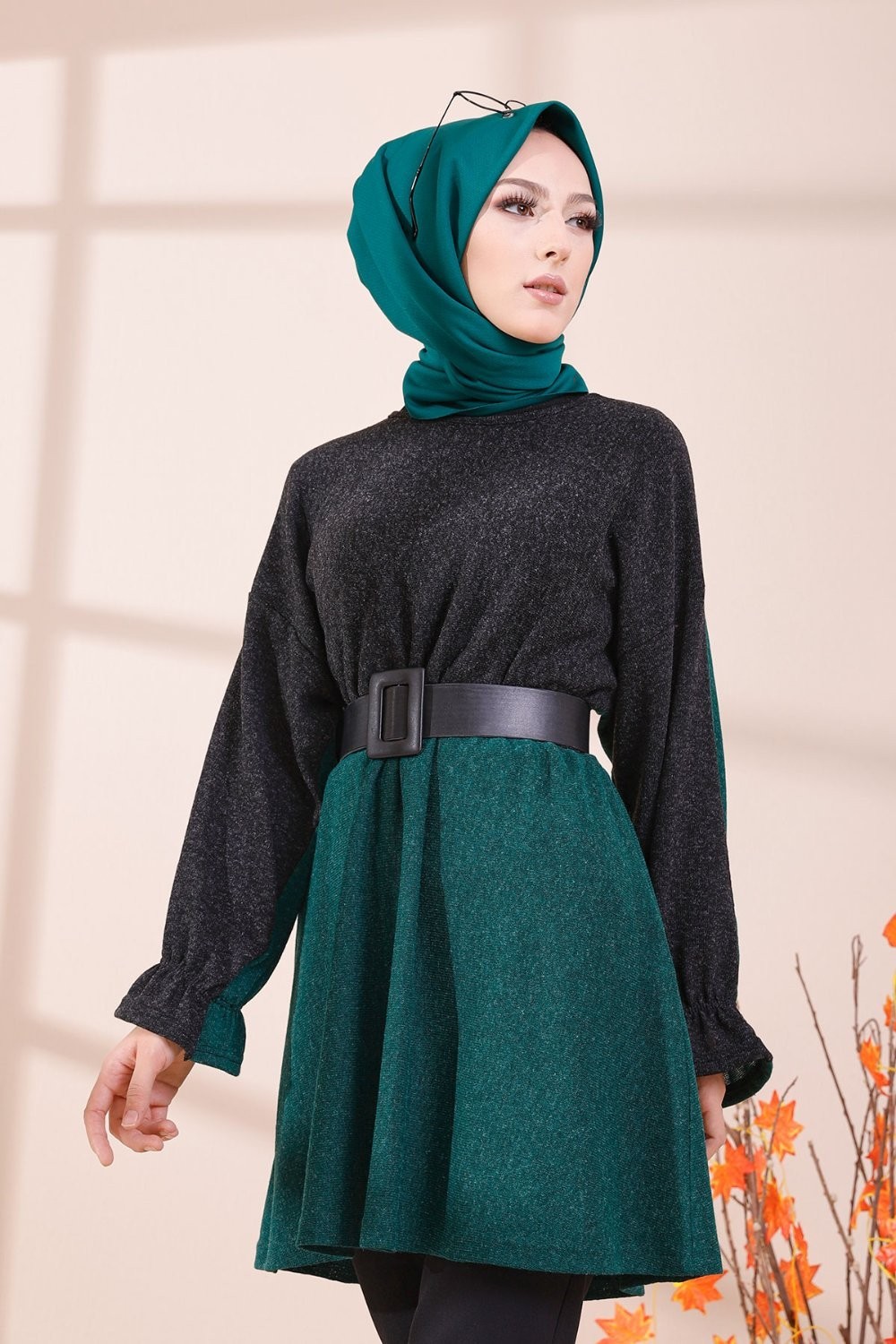 Tunique bicolore pour femme (Vêtement Hijab & Modest Fashion) - Couleur noir et vert émeraude Vetement & Accessoire