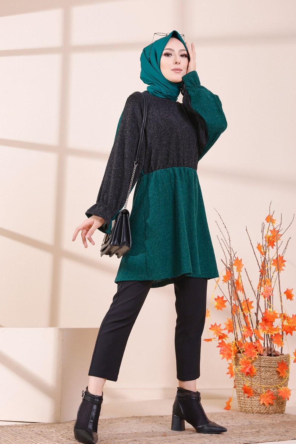 Tunique bicolore pour femme (Vetement Hijab & Modest Fashion) - Couleur noir et vert emeraude