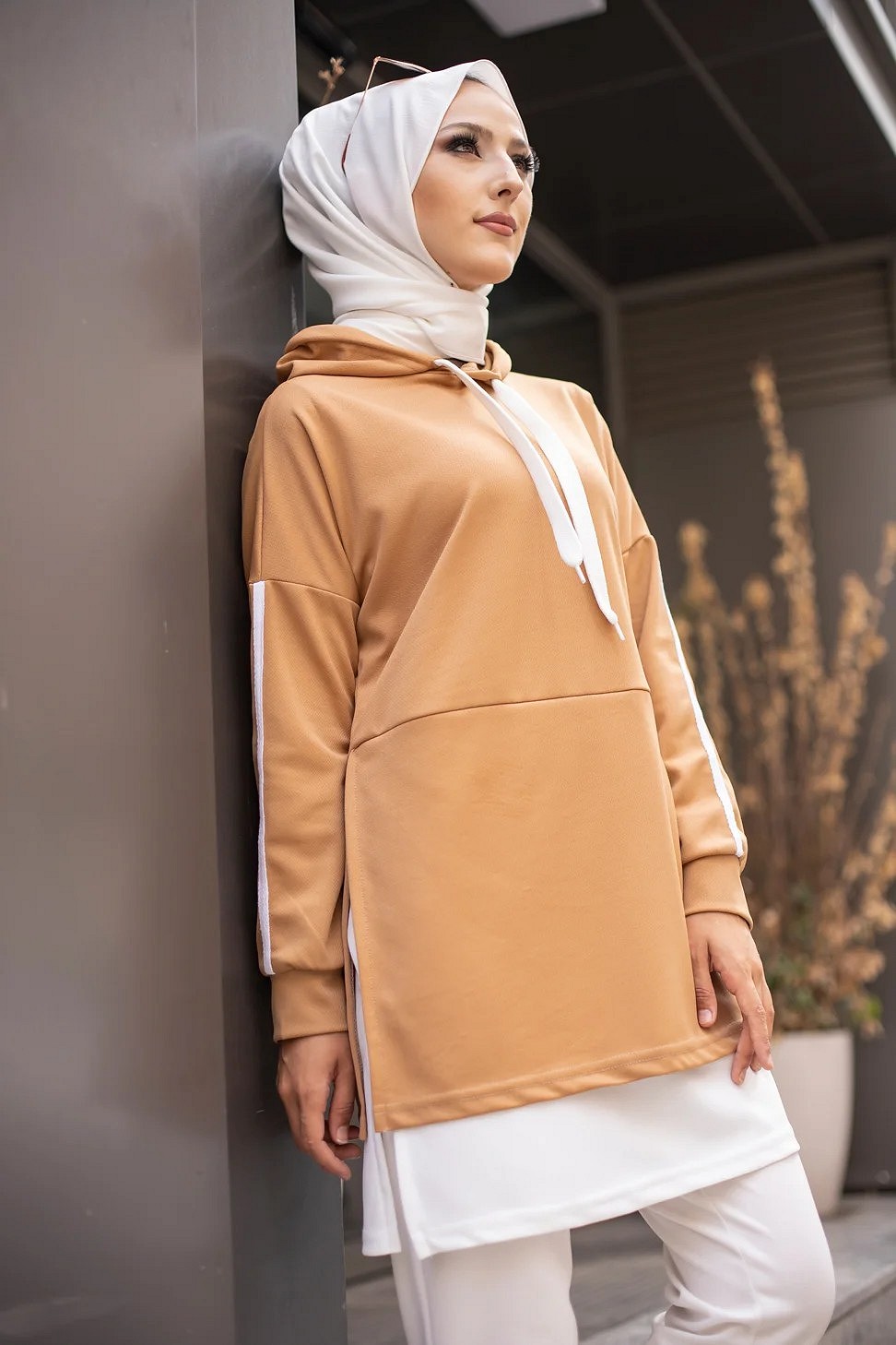 Sweatshirt long avec capuche style moderne décontracté et sport (Vetement voyage femme musulmane) - Couleur Beige - REF. 35366 (19.90 €)