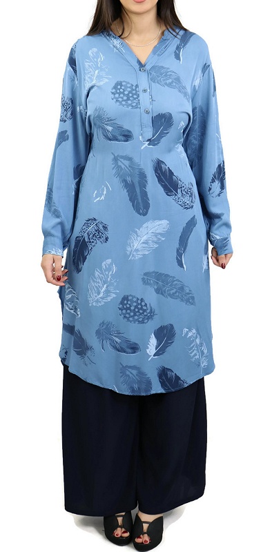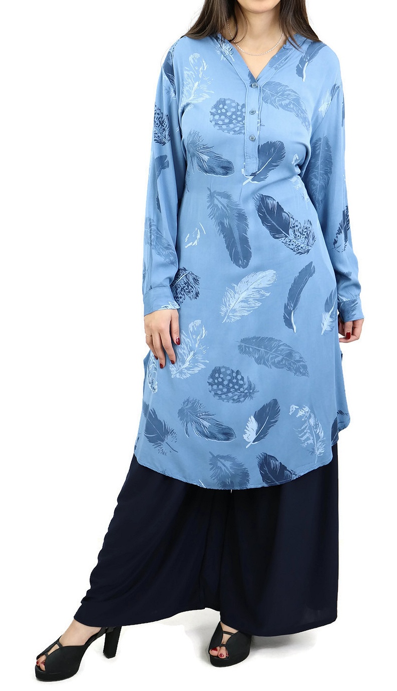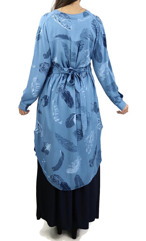 Tunique boutonnee avec ceinture - Couleur bleue avec motifs