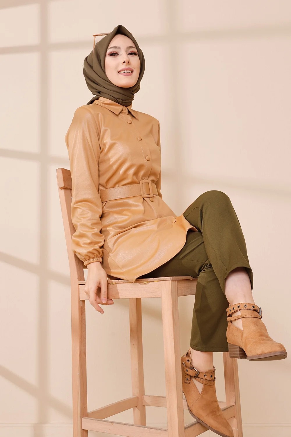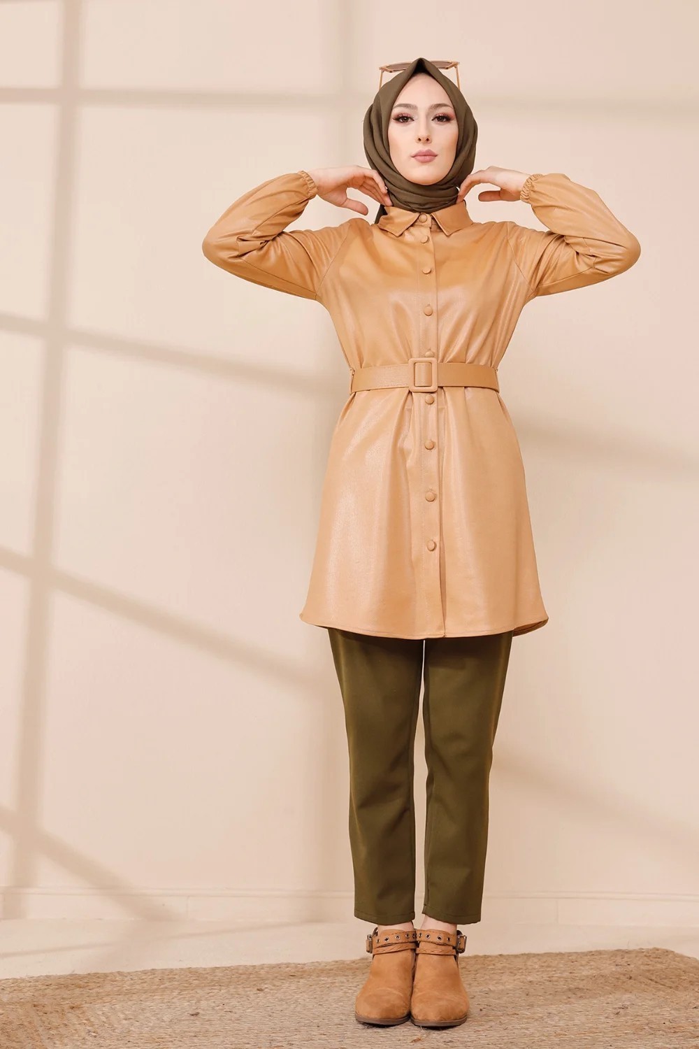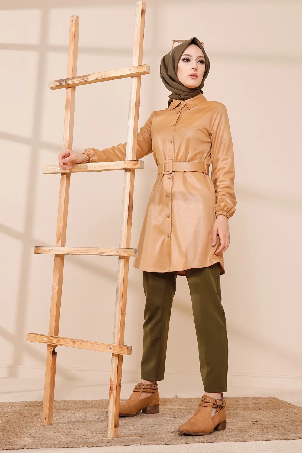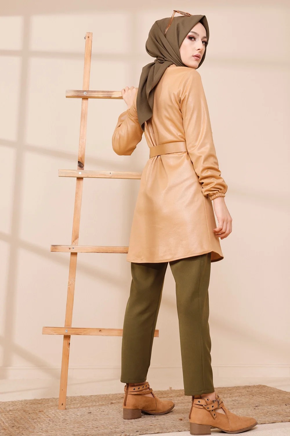 Tunique brillante avec ceinture (Vetement style chic pour femme voilee) - Couleur beige