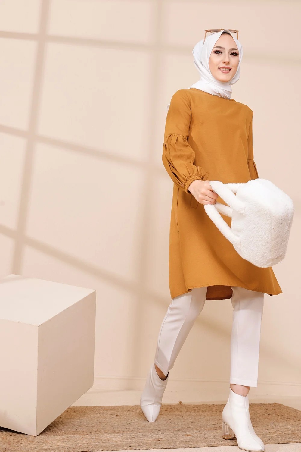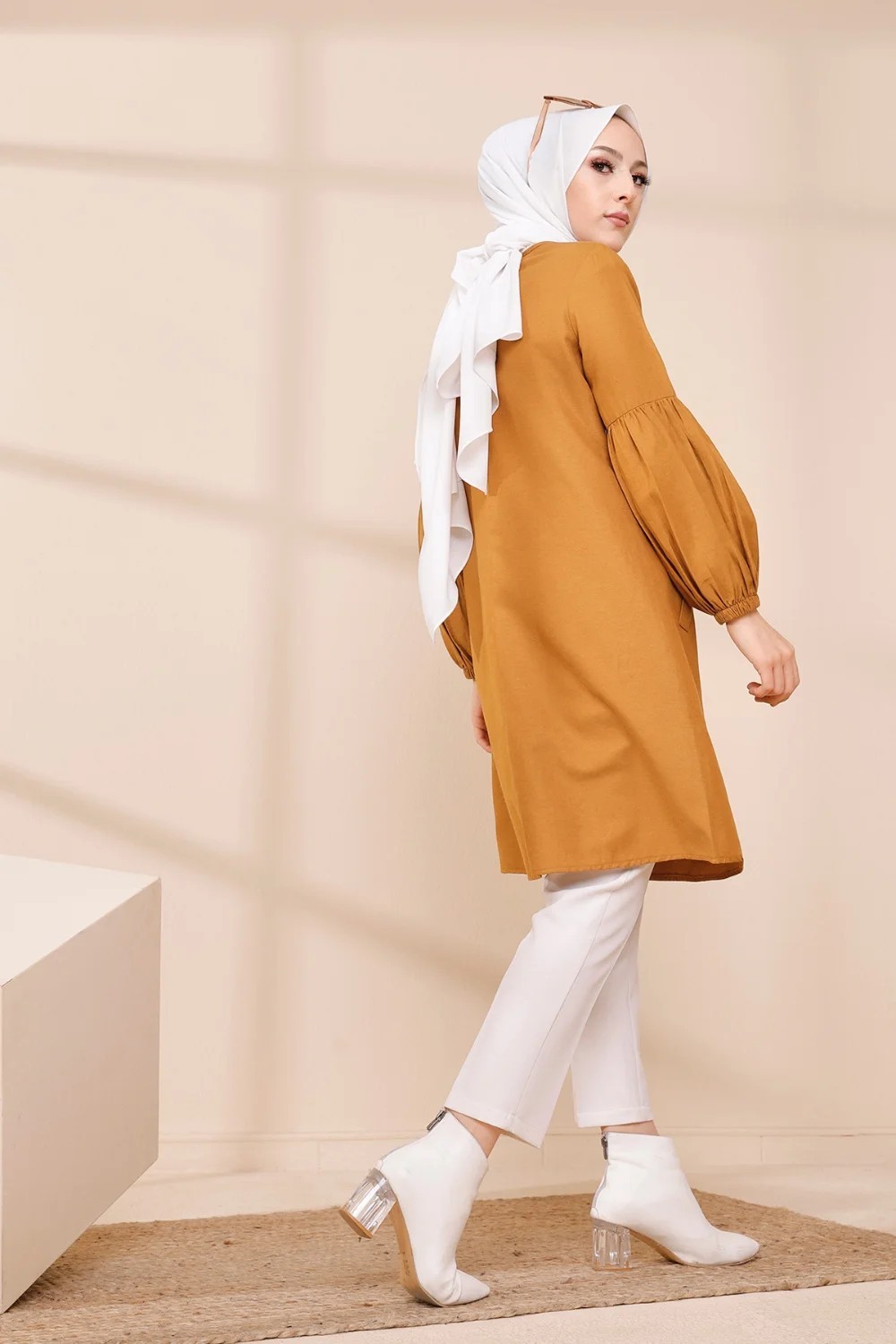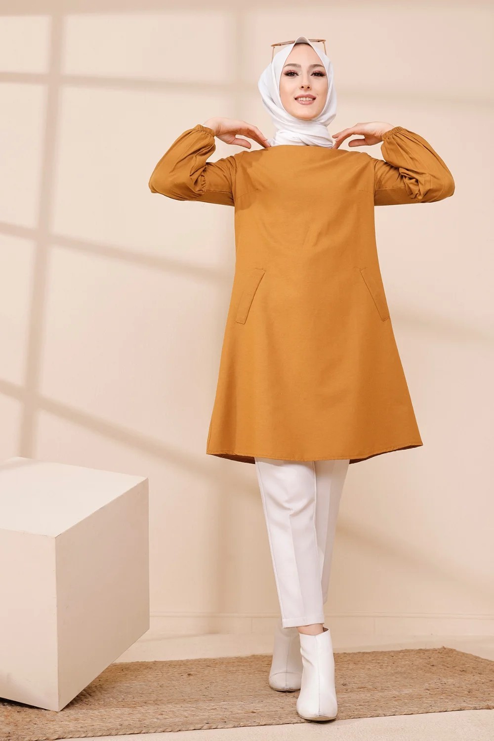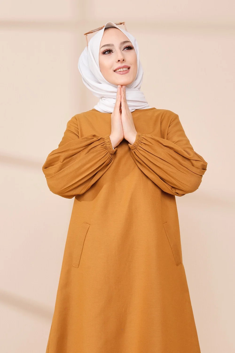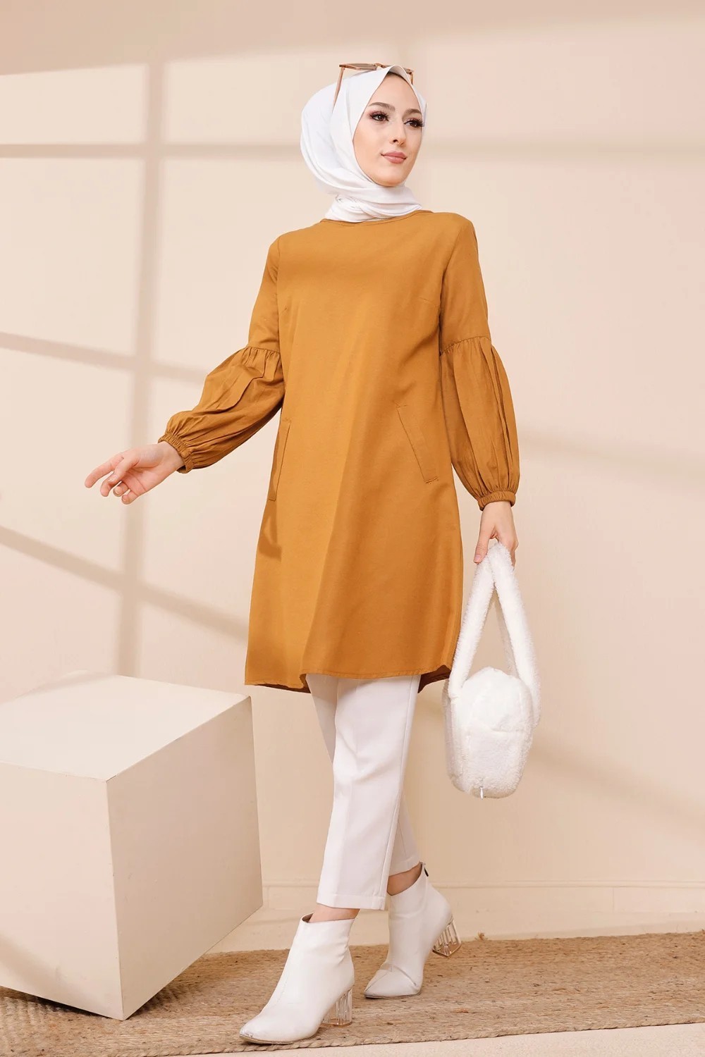 Tunique casual a manches bouffantes pour femme (Vetement pour musulmane) - Couleur moutarde