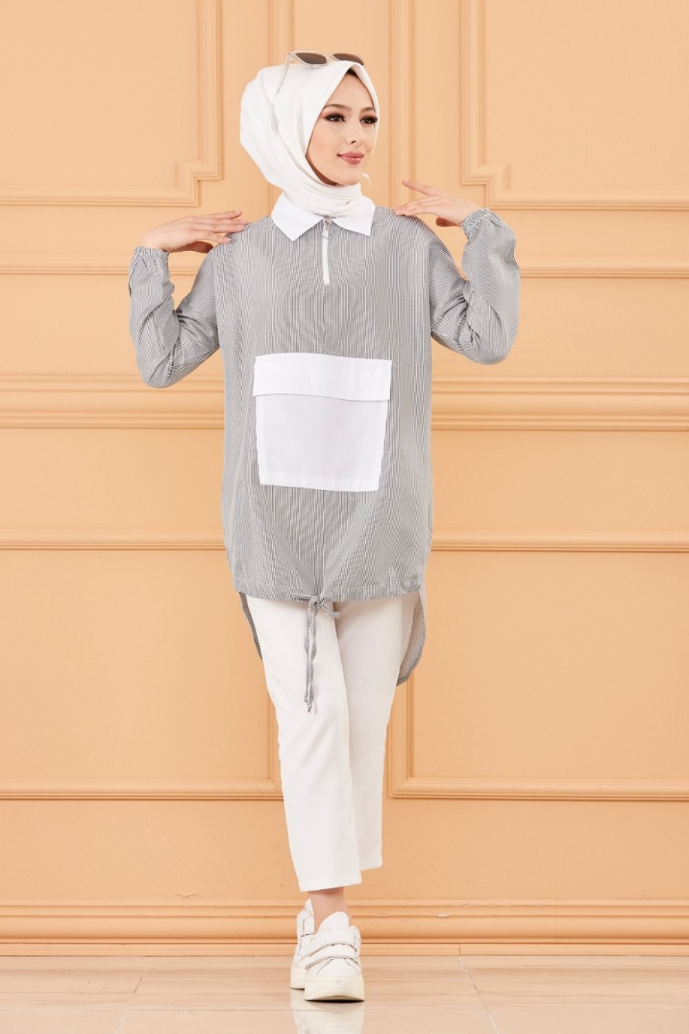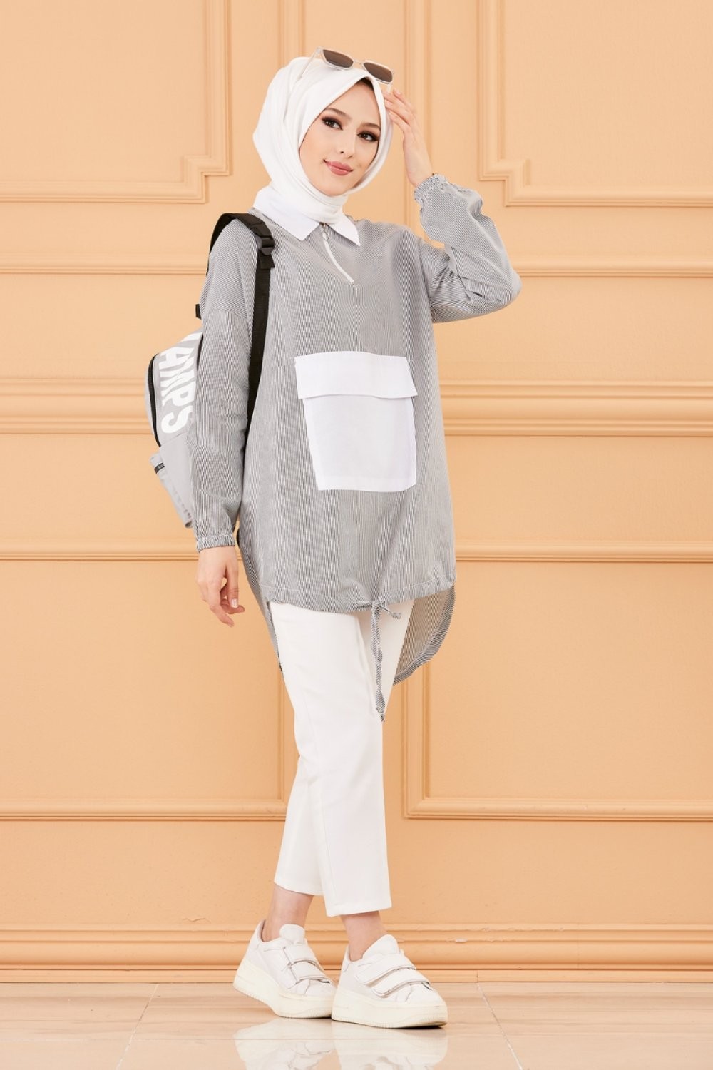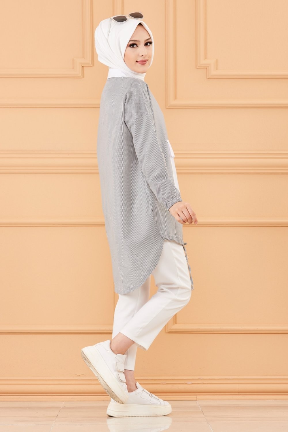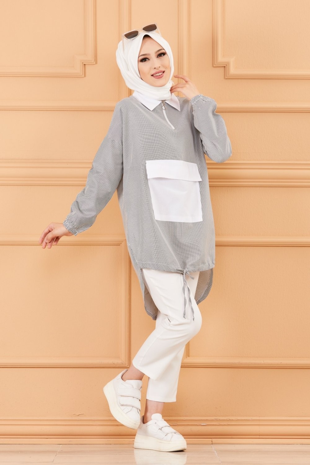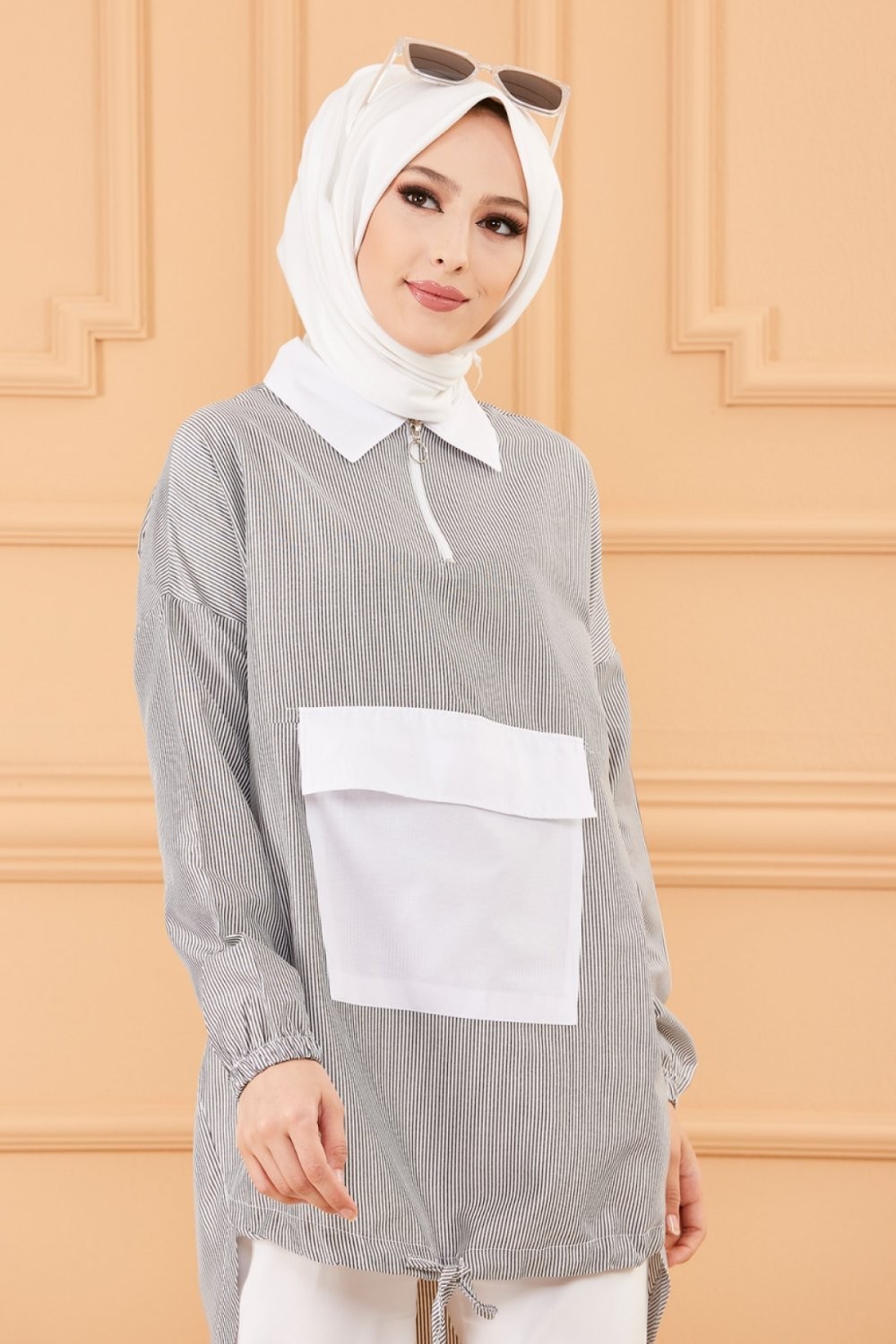 Tunique casual avec grande poche à l'avant (Vêtements islamiques modernes) - Couleur des rayures : noir Vetement & Accessoire