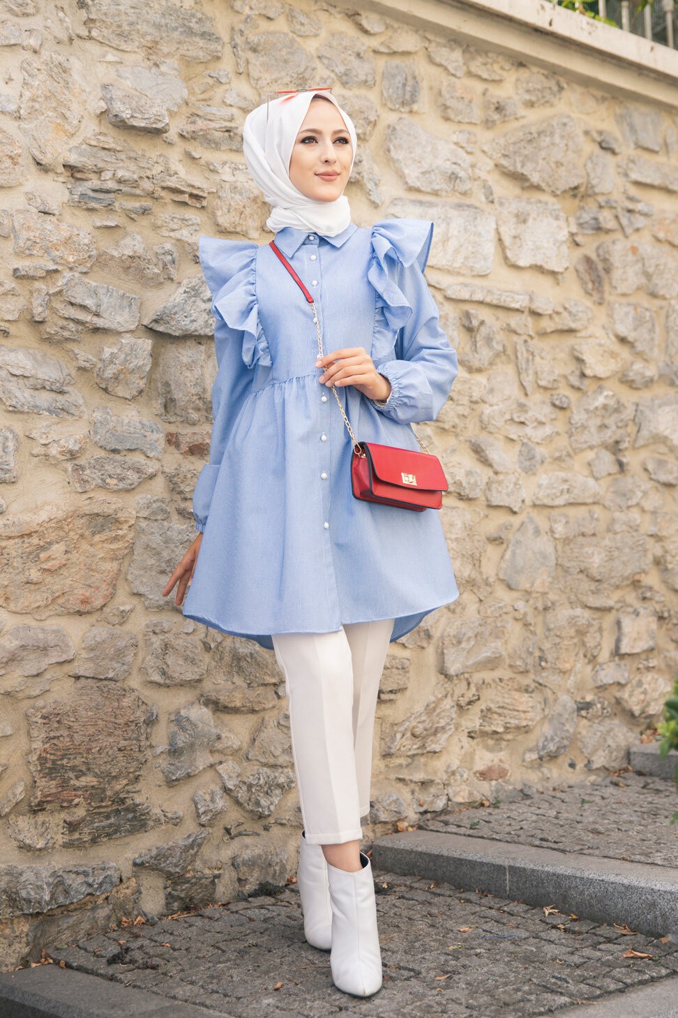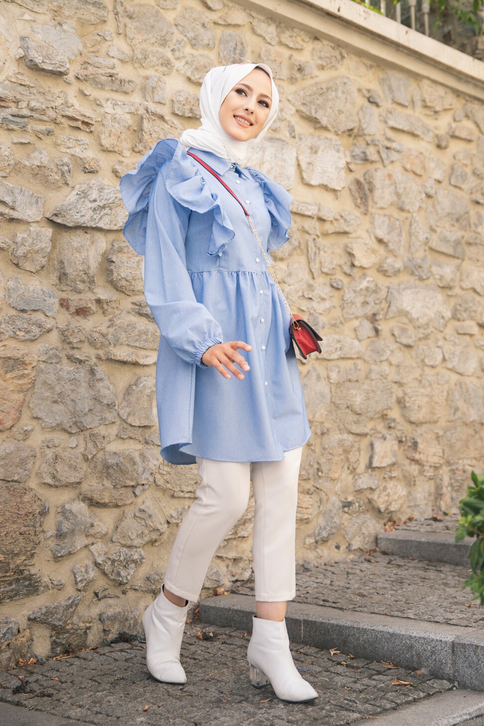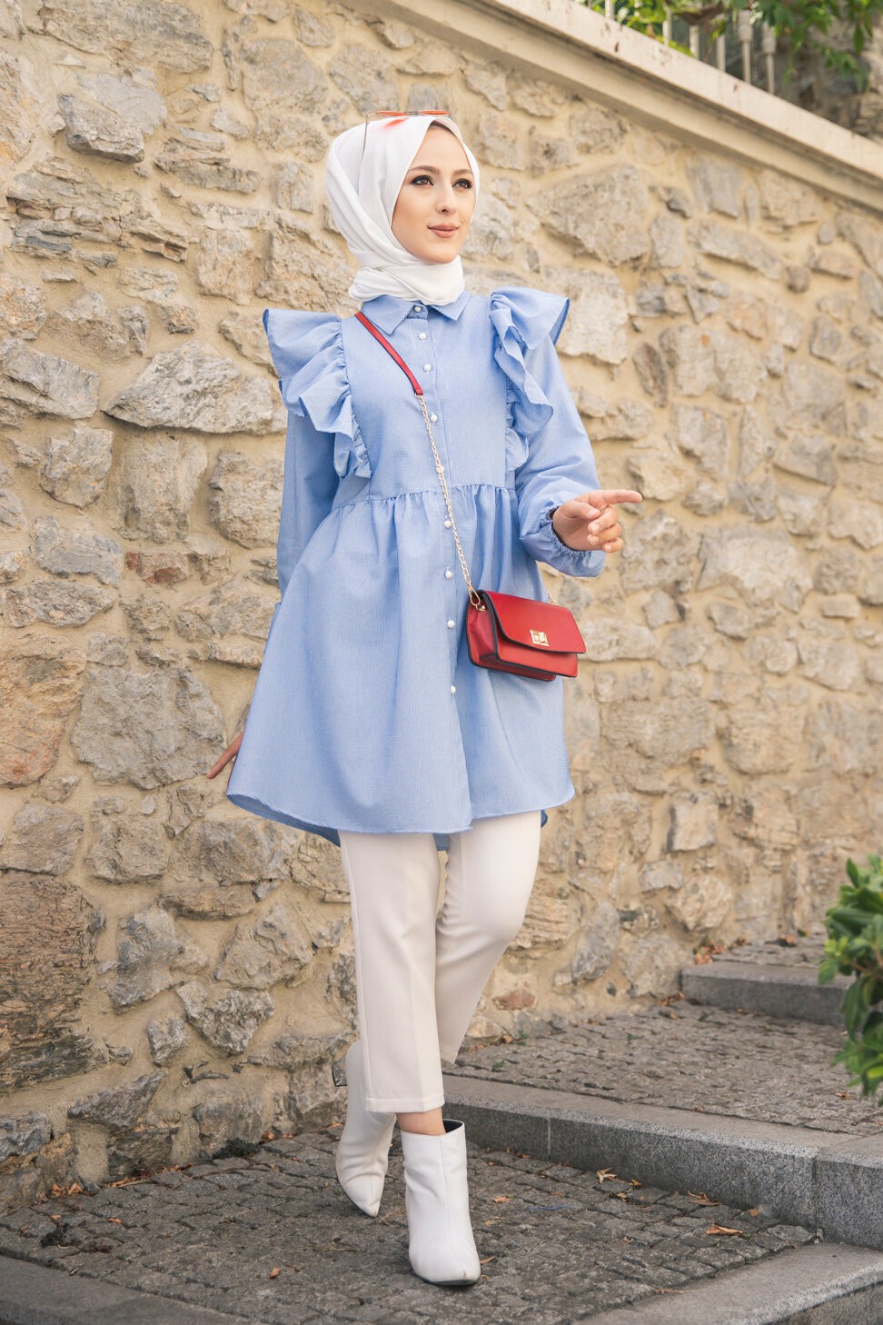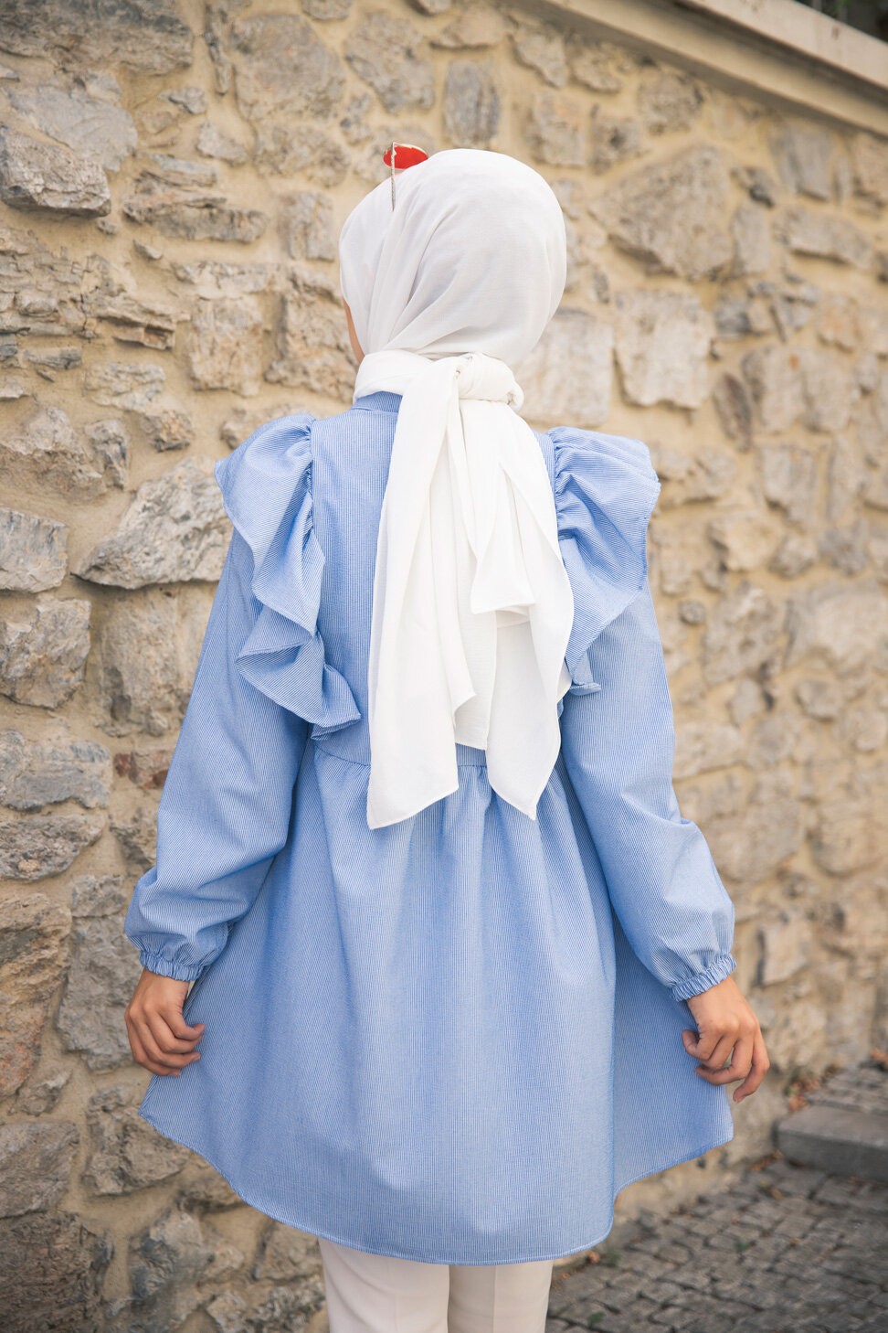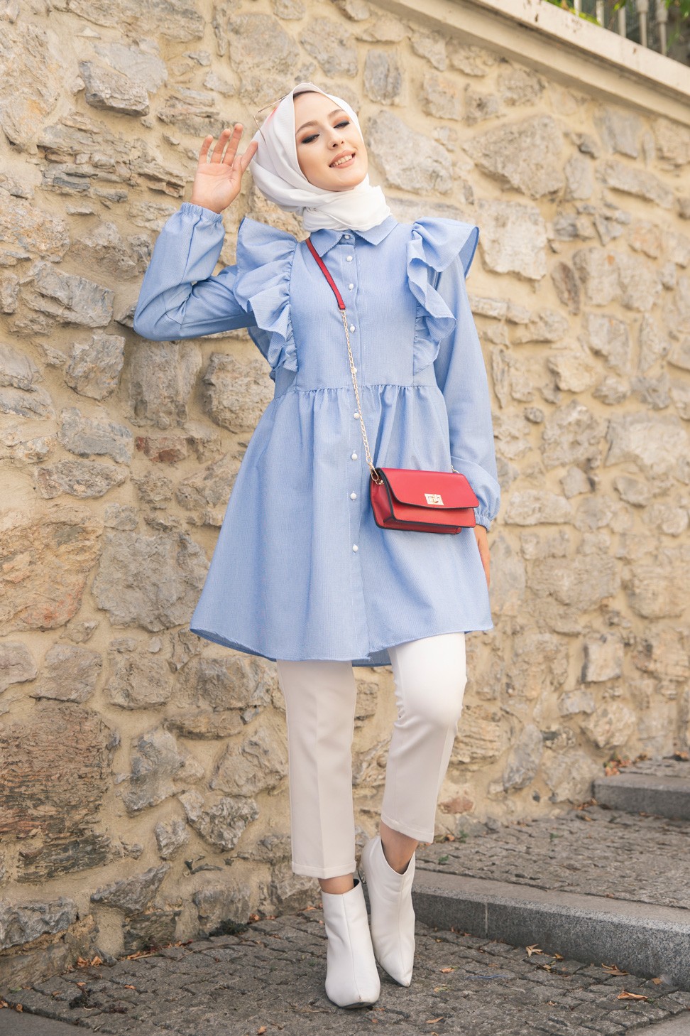 Tunique-chemise à volants ample pour femme (Vêtement pour Hijab) - Couleur des rayures bleu et blanc Vetement & Accessoire