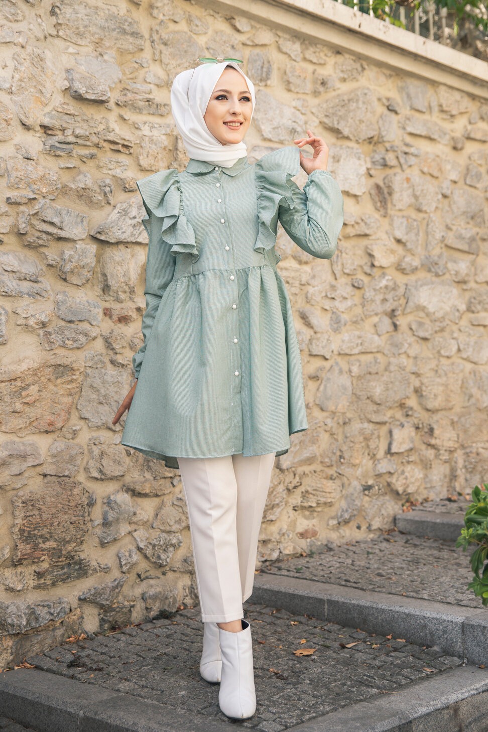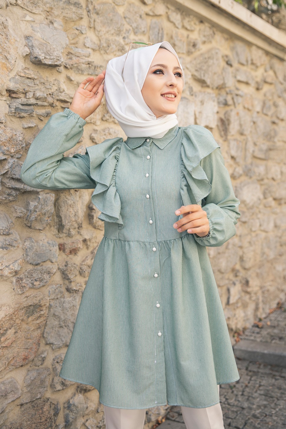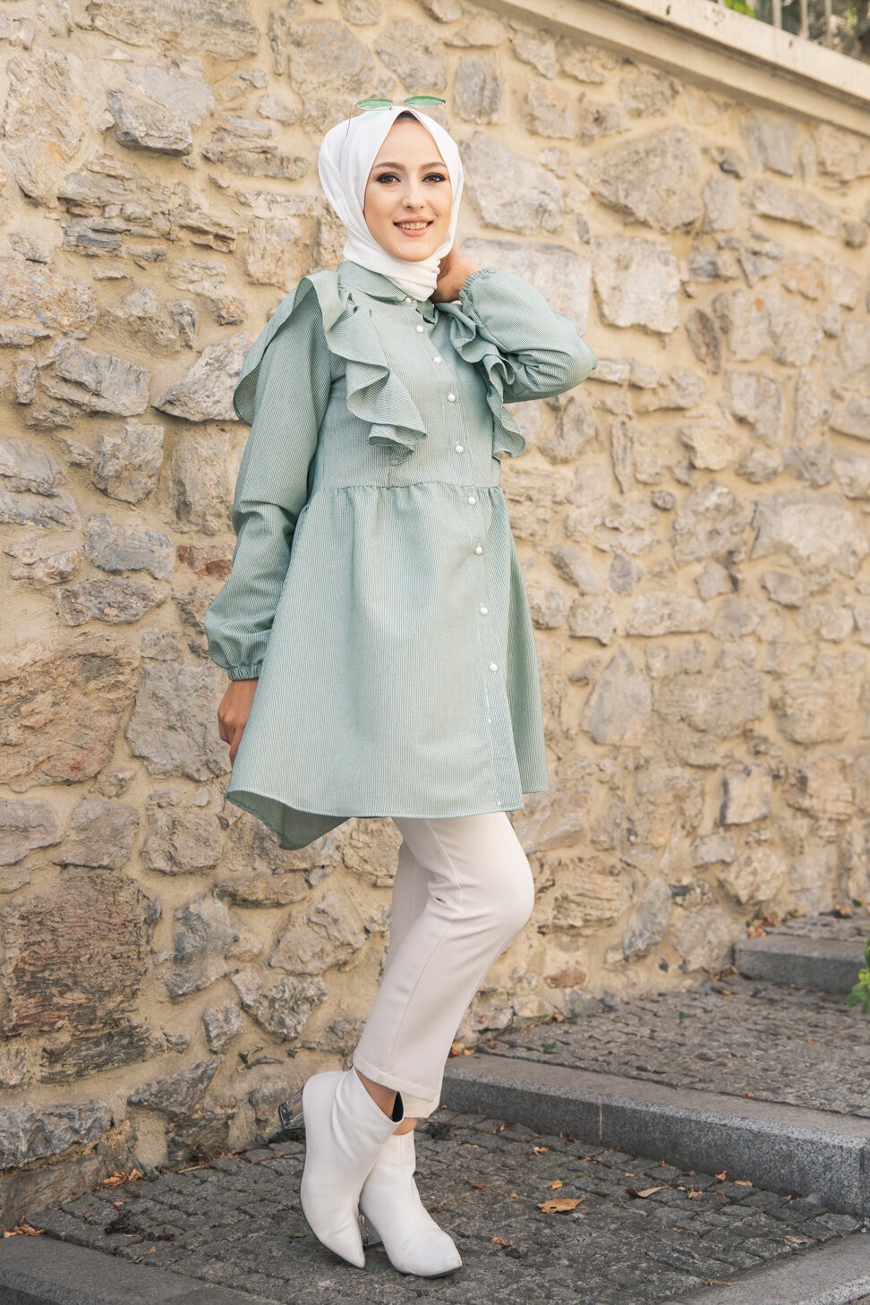 Tunique-chemise a volants ample pour femme (Vetements pour Hijabs - Nouveautes) - Couleur des rayures vert et blanc