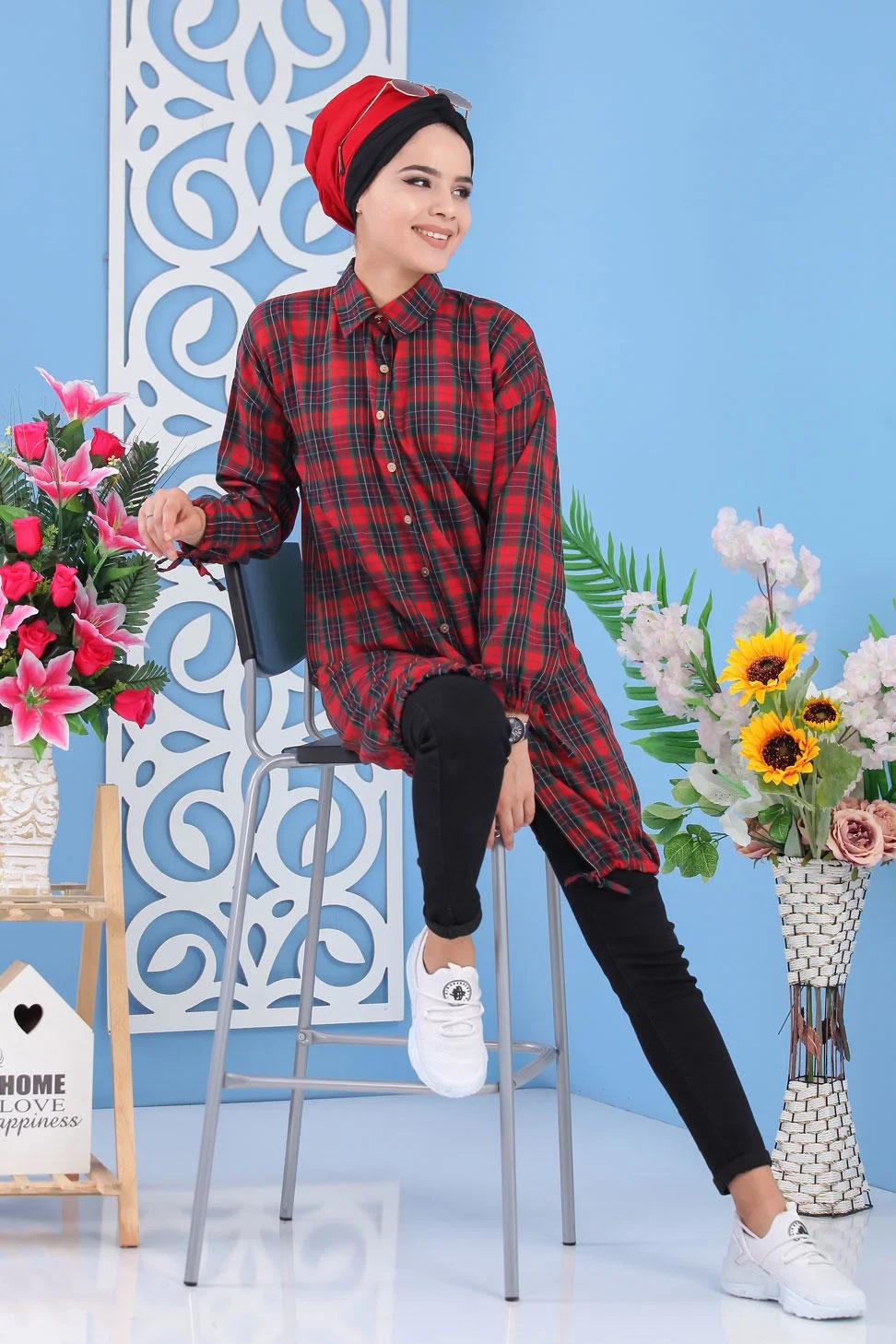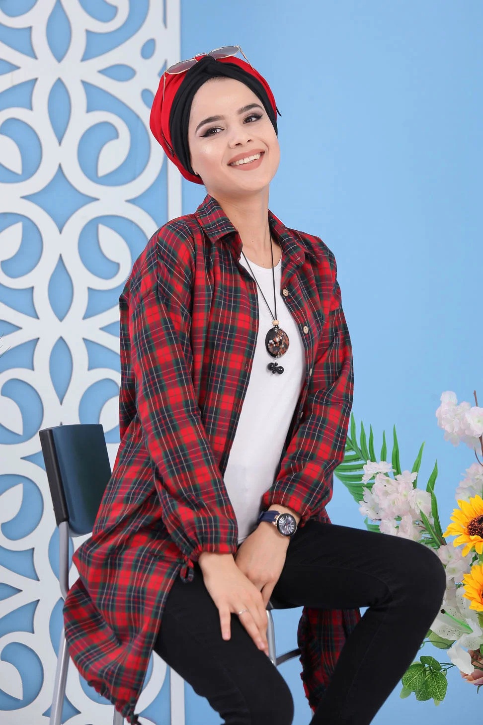 Chemise - Tunique à carreaux (Vêtement hijab pour femme) - Couleur noir et taba - REF. 35819 (19.90 €)