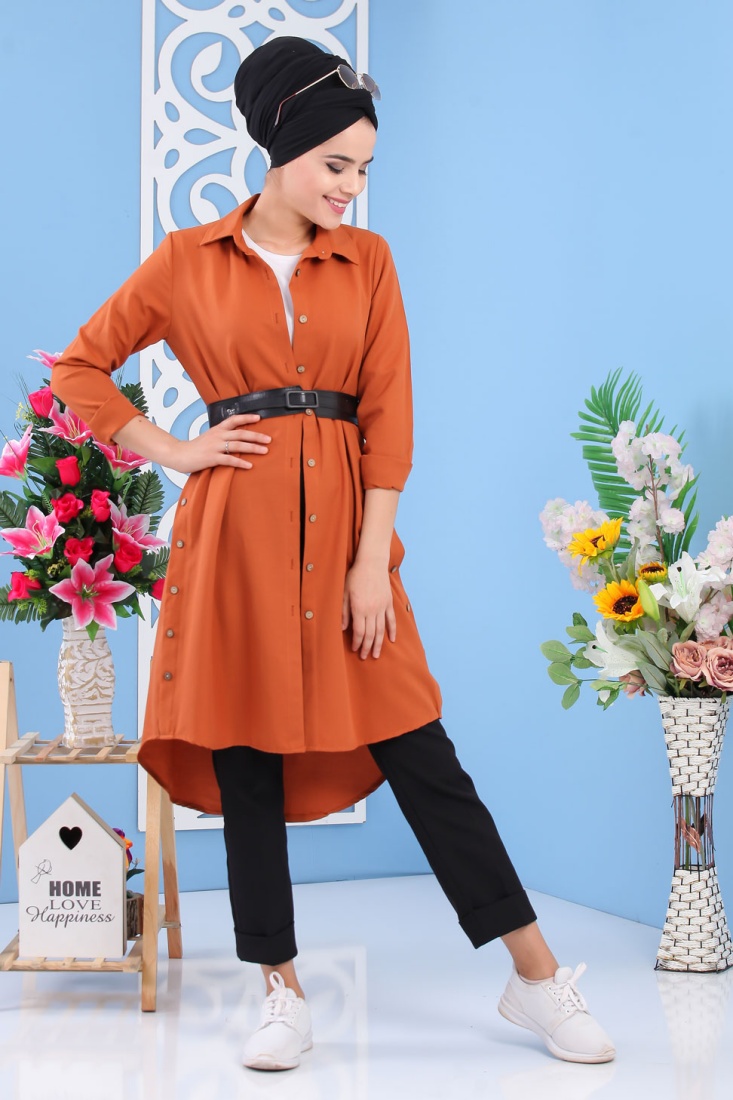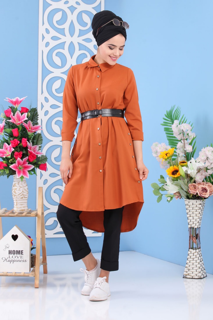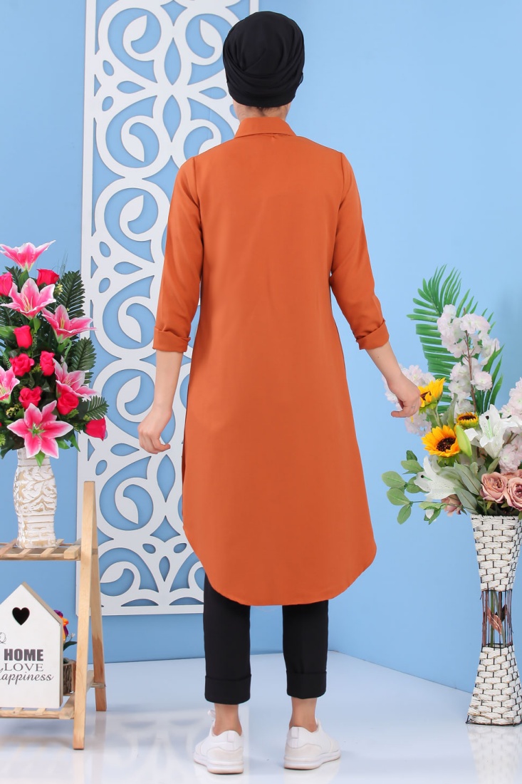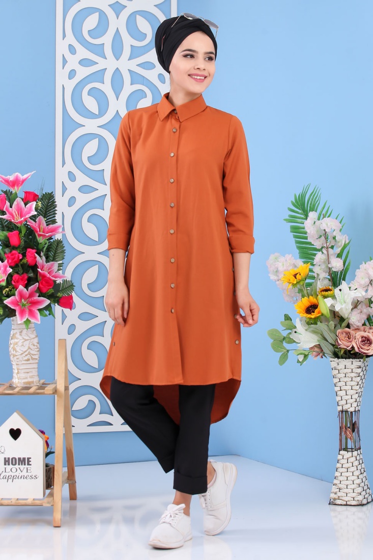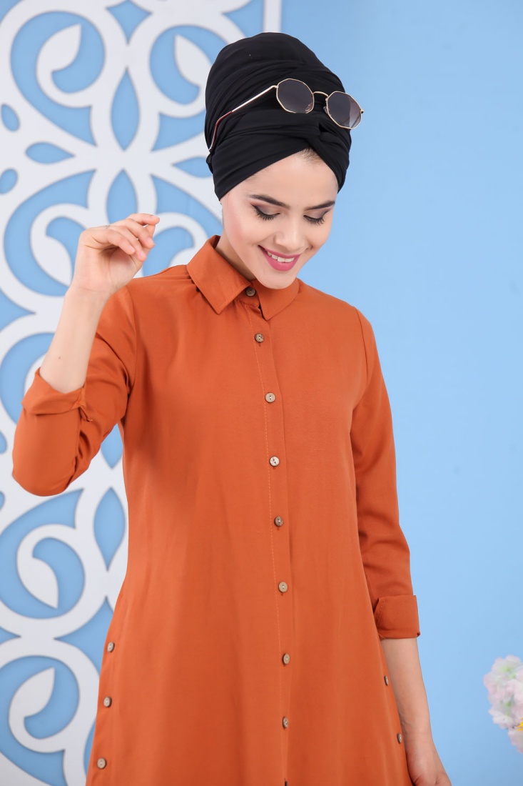 Tunique chemise longue décoration boutons pour femme - Couleur Rouille Vetement & Accessoire