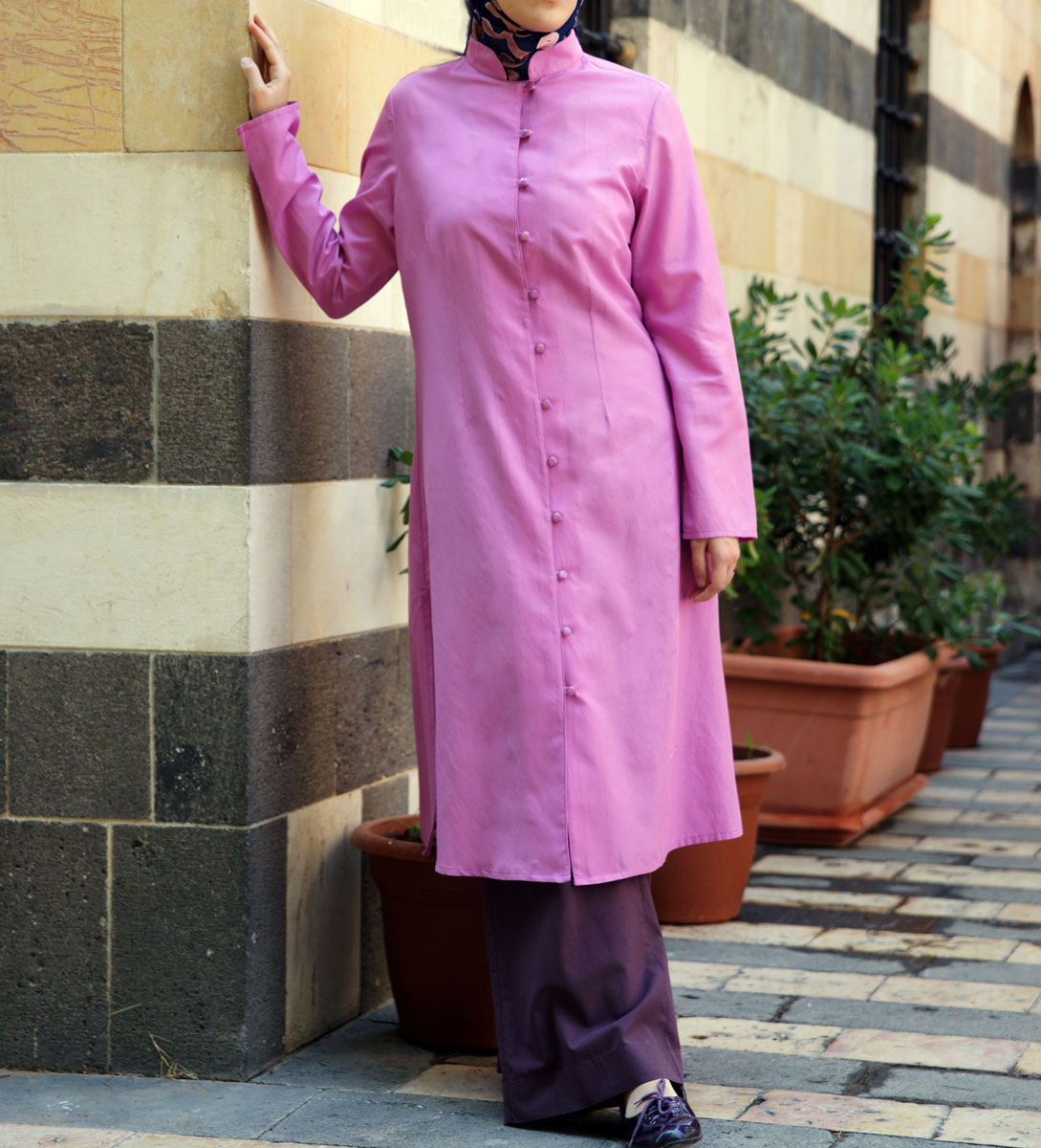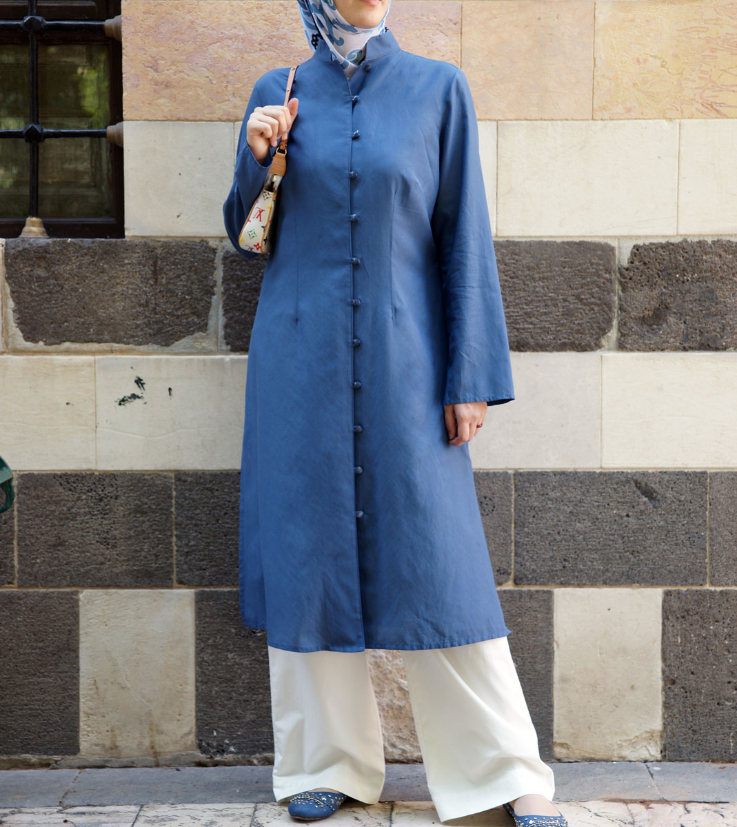 Description: hits mid-calf; open mandarin collar; button and loop opening; long side slits. Imported.