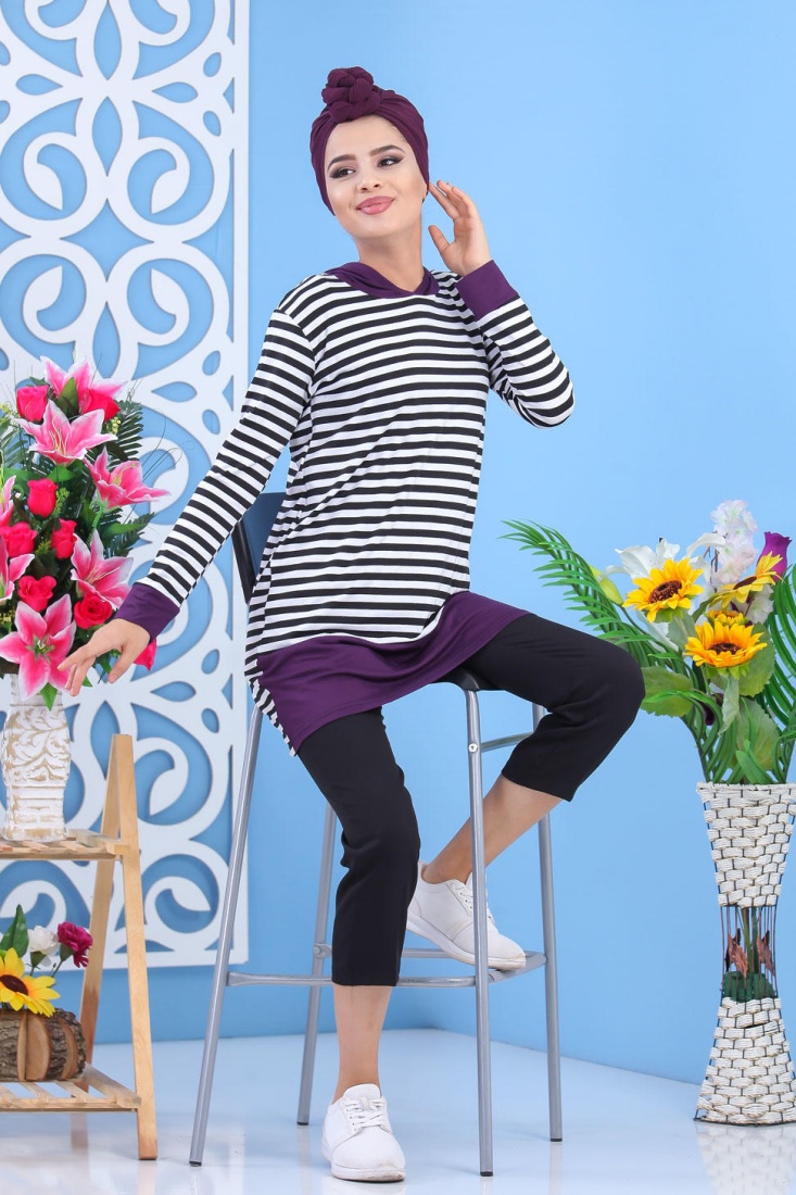 Tunique à rayures, manches longues, capuche, coupe droite, tissu léger. Ce modèle est adapté pour les 4 saisons, sa coupe décontractée vous permettra de le porter quotidiennement.