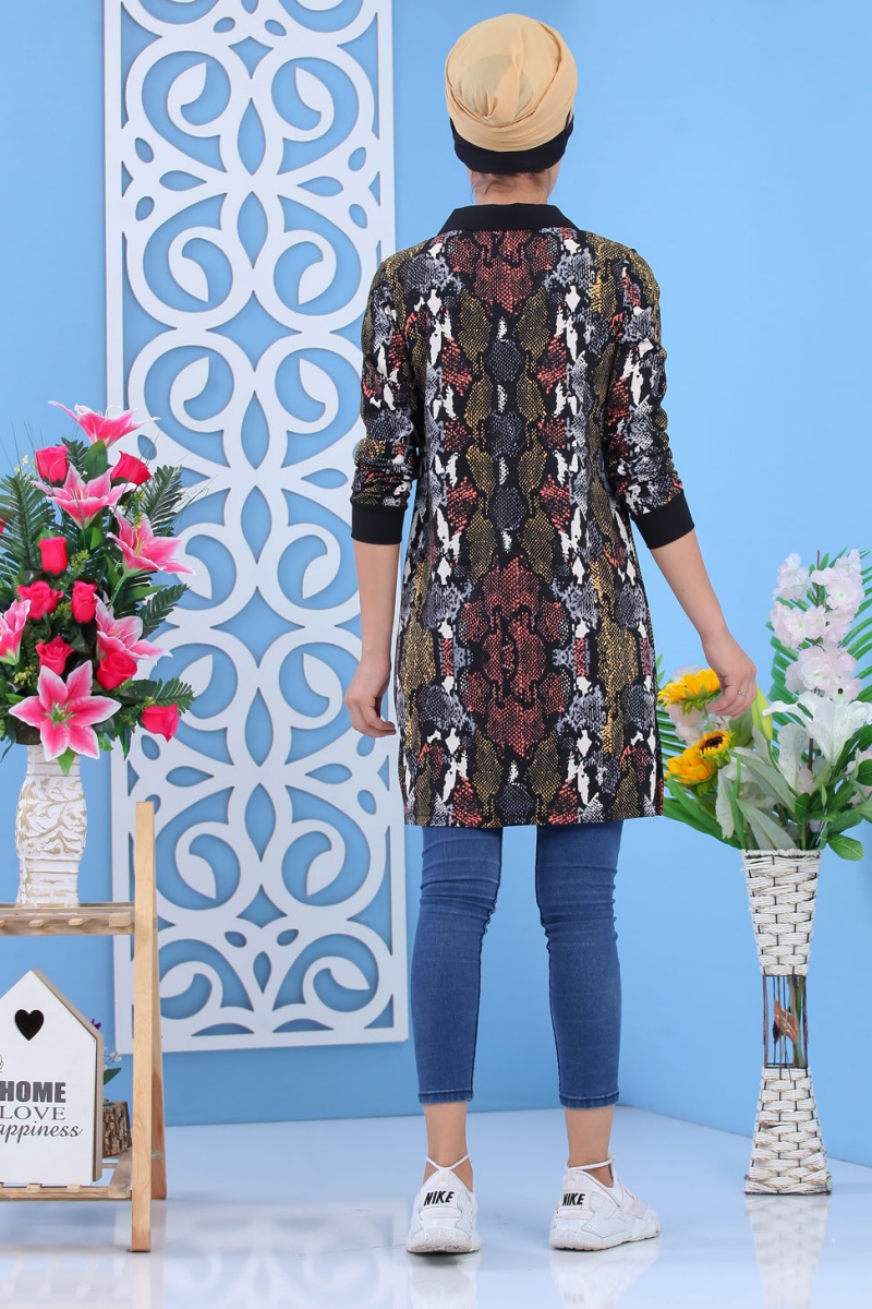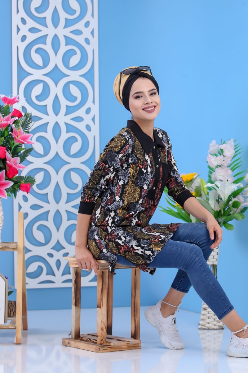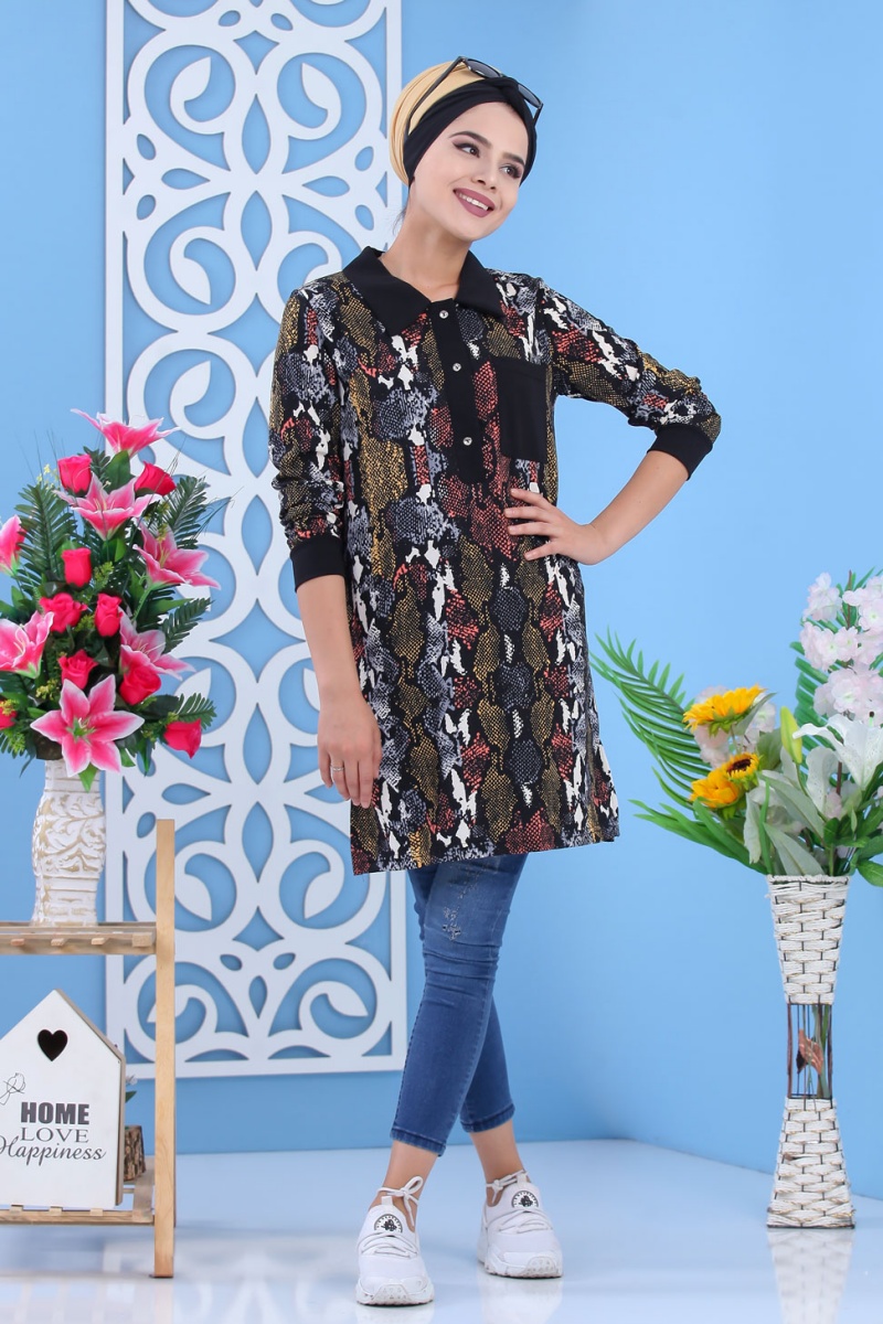 Tunique decontractee a imprimes python et parties noires pour femme