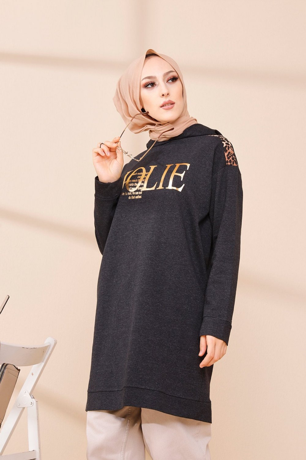 Tunique décontractée ample pour femme type sweat-shirt avec capuche et imprimé doré - Couleur anthracite Vetement & Accessoire