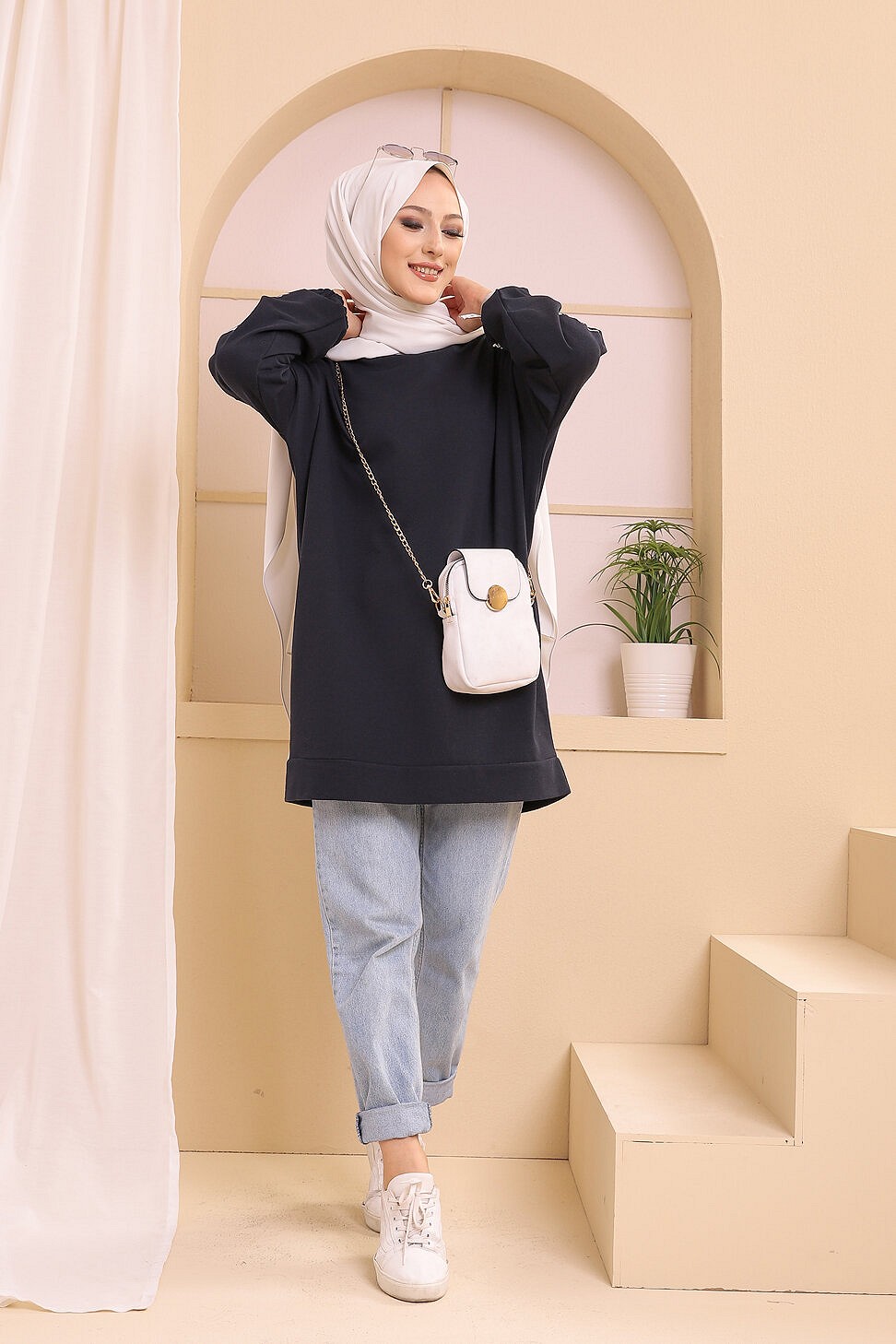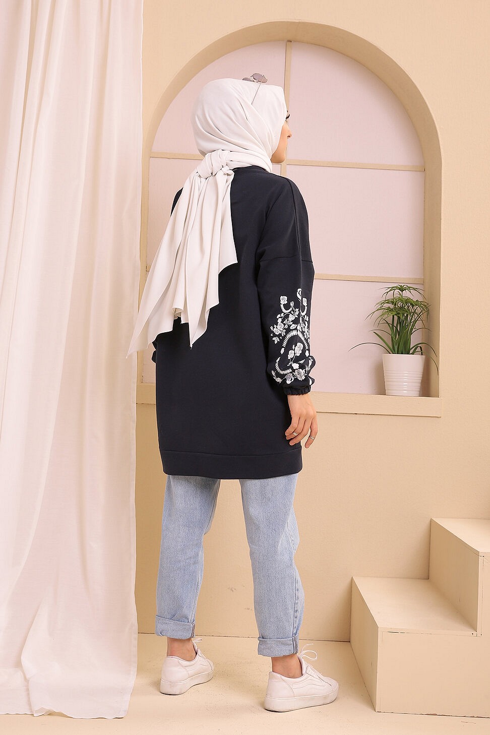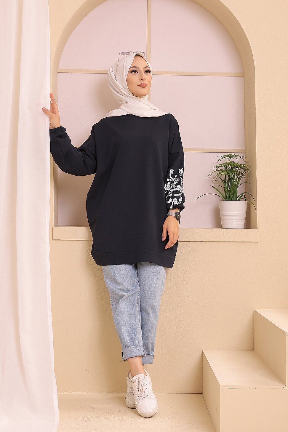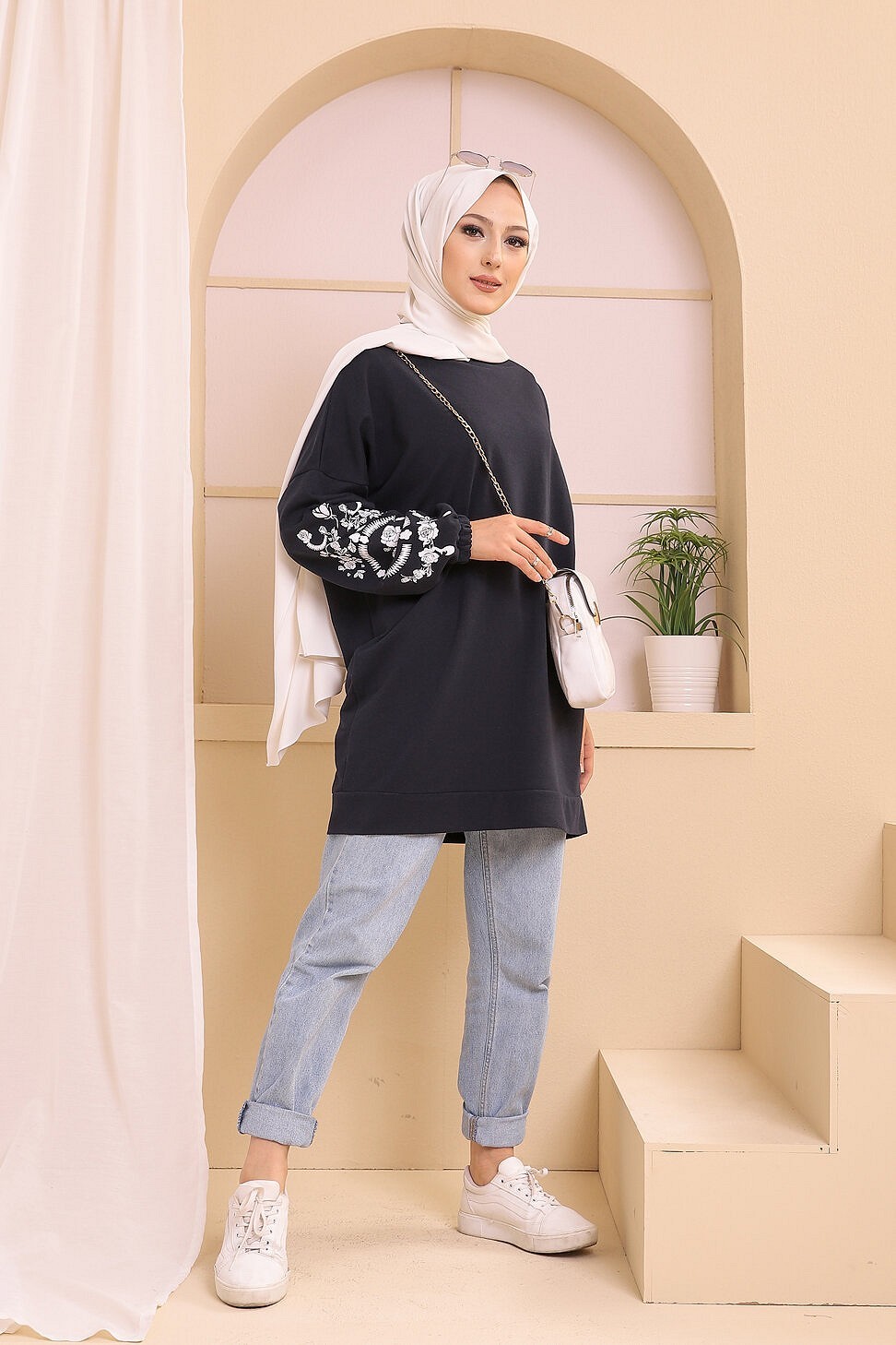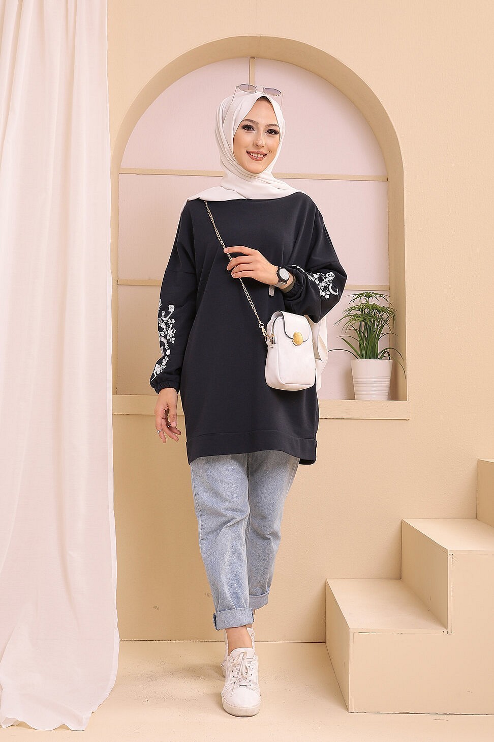 Tunique decontractee avec manches a motif fleurs pour femme (Tenue Hijab moderne) - Couleur bleu marine