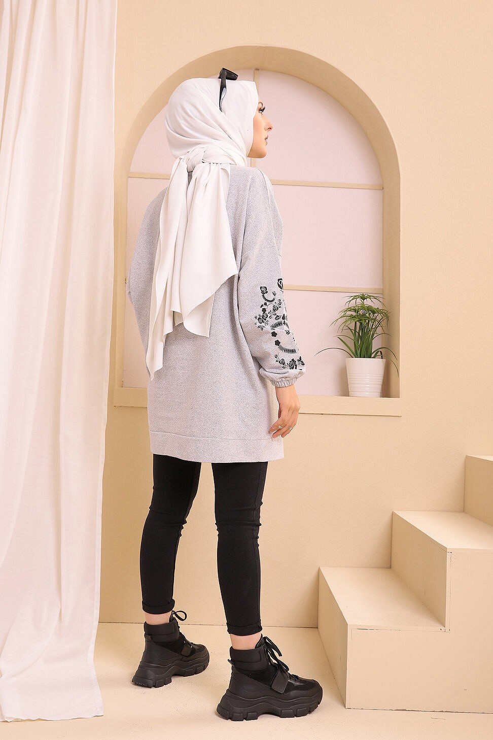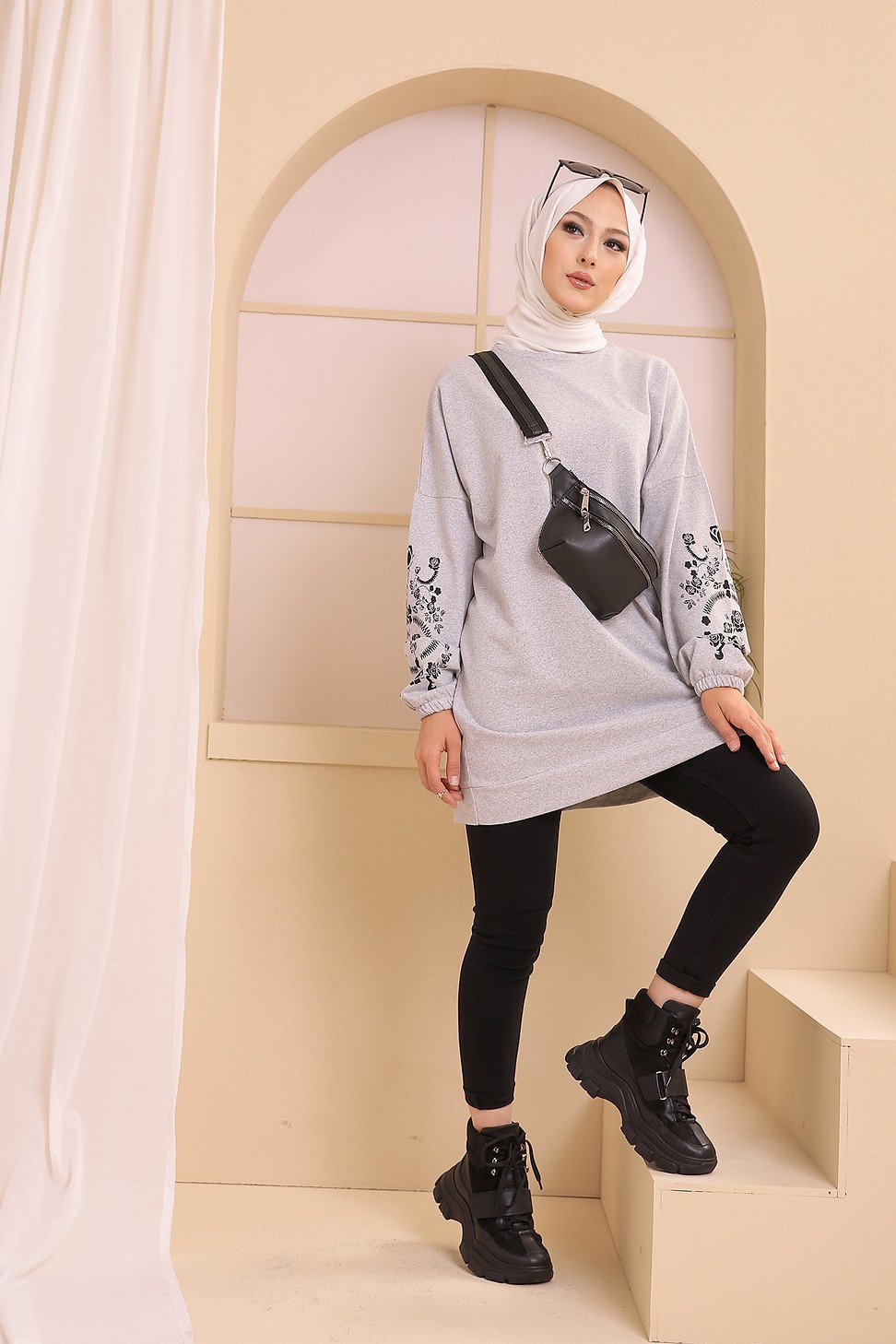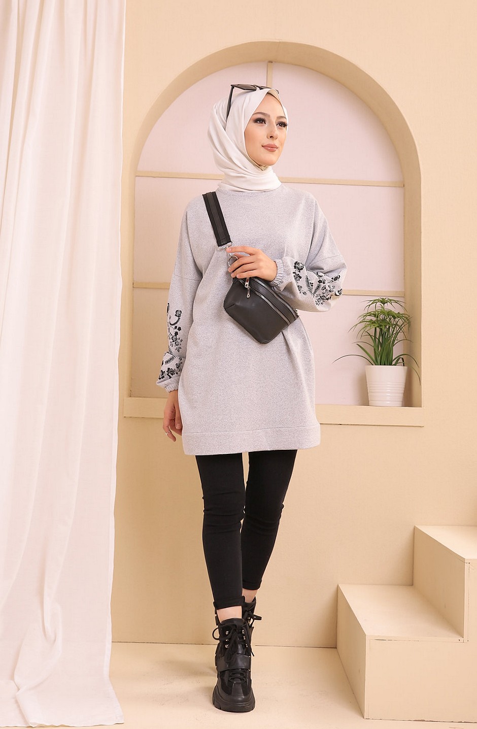Tunique decontractee avec manches a motif fleurs pour femme (Tenue Hijab moderne) - Couleur gris clair