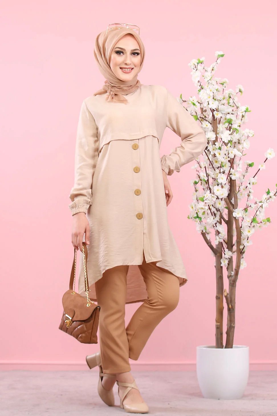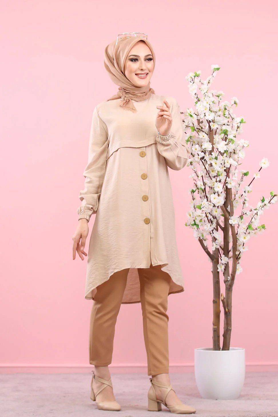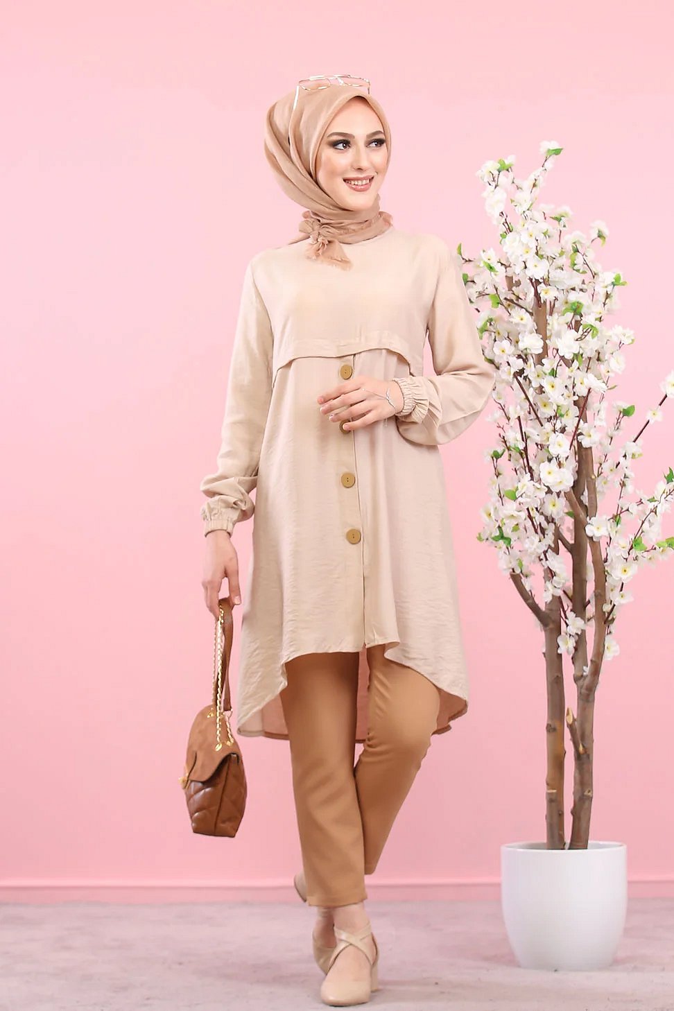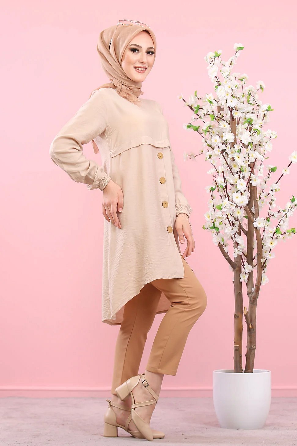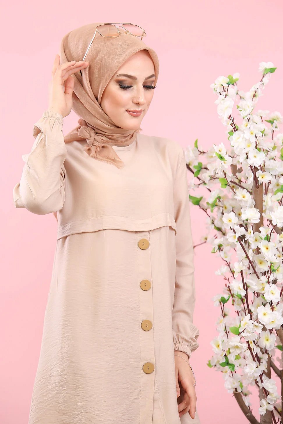 Tunique élégante large boutonnée (Tenue Hijab & Mastour pour femme voilée) - Couleur Beige Vetement & Accessoire