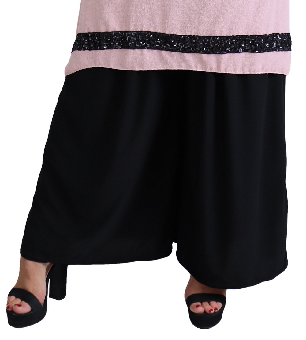 Belle tunique en crêpe léger avec une bande pailletée (strass noirs) sur le bas. Encolure arrondie. Manches longues. Peut se porter aussi bien au quotidien que pour des occasions.
