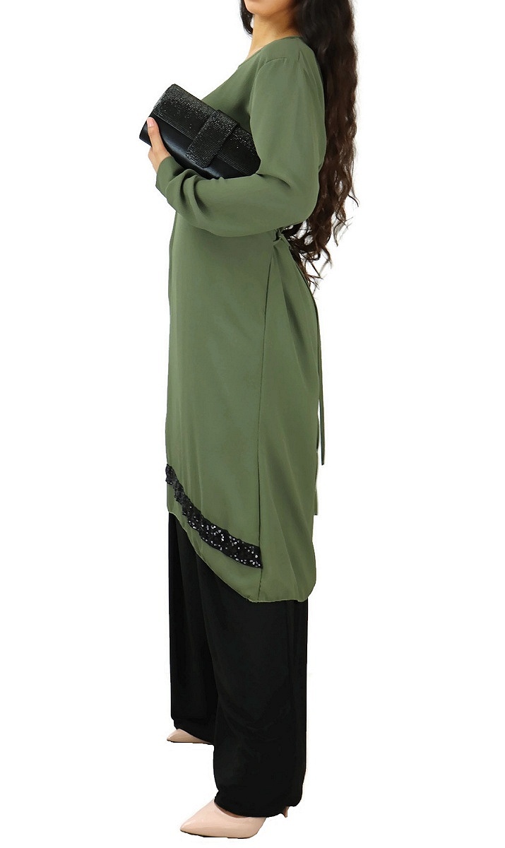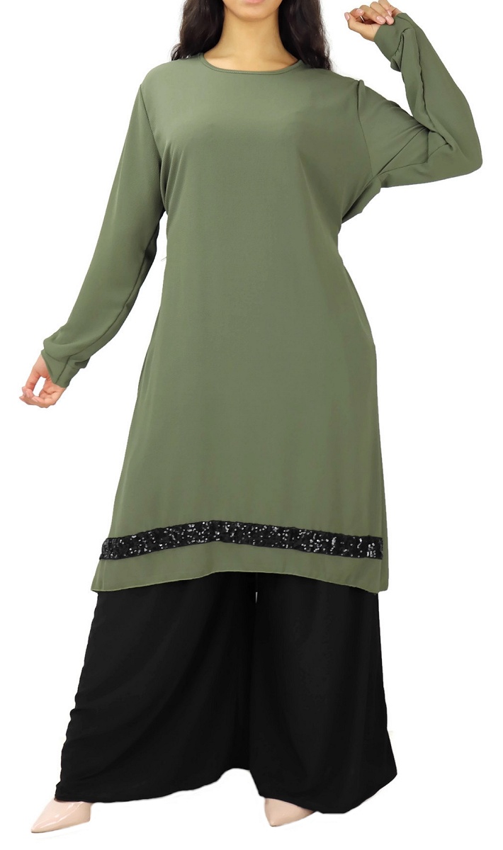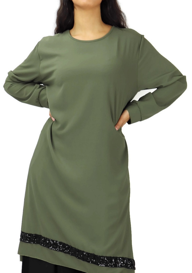 Belle tunique en crêpe léger avec une bande pailletée (strass noirs) sur le bas. Encolure arrondie. Manches longues. Peut se porter aussi bien au quotidien que pour des occasions.