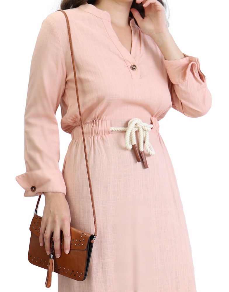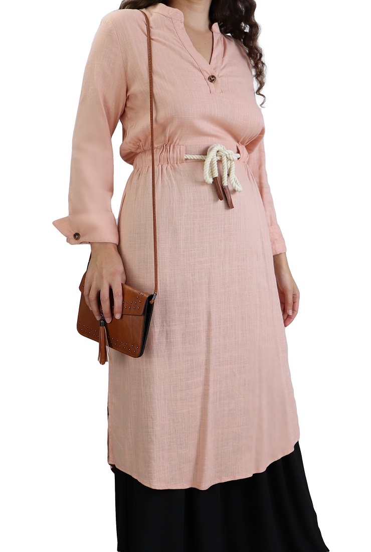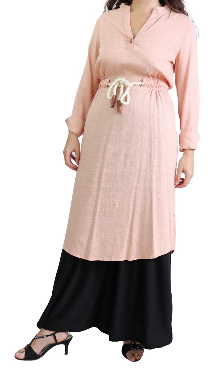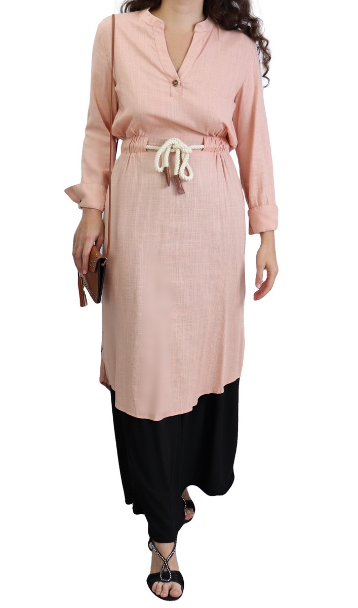 Tunique composée de lin et de coton très agréable à porter. Manches à revers boutonnés, col tunisien ouvert et belle cordelette blanc cassé au niveau de la taille.