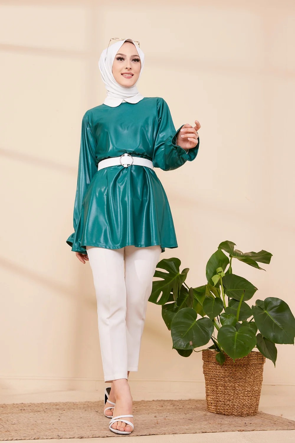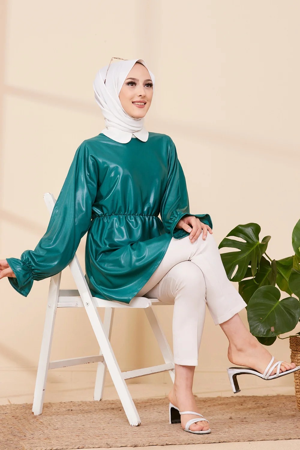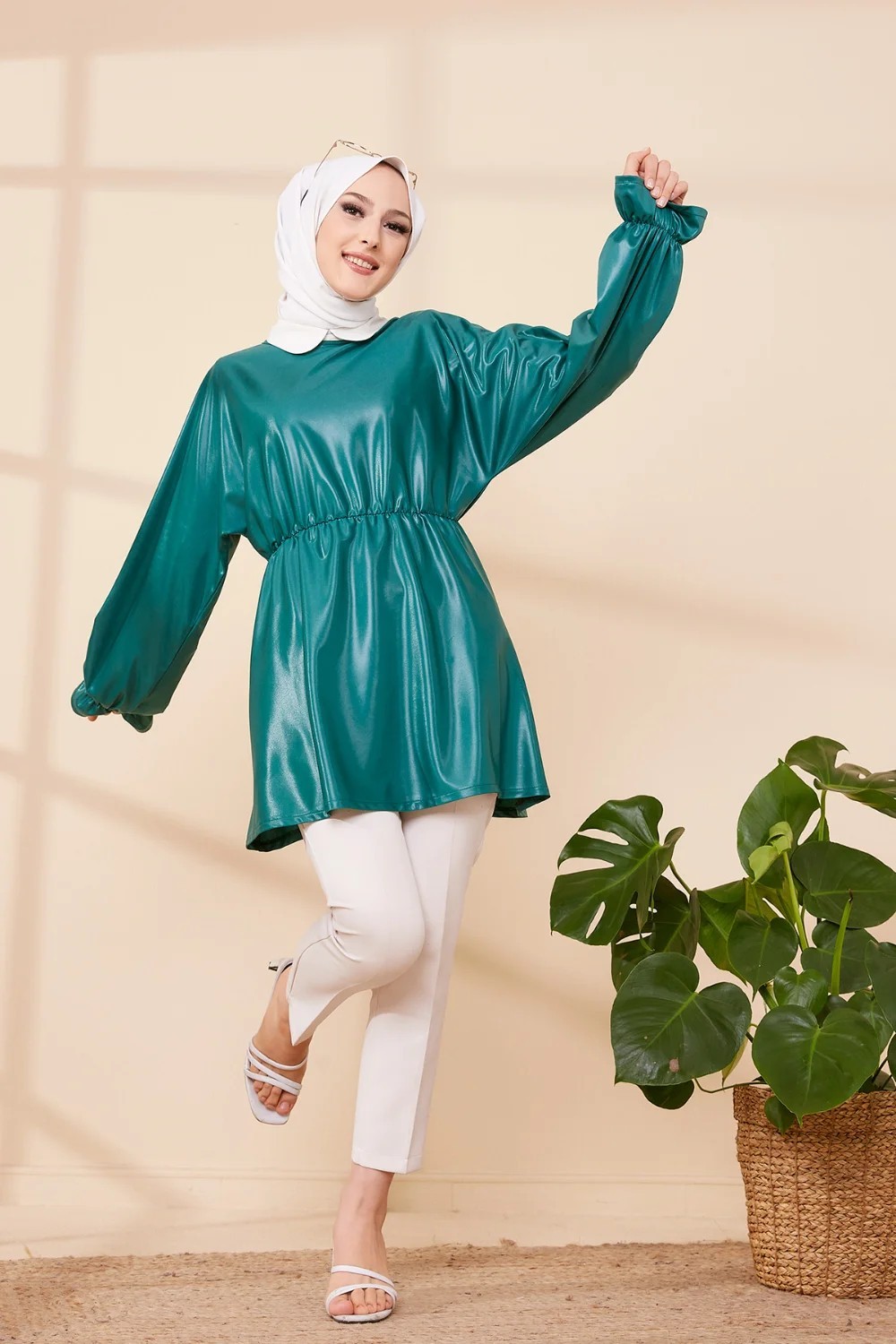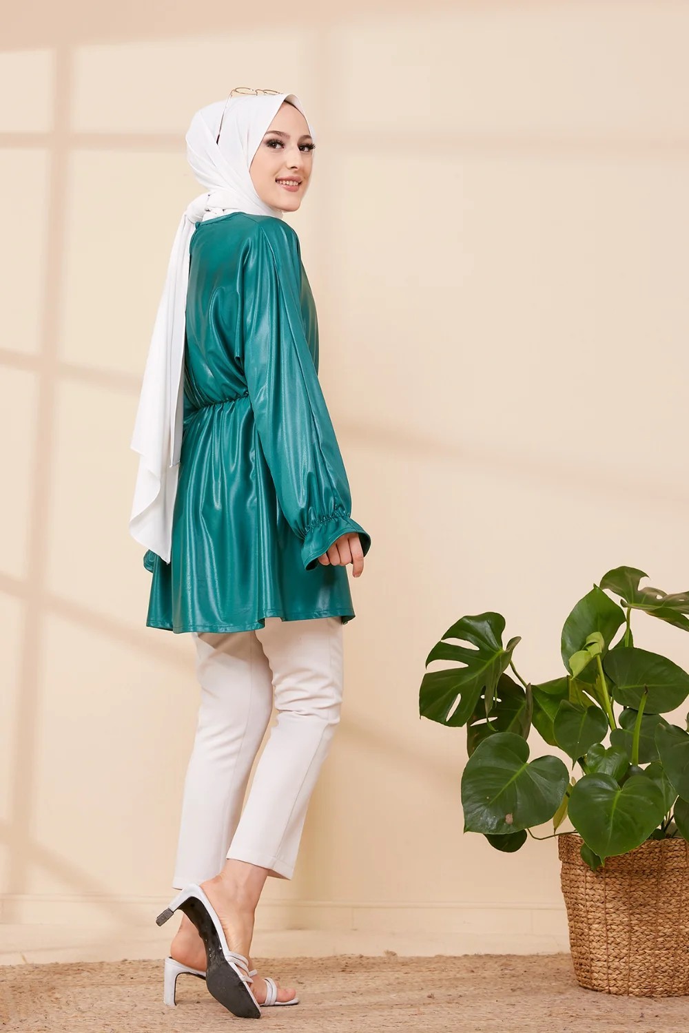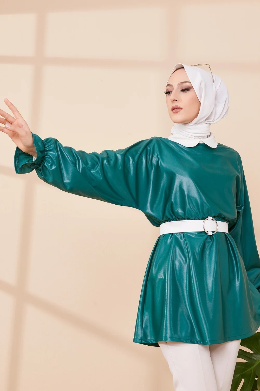Tunique en skaï (simili cuir) pour femme (Tenue chic et moderne pour hijab) - Couleur vert émeraude Vetement & Accessoire