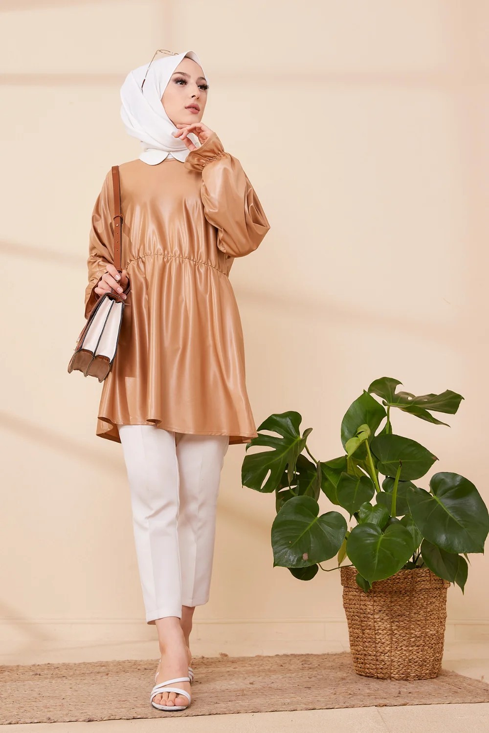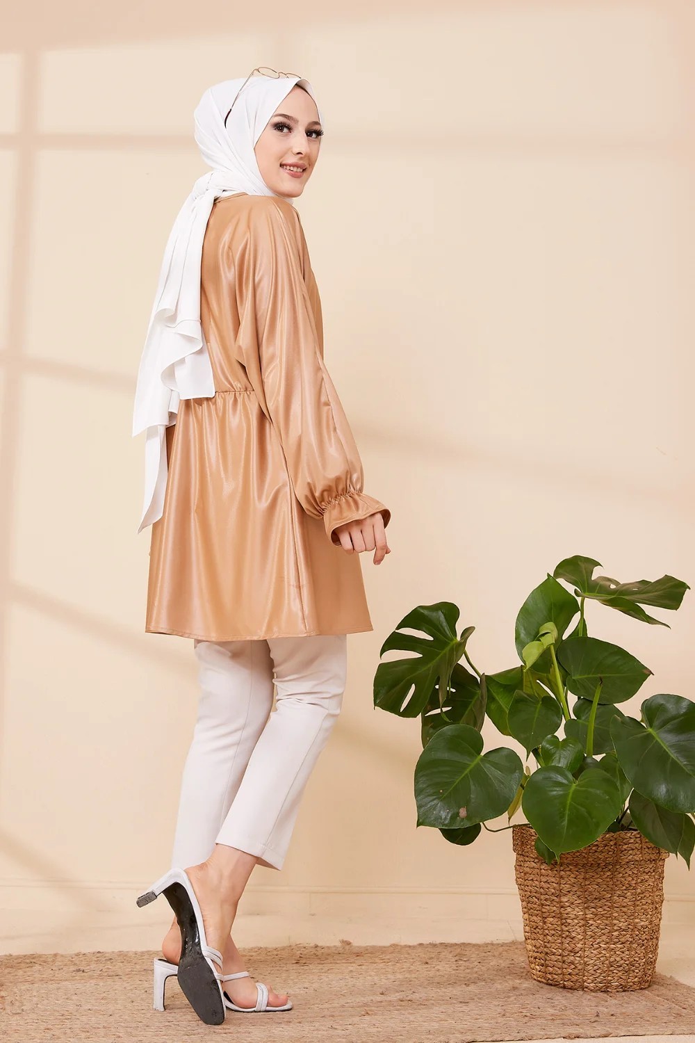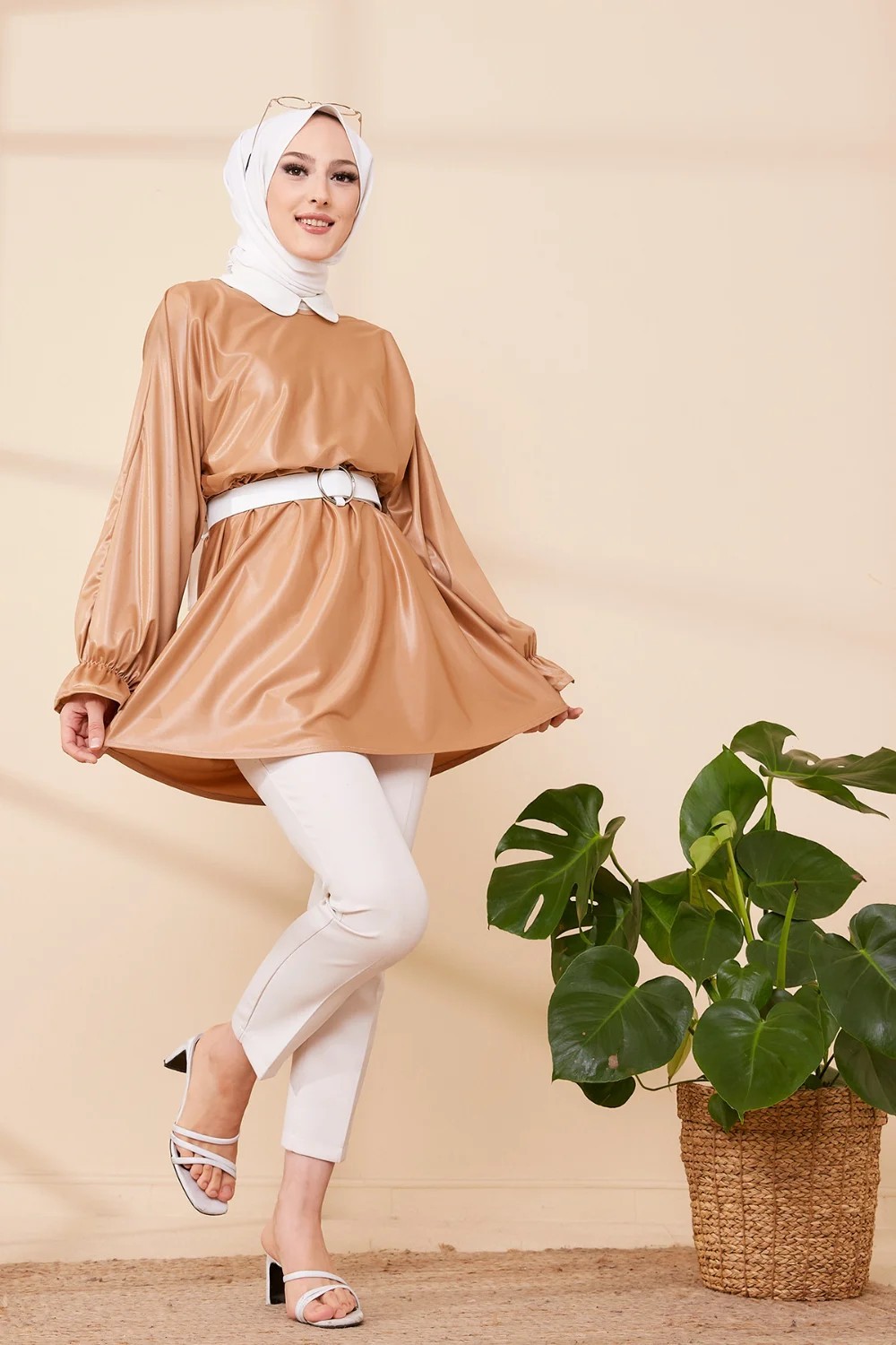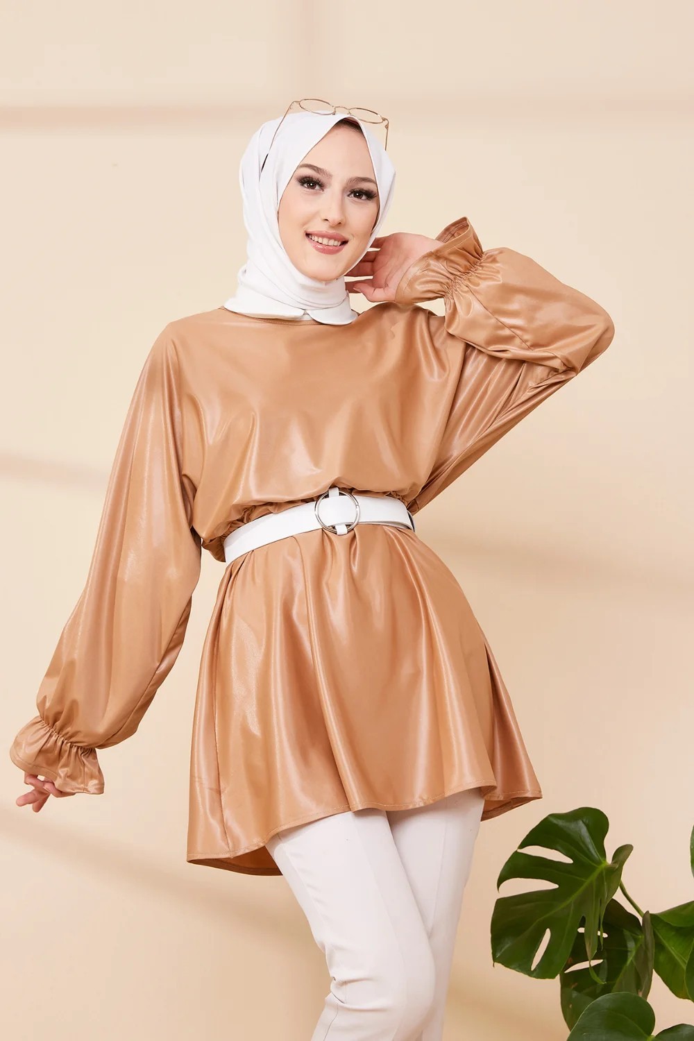 Tunique en skaï (simili cuir) pour femme (Vêtement chic et moderne pour hijab) - Couleur beige foncé Vetement & Accessoire