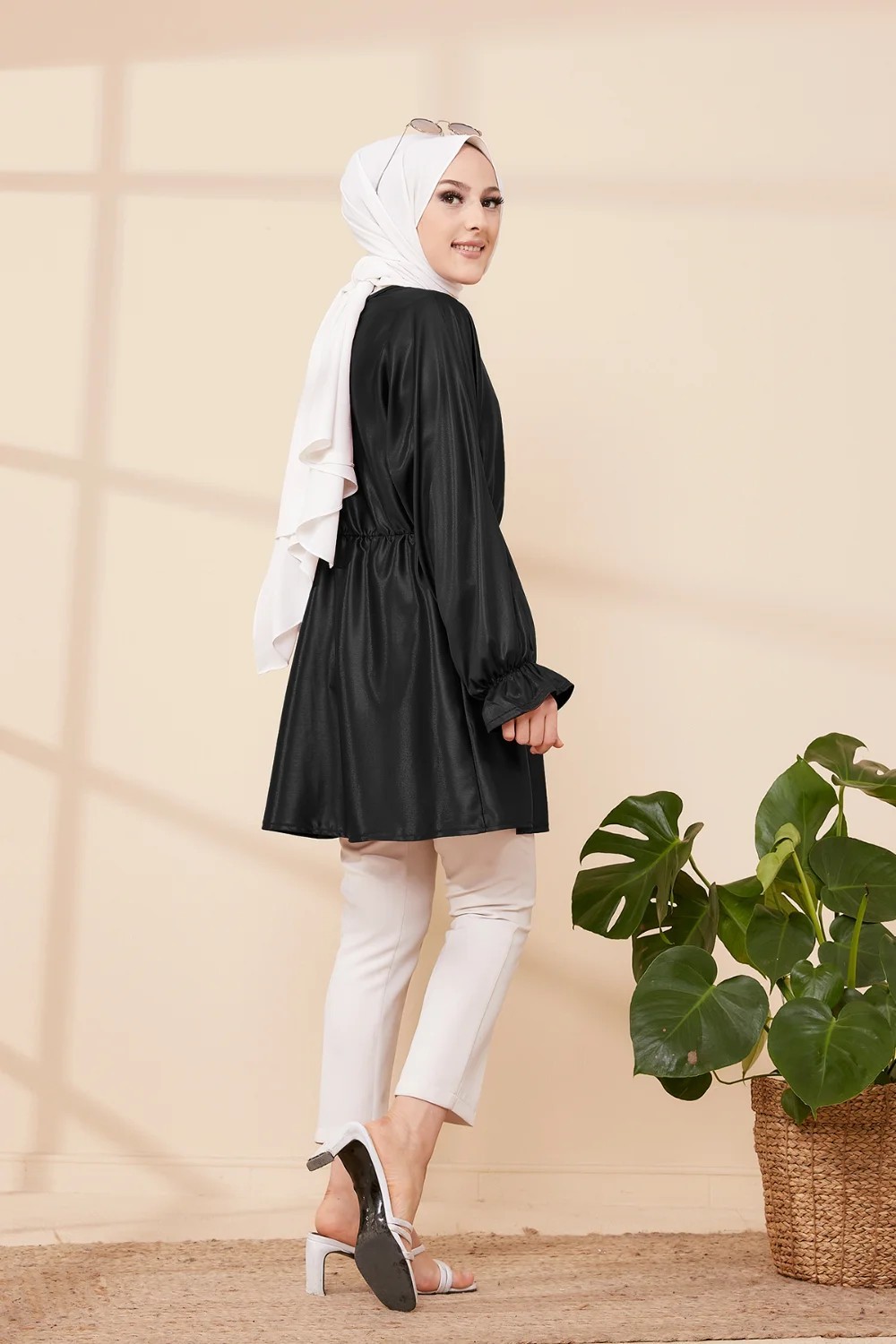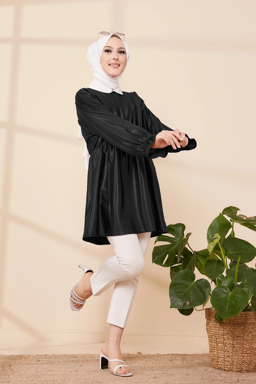 Tunique en skai (simili cuir) pour femme (Vetement moderne pour hijab) - Couleur noir