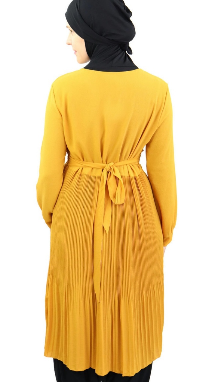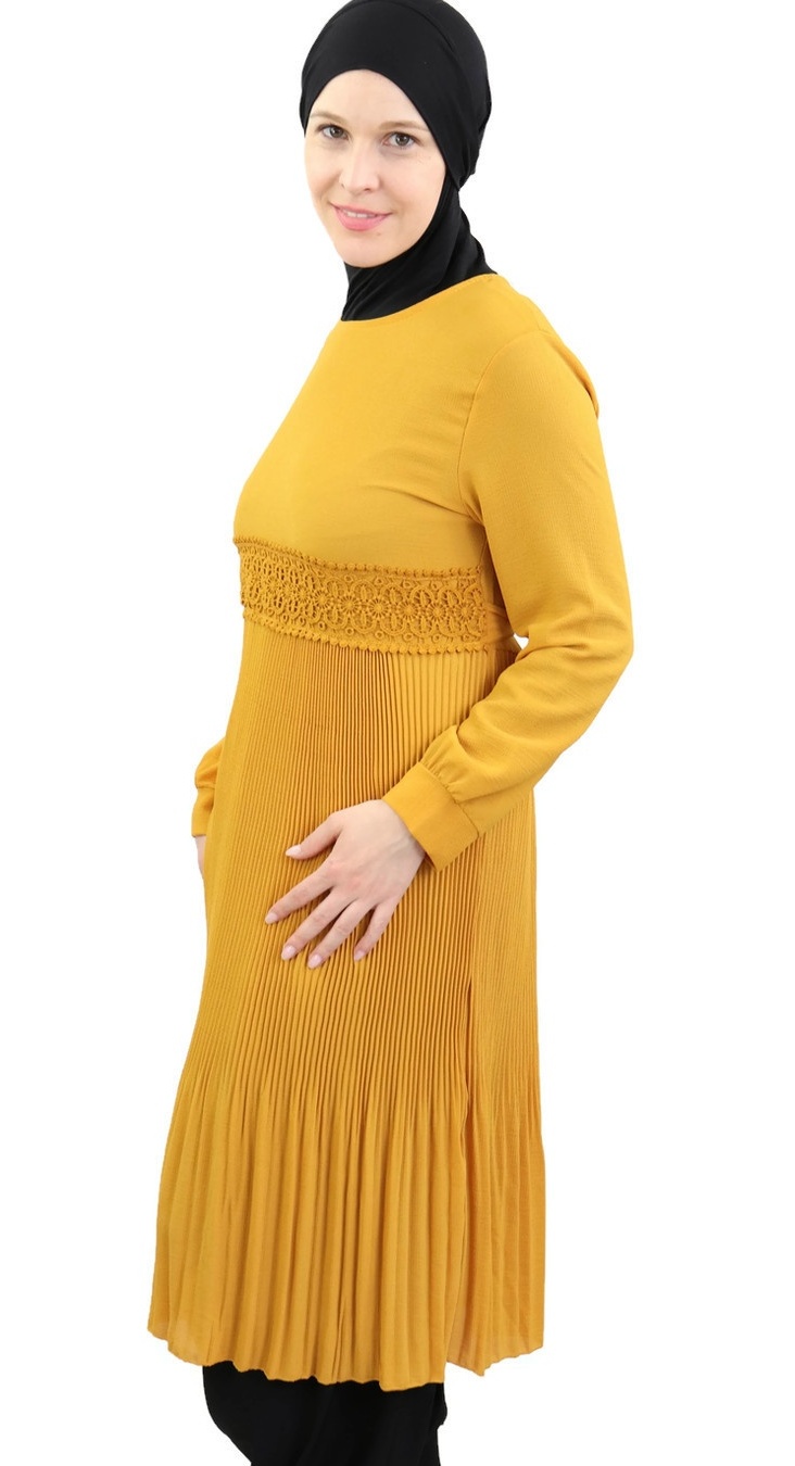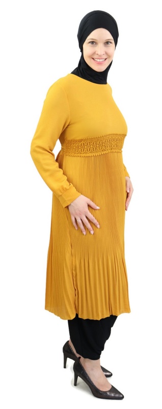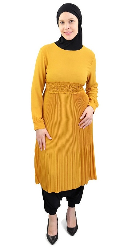 Tunique évasée indémodable en tissu crêpe, plissé en bas, liens de serrage pour créer un effet cintré.