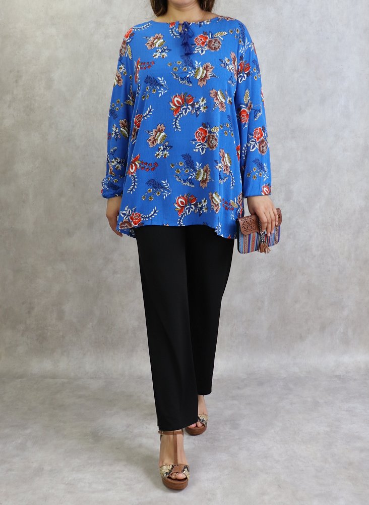 Tunique courte, col dégagé, lien de serrage, manches longues finition élastiques aux poignets. Coupe droite, tissu fluide et léger.