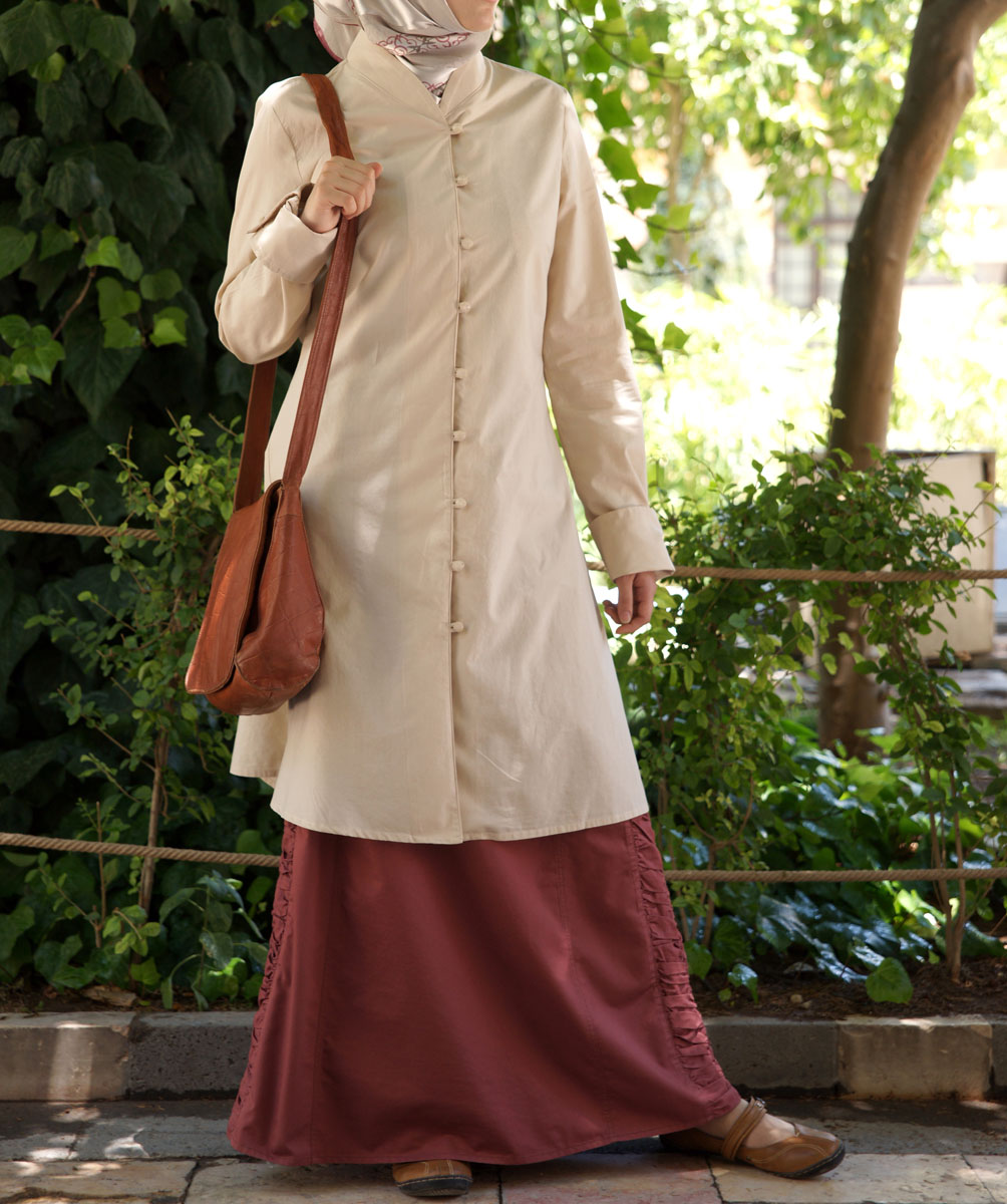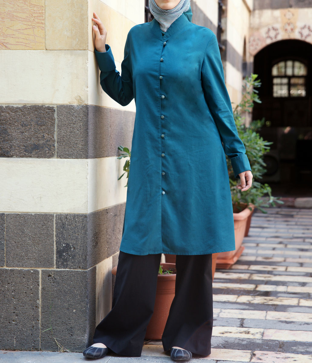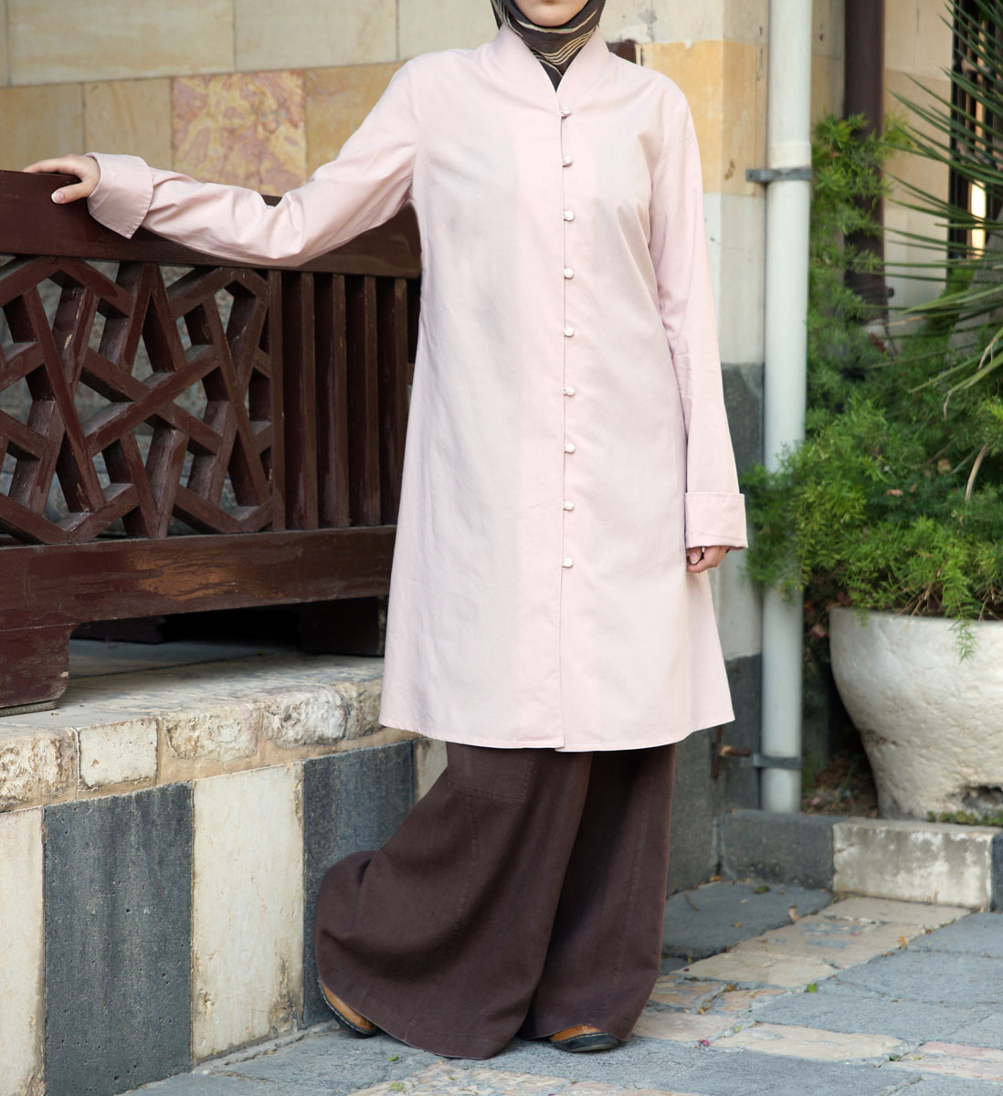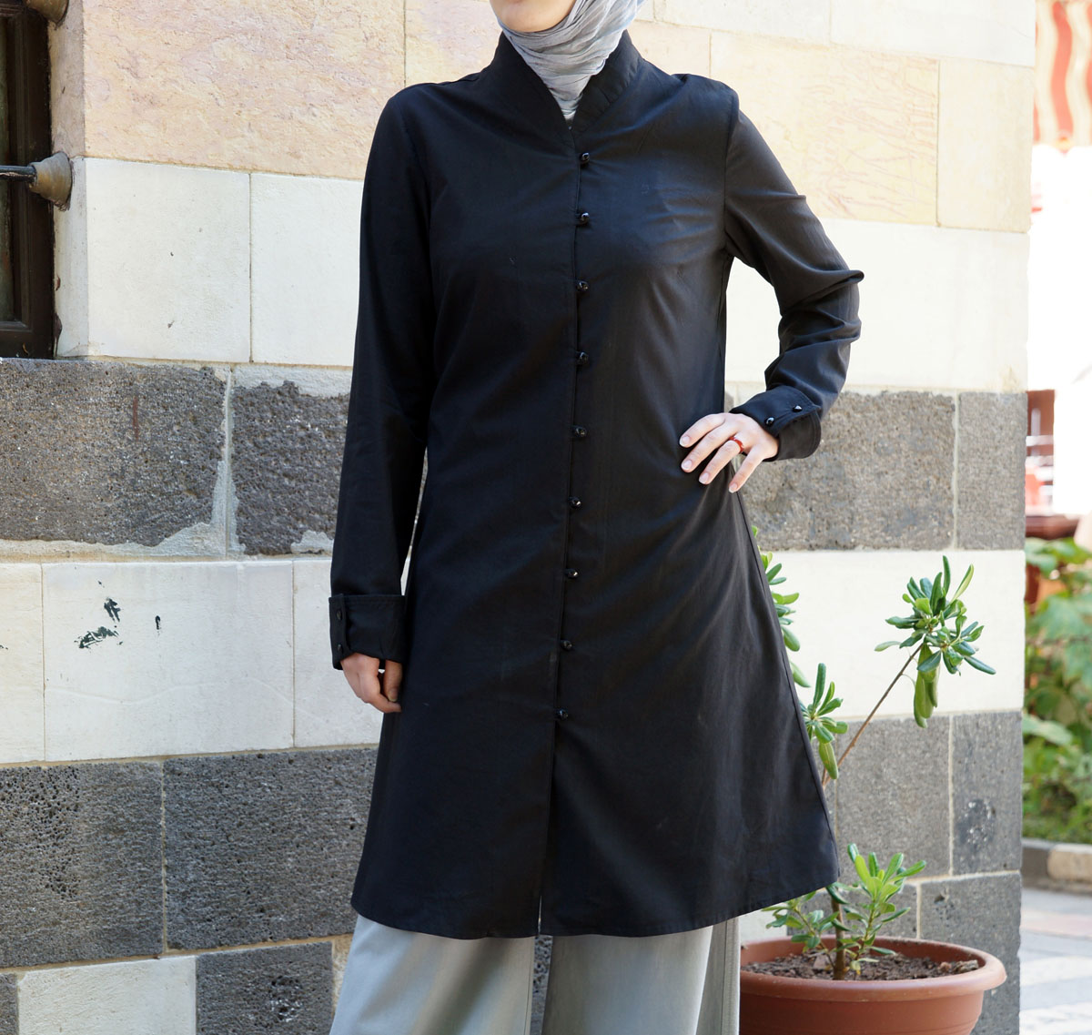 Description: hits knee; v-shaped collar; buttoned opening with self-fabric loops; French cuffs with buttons. Imported.