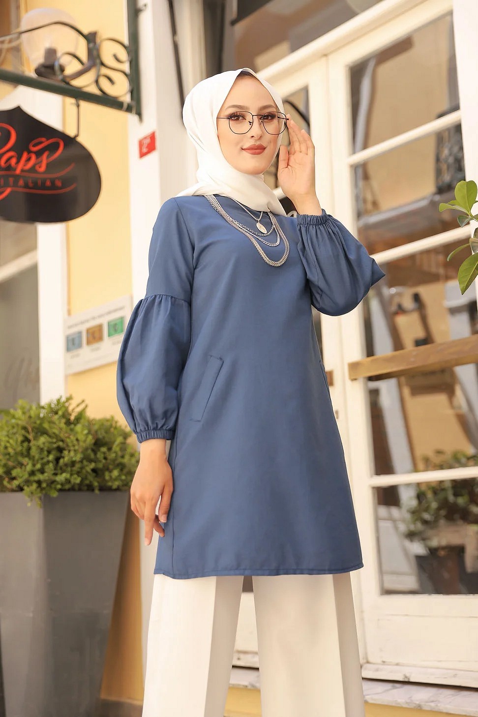 Tunique habillee a manche bouffante pour femme (Vetement de ville pour hijab) - Couleur bleue indigo