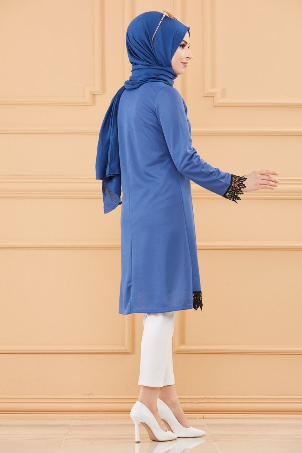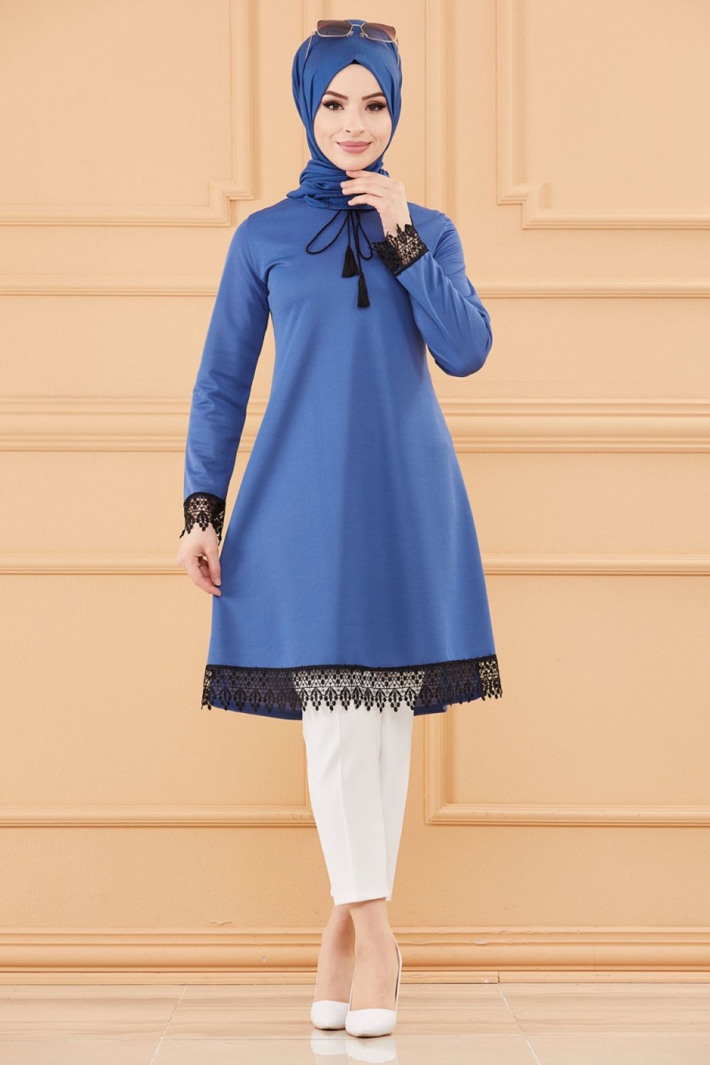 Tunique habillee avec dentelle pour femme (Tenue hijab classique) - Couleur bleu indigo