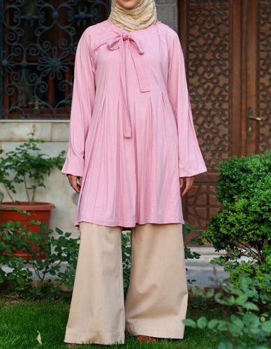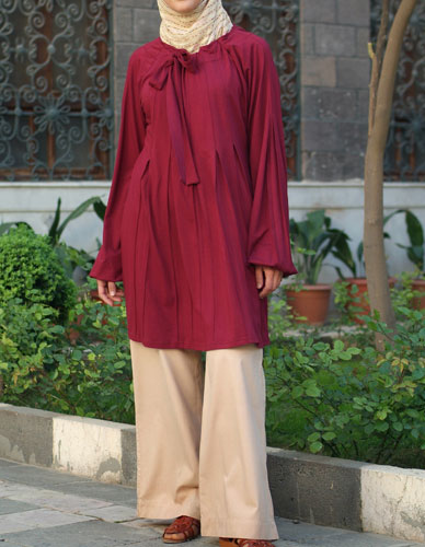 Description: hits short of knee; low round neck opening with neck tie; 5 released pleats on front; released pleat on each arm; raglan style sleeves; elasticized cuffs. Imported.