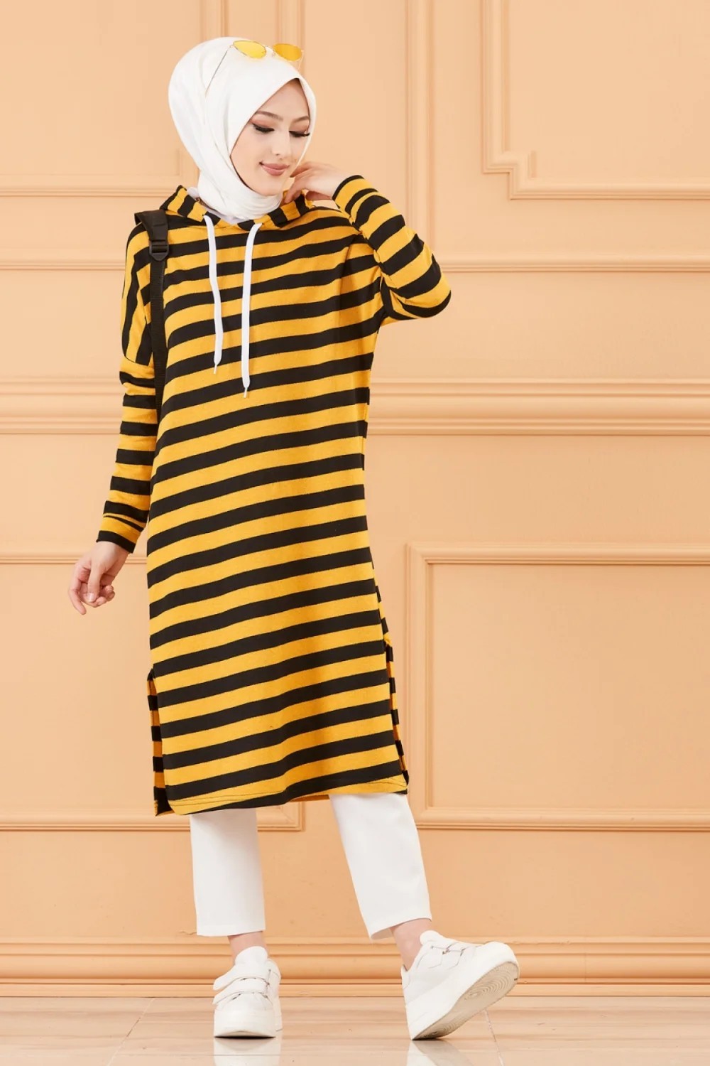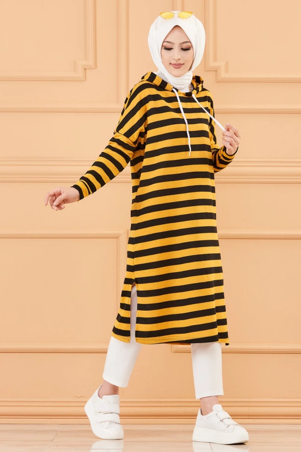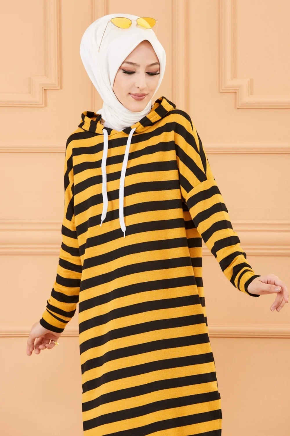 Tunique longue a rayures avec capuche (Tenue decontractee et sport pour hijab) - Couleur moutarde