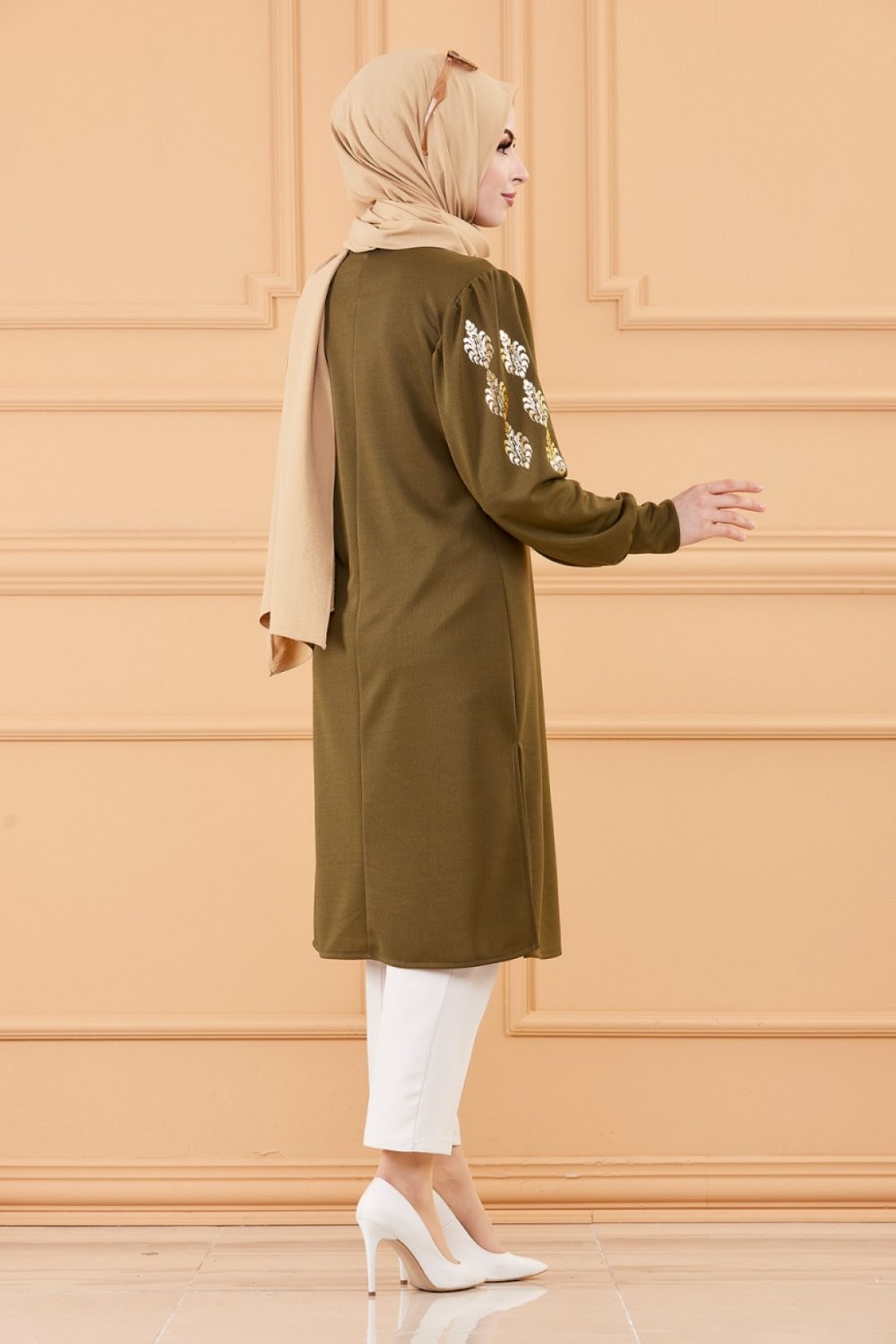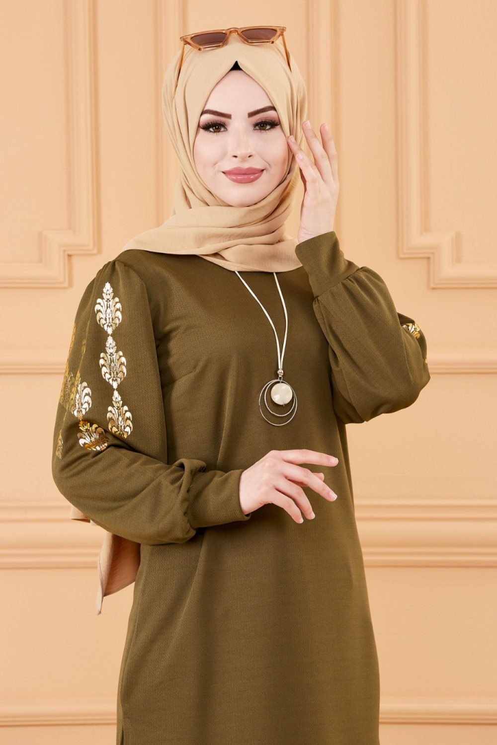 Tunique longue avec dorures (Vêtement hijab turque en ligne) - Couleur kaki Vetement & Accessoire