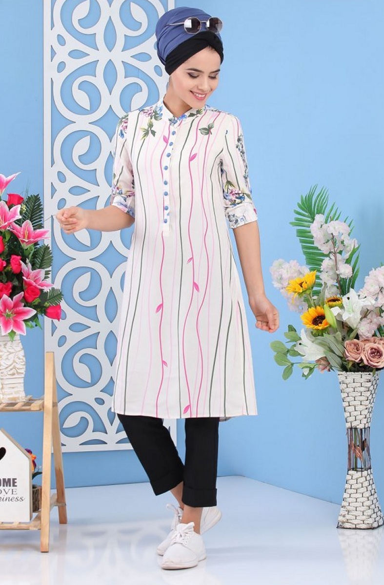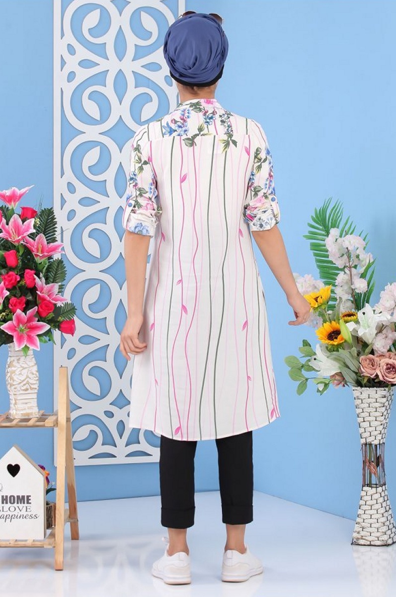 Tunique longue, col Mao fermeture boutons, manches longues retroussables grâce à des pattes boutonnées, coupe droite. Ce modèle au tissu léger aux motifs originaux pourra s'associer avec beaucoup de vos vêtements.