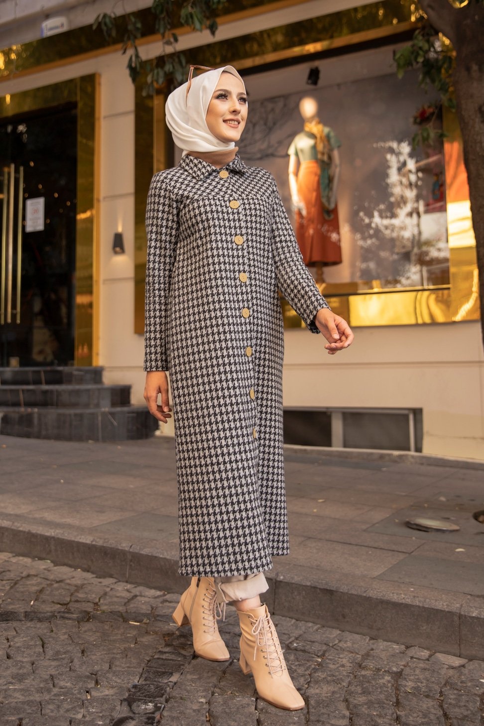 Manteau long femme (Mode Musulmane - Saison automne hiver) - Couleur noir et crème - REF. 34666 (29.00 €)
